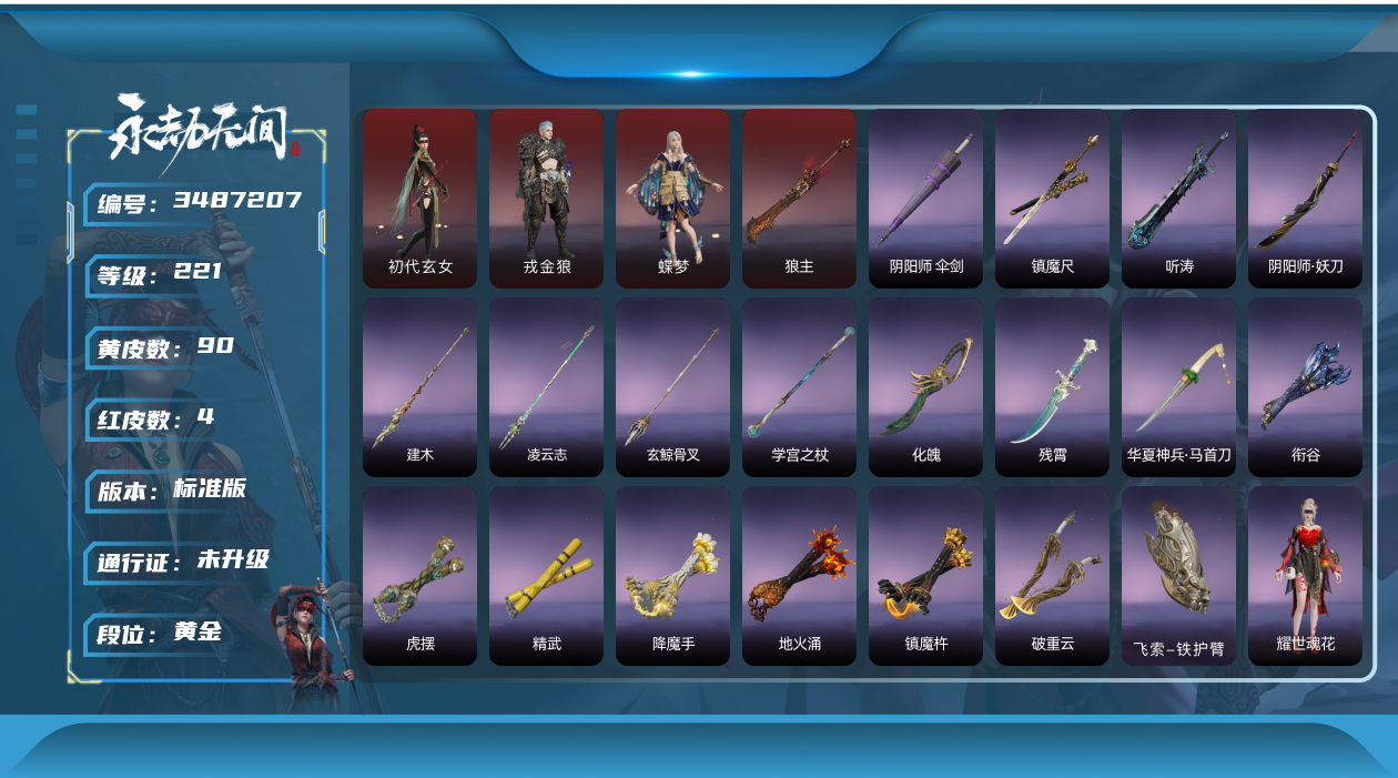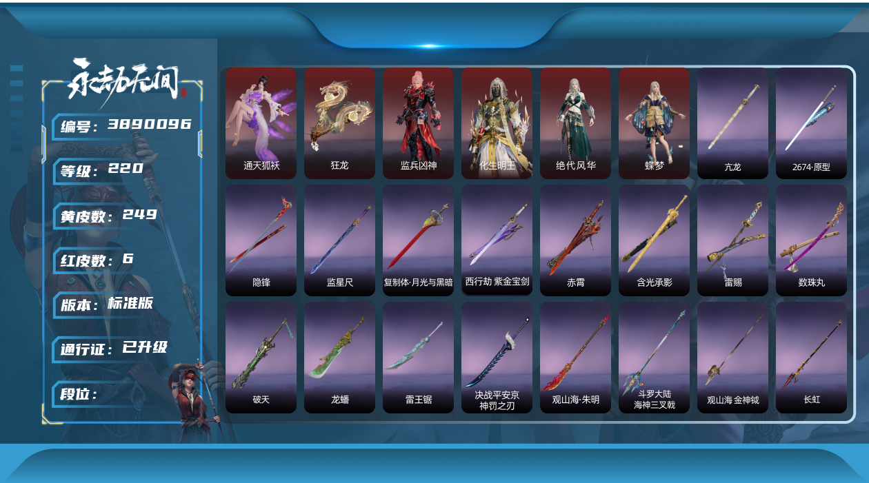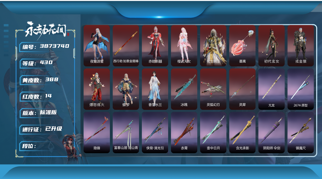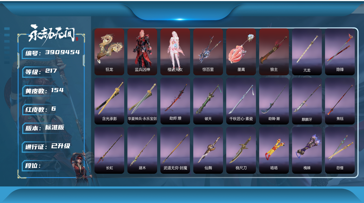 谪星: 0 红皮数: 6 黄皮数: 120 等级: 157 幻丝数: 26628 英雄外观数量: 465 武器外观数量: 142 征神通行证等级: 8 段位: 黄金 游戏id: 54121200080163 收藏值: 108342 账号信息: 征神通行证未解锁,通行证已升级,化生明王,熛怒炼火,泣珠龙纱,沙漠香风,监兵凶神,执明神君,夜华朝,武道无穷·少林,护世四法·多闻天王,孽炎祸斗,游四海,阴阳姬,御宅罗梦,龙之道·至纯,清雅少女,妖刀姬,观山海·文鳐,赤雾烟霞,封神录·申公豹,司天命,瀚海苍鹰,葫芦兄弟·蛤蟆头领,观山海·秋神蓐收,护世四法·持国天王,观山海·冬神玄冥,黄昏巫主,夜绸袍,封神录·姜子牙,雁落笠,粽香远,系云澜,珥冰,武道无穷·明心,桃夭扇,素心流光卷,甲辰龙,瑞火壶,福虎帽,浮元子,智慧兔,日晷仪,知天命,长歌诗韵·琵琶梳,葫芦兄弟·蛤蟆头,观山海·秋金,观山海·冬棱,琉璃火,护世四法·天王印,醉狐银,狐九尾,几何钥,赤金镜,曜石面具,玄天冠,叠嶂宝鉴,封神录·封神榜,簪缨,逆水寒·江海,月丹,【挑染】万仞山,观山海·天刑,流萤,不蛊,古溪,封神录·笼烟芍药,【挑染】玄冥,壶中日月,含光承影,隐锋,烛泪,神龙刀,长虹,建木,焦钰,观山海·金神钺,武道无穷·封魔,桡尺刀,仙舞,曼提柯尔之牙,耀夜流华,,月瞳,精武,嘶风,夔牛槌,破重云,护世四法·螭龙,引冰落,钻山,竹霹雳,凝冰魄,虎踞,仙毫卫青红皮 老虎红皮 大佛红皮