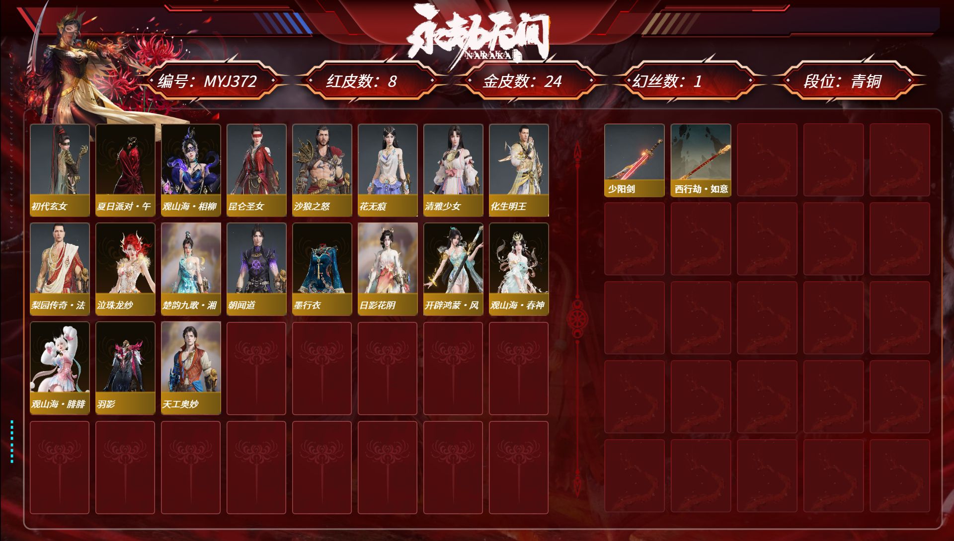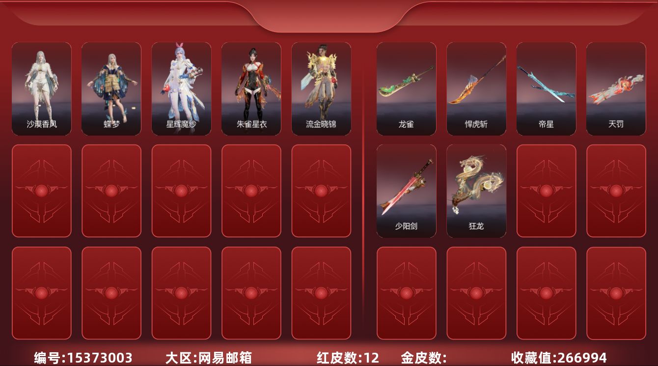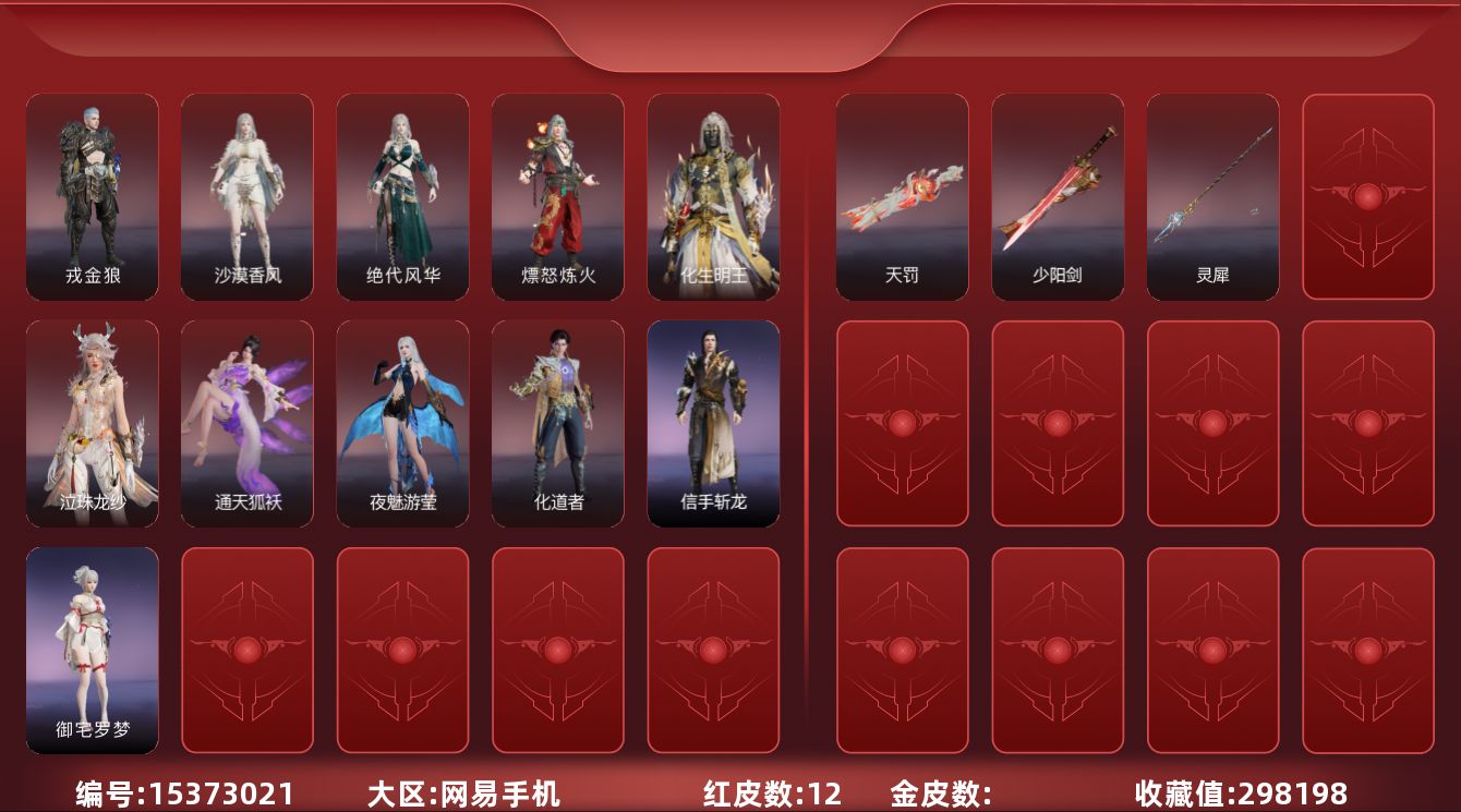 [15375091]yjj1216/2.5换绑/等级268/s19三人蚀月3/12红256金收藏值232516/初代玄女/化生明王/蝶梦/泣珠龙纱/暮光胴丸/沙漠香风/流金晓锦/苍穹之光/少阳剑/帝星/龙雀/飞将戟/:西行劫·蜘蛛精/红川仙子/碧水青天/秋藏桂/p5r·奥村春noir/街头狂欢·涂鸦少女/黑猫警长·警长制服/冬日绮韵·白熊/八宝龙王/甜夜安眠·鹅黄纱梦/新倩女幽魂·瑶光沐月/怪诞狂想·友情岁月/龙之影·龙虎斗/追猎/康复之星/不良人·李星云/长歌诗韵·鹧鸪天/狩猎都市·紫藤神子/洛天依·星空投影/p5r·芳泽霞violet/御宅罗梦/清雅少女/贵胄少女/狩猎都市·暗夜利刃/决战平安京·御神之刃/妖刀姬/汐泪/蛰龙吟/龙之道·无拘/煦阳漫叙/倒反阴阳·铁面/西行劫·杨戬/百战·破荆者/弘毅袍/华夏宝甲·汉光/龙之影·过江龙/p5r·雨宫莲joker/禄运玉霄/紫微星命/烈武者/击浪/倾国倾城·闭月/倒反阴阳·凛冬/浣烟纱/福瑞天泽/观山海·秋神蓐收/西行劫·悟空/冬无归/炽火照夜/观山海·冬神玄冥/倾国倾城·羞花/春不敛/赤阳天狐/梨园传奇·丽娘/卷王/不良人·女帝/长歌诗韵·念奴娇/怦然心动·热力节拍/虹猫蓝兔七侠传·虹猫/孤影戎装/夏日派对·逐浪砂阳/天虹咏/春日序曲·协光/开辟鸿蒙·日月明/雪铃绮歌/虹猫蓝兔七侠传·蓝兔/长歌诗韵·如梦令/斩神·林七夜/狩猎都市·雷行猎手/发型金色皮肤:(挑染)泠川发/p5r·noir发型发/九州遗珍·春桃发/甜夜安眠·暖绒发/音浪震荡·顽骨发/逆水寒·江海发/烈火发/不良人·三圣涅发/(挑染)水仙发/p5r·violet发型发/狩猎都市·归宁发/赤滔发/倒反阴阳·铭誓发/p5r·joker发型发/(挑染)代号·冷萃发/排霜发/铸神·自慢发/观山海·天刑发/(挑染)宵烛发/鹤发/惊雀发/秀逸发/长歌诗韵·豪杰发/不良人·巾帼发/鹤姿发/蜜语发/(挑染)牵云霞发/虹猫蓝兔七侠传·蓝发/长歌诗韵·沉醉发/狩猎都市·迅猛发/斩神·炽羽尘光发/武器金色皮肤:惊火弦/穿云燕/冬日序曲·雪野巡礼/沉默审判/戏祥云/雪国礼炮/兔华笼/狩猎都市·脉冲银颚/丹鹤/虎踞/乌木弓/逆逢/腥红之月/莲心剑雨/炎魔/玄铜飞军/翠影/醒狮/2674·原型/不良人·龙泉剑/虹猫蓝兔七侠传·长虹剑/财神剑/含光承影/醉花风/切影/残阳/鎏金勺/破劫·诛神之刃/雷赐
