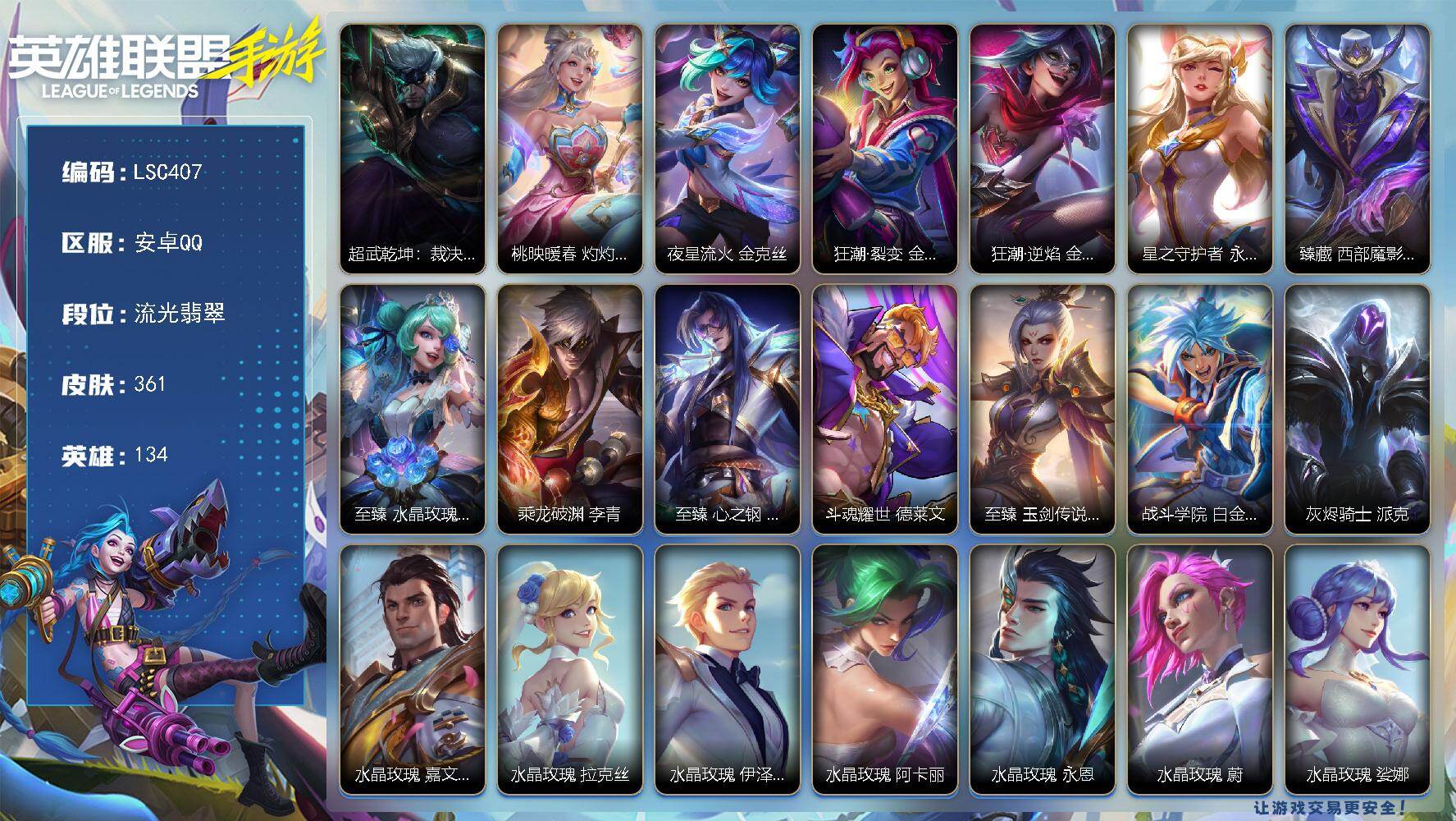 【lsc407】134英雄/361皮肤/1典藏/12神话/53传说/188史诗/流光翡翠/超武乾坤:裁决/桃映暖春灼灼芳菲拉克丝/夜星流火 金克丝/狂潮·裂变 金克丝/狂潮·逆焰 金克丝/星之守护者阿狸永绽盛芒/臻藏西部魔影卢锡安/至臻 水晶玫瑰 格温/乘龙破渊李青/至臻心之钢永恩/斗魂耀世德莱文/至臻 玉剑传说 武剑仙 锐雯/战斗学院白金学长伊泽瑞尔/灰烬骑士派克/水晶玫瑰皇子/水晶玫瑰 拉