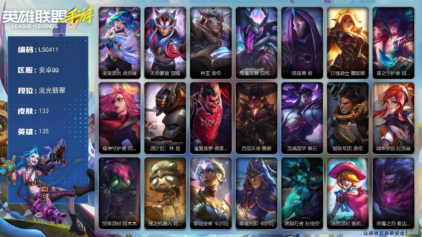 【lsc411】135英雄/133皮肤/2神话/10传说/56史诗/流光翡翠/夜星流火 金克丝/天命豪赌 瑟提/神王 盖伦/海魔至尊 亚托克斯/暗星尊 烬/日蚀骑士 蕾欧娜/星之守护者 陨 洛/福牛守护者 厄运小姐/源计划:林 易/灌篮高手 德莱厄斯/西部天使 赛娜/灵魂莲华 锤石/钢铁军团 盖伦/战斗学院 拉克丝/惊悚派对 阿木木/殇之机器人 阿木木/黎明使者 卡尔玛/星域先知 卡尔玛/地狱行者 孙悟空/泳池派对 奥莉安娜/恶魔之刃 泰达米尔/霸天异形 卡兹克/暗星 卡兹克/圣诞老人 布隆/礼物选好了吗? 布隆/腥红之月 烬/源计划:暗影 阿卡丽/福牛守护者 菲奥娜/福牛守护者 安妮/源计划:风 亚索/战场之王 亚索/k/da all out 阿狸/死亡誓约 劫/欧米伽小队 魔鬼伞兵 崔丝塔娜/小恶魔 崔丝塔娜/大魔王 提莫/小蜜蜂 提莫/招财进宝 提莫/电玩女神 娑娜/炼狱魔女 蔚/源代码 卡蜜尔/魔女 卡蜜尔/星域审判官 卡蜜尔/暗星 嘉文四世/福牛守护者 嘉文四世/盗梦者 内瑟斯/玉剑传说 无极 易/福牛守护者 德莱厄斯/禁卫机甲 格雷福斯/破败军团 德莱文/冰川巨兽 墨菲特/暗星 墨菲特/绒毛 菲兹/欧米伽小队 鬼影蛙人 菲兹/战场之王 吉格斯/奥术大师 吉格斯/玉剑传说 武剑仙 锐雯/白色死神 韦鲁斯/暗星 韦鲁斯/玉剑传说 舞剑仙 艾瑞莉娅/西部天使 艾瑞莉娅/光明哨兵 艾瑞莉娅/源代码 索拉卡/霸天战鹰 加里奥/天启骑士 杰斯/踏春来 凯特琳/未来战士 慎/欧米伽小队 天雷爆破手 维迦/怨之砂 派克/s1光耀之刃/s2光耀之芒/s3光耀之灵/s4光耀之心/s5绯金魅影/s6绯金丽刃/s7绯金战斧/s8绯金鮫灵/s9王牌舰长/s10王牌上将/s11王牌勇将/s11王牌司令/s12龙冕先锋/s13龙冕御盾/s14龙冕神策/s15龙冕异士/s17冠翎御风使/s18冠翎巨神像/s19冠翎征服者/暗黑武士 雷恩加尔/脏兮兮 努努和威朗普/哥特女仆 奥莉安娜/光耀之心 奥莉安娜/光耀之刃 泰达米尔/龙冕先锋 赵信/死亡绽放 卡兹克/光耀之芒 金克丝/双城之战 金克丝/龙冕御盾 布隆/龙冕异士 烬/王牌舰长 崔斯特/冠翎征服者 尼菈/探戈灵魂 伊芙琳/绯金魅影 伊芙琳/钢铁意志 潘森/皇家守卫 菲奥娜/绯金丽刃 菲奥娜/擂台皇帝 布里茨/小红帽 安妮/西部牛仔 亚索/风纪委员 阿狸/宗师级钓鱼训练师 贾克斯/末世天使 凯尔/绝命呛手 卢锡安/游击队员 崔丝塔娜/熊猫 提莫/声威黠影 提莫/邪恶女巫 璐璐/光耀之灵 璐璐/黯黑魔龙 希瓦娜/女警官 蔚/孤胆英豪 嘉文四世/王牌上将 嘉文四世/刺客信条 凯南/熔火之心 拉莫斯/创世魔神 内瑟斯/西部牛仔 厄运小姐/女帝 厄运小姐/暗影 易/冠翎御风使 迦娜/德莱德莱 德莱文/绯金战斧 德莱文/极地女神 艾希/王牌司令 艾希/哞利斯塔 阿利斯塔/龙冕神策 吉格斯/飞车暴走族 古拉加斯/鲛妮座人 娜美/绯金鲛灵 娜美/苍穹之光 韦鲁斯/迅箭 韦鲁斯/海贼魅影 卡特琳娜/光执事 伊泽瑞尔/冰川勇者 伊泽瑞尔/冠翎巨神像 加里奥/蔷薇绅士 杰斯/光明之锤 杰斯/王牌勇将 奥拉夫/黑暗骑士 布兰德/鳄霸 雷克顿/穿着正装的恶魔 维迦/战争机器 赛恩/腥红之月 锤石/南瓜头 费德提克