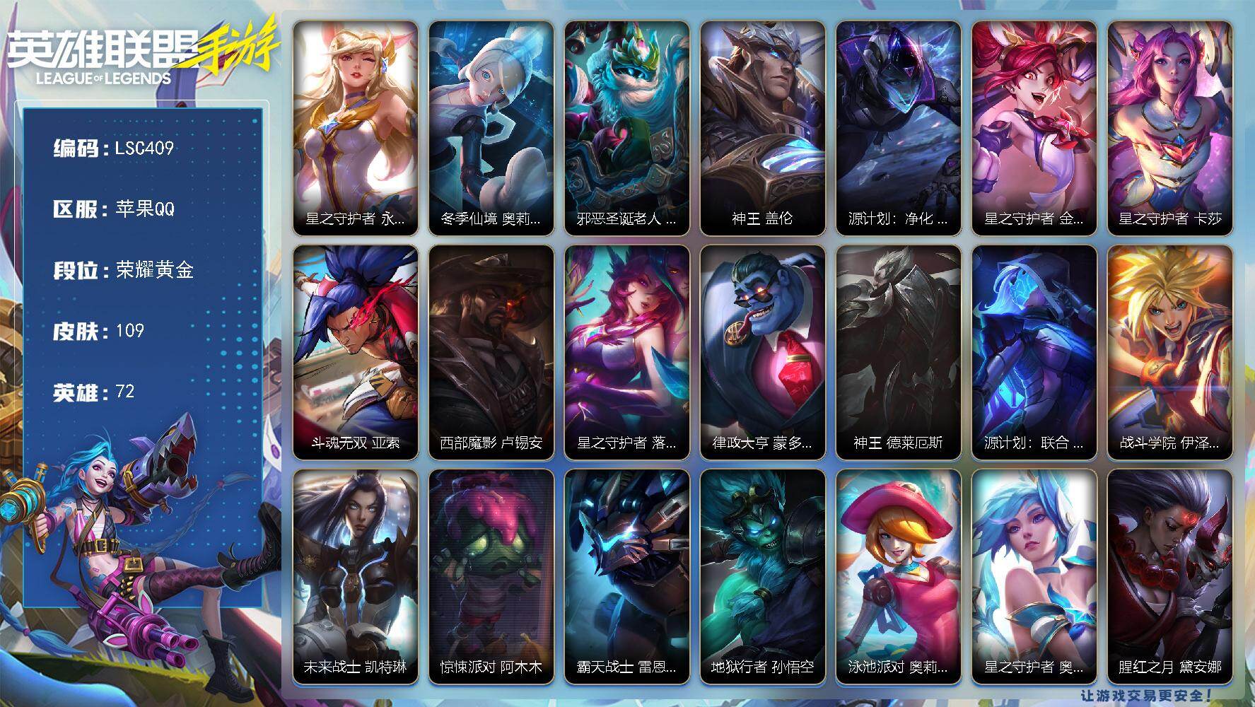 【lsc409】72英雄/109皮肤/1神话/12传说/荣耀黄金/星之守护者 永绽盛芒 阿狸/冬季仙境 奥莉安娜/邪恶圣诞老人 维迦/神王 盖伦/源计划:净化 薇恩/星之守护者 金克丝/星之守护者 卡莎/斗魂无双 亚索/西部魔影 卢锡安/星之守护者 落 霞/律政大亨 蒙多医生/神王 德莱厄斯/源计划:联合 艾希/战斗学院 伊泽瑞尔/未来战士 凯特琳/惊悚派对 阿木木/霸天战士 雷恩加尔/地狱行者 孙悟空/泳池派对 奥莉安娜/星之守护者 奥莉安娜/腥红之月 黛安娜/无限烈焰 黛安娜/恶魔之刃 泰达米尔/暗星 卡兹克/烘焙童谣 悠米/圣诞老人 布隆/霸天龙神 奥瑞利安·索尔/未来战士 崔斯特/弹幕天使 卡莎/魅惑女巫 莫甘娜/铁血女忍 阿卡丽/海之歌 萨勒芬妮/战场之王 亚索/幻梦甜心 阿狸/武神 贾克斯/泳池派对 蕾欧娜/小恶魔 崔丝塔娜/娜就去看看 崔丝塔娜/小蜜蜂 提莫/寒冬精灵 璐璐/暮星之羽 霞/福牛守护者 嘉文四世/柯基 库奇/冰封王子 蒙多医生/持胡萝卜的雪人 易/福牛守护者 德莱厄斯/泳池派对 格雷福斯/玉剑传说 风仙子 迦娜/灵魂收割者 德莱文/福牛守护者 阿利斯塔/冰川巨兽 墨菲特/银河魔装机神 菲兹/战场之王 吉格斯/泳池派对 吉格斯/电玩勇者 锐雯/冬境仙灵 索拉卡/霸天战鹰 加里奥/神龙守卫 加里奥/战斗学院 阿克尚/天启骑士 杰斯/伯爵 卡萨丁/腥红之月 希维尔/未来战士 慎/丧尸 布兰德/苍穹之光 布兰德/我,怒角 维迦/盗梦暗影 锤石/灵魂莲华 莉莉娅/s3光耀之灵/s4光耀之心/s8绯金鮫灵/s9王牌舰长/s10王牌上将/s11王牌司令/s12龙冕先锋/s19冠翎征服者/死亡骑士 盖伦/游侠法师 拉克丝/脏兮兮 努努和威朗普/斗战胜佛 孙悟空/光耀之心 奥莉安娜/暗黑女武神 黛安娜/秘密特工 赵信/龙冕先锋 赵信/末路狂花 金克丝/探戈灵魂 崔斯特/王牌舰长 崔斯特/冠翎征服者 尼菈/刀锋女王 莫甘娜/探戈灵魂 伊芙琳/冰霜烈焰 安妮/熊猫 提莫/光耀之灵 璐璐/黯黑魔龙 希瓦娜/女警官 蔚/双城之战 蔚/王牌上将 嘉文四世/至高之拳 李青/腥红之月 凯南/超武乾坤:电弧 凯南/单身贵族 内瑟斯/西部牛仔 厄运小姐/黑暗骑士 格雷福斯/极地女神 艾希/王牌司令 艾希/兔宝宝 菲兹/科学狂人 吉格斯/绯金鲛灵 娜美/迅箭 韦鲁斯/抵抗军玫瑰 卡特琳娜/冲浪高手 辛吉德/蕉泥座人 索拉卡/光执事 伊泽瑞尔/铁血狙击手 凯特琳/穿着正装的恶魔 维迦/腥红之月 锤石/南瓜头 费德提克