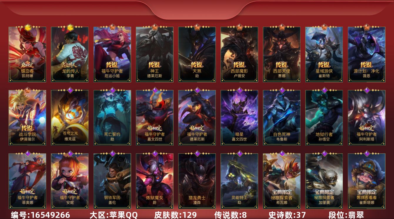 1神话 2限定 24传说 80史诗 169皮肤 可二次 可修改实名 【段位】翡翠 【神话皮】夜星流火 金克丝 【限定皮肤】斩星魔剑水晶玫瑰永恩 【传说皮】灵魂莲华腕豪星之守护者卡莎地狱之门卫士西部天使寒冰西部魔影卢锡安天煞劫神王诺手神拳盲僧星域游侠卡牌律政大亨炼狱魔犬黎明使