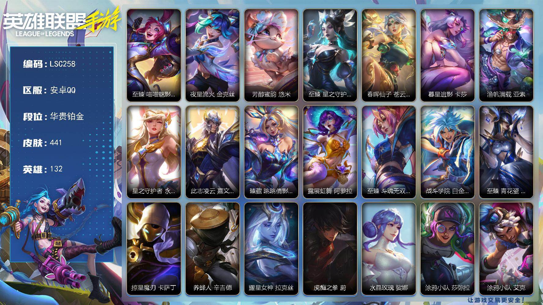 【lsc258】132英雄/441皮肤/17神话/71传说/249史诗/华贵铂金/至臻喵喵魅影金克丝/夜星流火 金克丝/芳醇蜜韵 悠米/至臻 星之守护者 辛德拉/春晖仙子苍云缥缈卡莎/暮星追影 卡莎/渔帆满载 亚索/星之守护者阿狸永绽盛芒/此志凌云 嘉文四世/臻藏跳跳倩影厄运小姐/露展虹舞 阿萝拉/至臻 斗魂无双 艾瑞莉娅/战斗学院白金学长伊泽瑞尔/至臻 青花瓷 丽桑卓/掠星魔刃卡萨丁/养蜂人