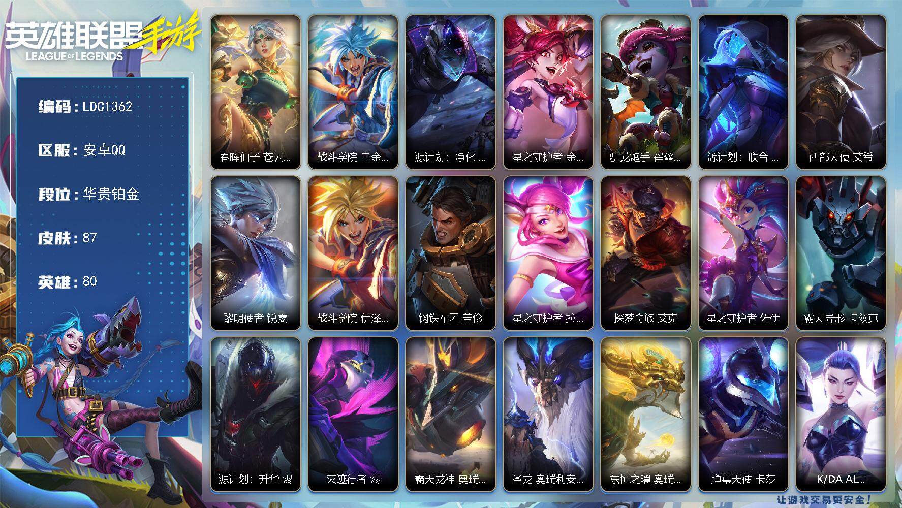 【ldc1362】80英雄/87皮肤/2神话/7传说/36史诗/华贵铂金/春晖仙子 苍云缥缈 卡莎/战斗学院 白金学长 伊泽瑞尔/源计划:净化 薇恩/星之守护者 金克丝/驯龙炮手 崔丝塔娜/源计划:联合 艾希/西部天使 艾希/黎明使者 锐雯/战斗学院 伊泽瑞尔/钢铁军团 盖伦/星之守护者 拉克丝/探梦奇旅 艾克/星之守护者 佐伊/霸天异形 卡兹克/源计划:升华 烬/灭迹行者 烬/霸天龙神 奥瑞利安·索尔/圣龙 奥瑞利安·索尔/东恒之曜 奥瑞利安·索尔/弹幕天使 卡莎/k/da all out 卡莎/神龙尊者 玉境灵龙 卡莎/清剿小队 潘森/源计划:暗影 阿卡丽/源计划:火 菲奥娜/福牛守护者 菲奥娜/源计划:阴 劫/武神 贾克斯/屠龙勇士 凯尔/源计划:雷 卢锡安/源计划:山 蕾欧娜/小蜜蜂 提莫/驯龙女巫 璐璐/源计划:裁决 蔚/暮星之羽 霞/暗星 嘉文四世/福牛守护者 嘉文四世/海之歌 泽丽/白色死神 韦鲁斯/源计划:天眼 韦鲁斯/源计划:雄心 卡特琳娜/星之守护者 伊泽瑞尔/泳池派对 凯特琳/怨之砂 派克/绝代智将 斯维因/s2光耀之芒/s3光耀之灵/s5绯金魅影/s6绯金丽刃/s7绯金战斧/s8绯金鮫灵/s9王牌舰长/s10王牌上将/s11王牌勇将/s11王牌司令/s12龙冕先锋/s13龙冕御盾/s14龙冕神策/s15龙冕异士/s18冠翎巨神像/海上霸主 盖伦/苍穹之光 薇恩/猎龙勇士 薇恩/时之砂 艾克/龙冕先锋 赵信/死亡绽放 卡兹克/末路狂花 金克丝/光耀之芒 金克丝/龙冕御盾 布隆/龙冕异士 烬/王牌舰长 崔斯特/探戈灵魂 伊芙琳/绯金魅影 伊芙琳/绯金丽刃 菲奥娜/擂台皇帝 布里茨/西部牛仔 亚索/冲击之刃 劫/末世天使 凯尔/游击队员 崔丝塔娜/兔宝宝 提莫/熊猫 提莫/光耀之灵 璐璐/女警官 蔚/王牌上将 嘉文四世/刺客信条 凯南/单身贵族 内瑟斯/绯金战斧 德莱文/黑暗骑士 艾希/王牌司令 艾希/无畏号 墨菲特/龙冕神策 吉格斯/绯金鲛灵 娜美/苍穹之光 韦鲁斯/莲花之令 艾瑞莉娅/光执事 伊泽瑞尔/冠翎巨神像 加里奥/光明之锤 杰斯/王牌勇将 奥拉夫/铁血狙击手 凯特琳/枯萎之壤 雷克顿/战争机器 赛恩/腥红之月 锤石