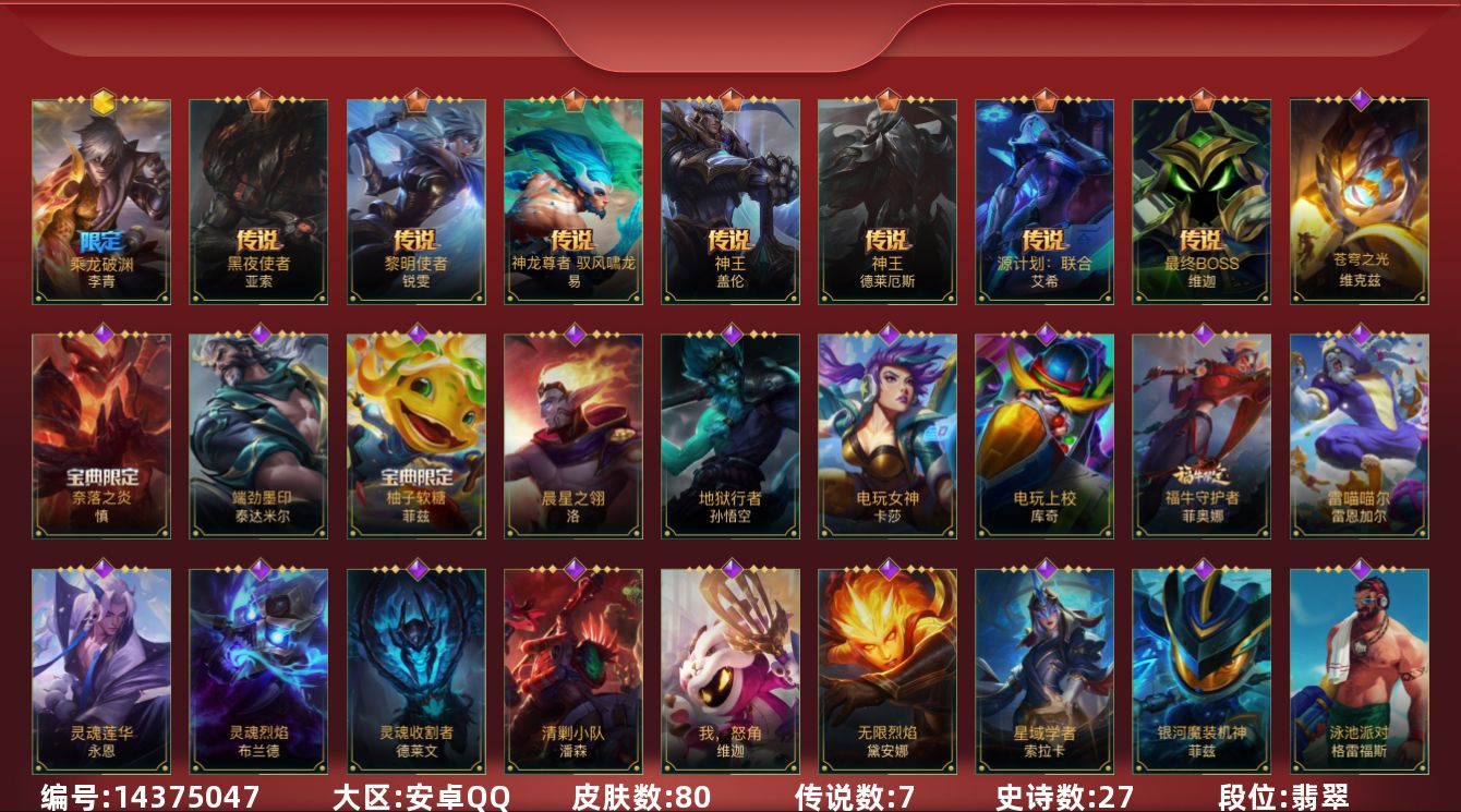 1神话 7传说 27史诗 80皮肤 可二次 可修改实名 【段位】:翡翠 【神话皮】:乘龙破渊 李青 【传说皮】:神王诺手神王盖伦神龙尊者 驭风啸龙黎明使者锐雯黑夜使者亚索最终boss维迦源计划:联合 【亮点】:【优质装备】:黑夜使者亚索黎明使者锐雯神龙尊者 驭风啸龙神王盖伦神王