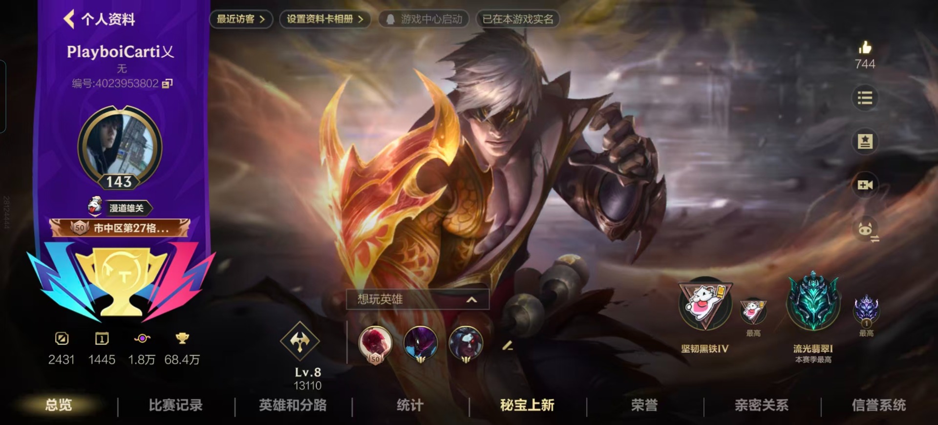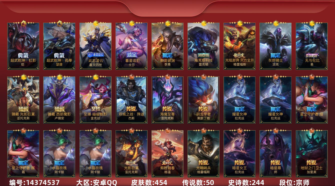 2典藏 9神话 27限定 50传说 244史诗 454皮肤 可二次 可修改实名 【段位】:宗师 【典藏皮】:超武乾坤:孤拳超武乾坤:虹影 【神话皮】:海克斯科技 雷克顿乘龙破渊 李青暮星追影 卡莎此志凌云 嘉文四世至臻喵喵魅影金克丝灰烬骑士派克火焰澎湃火力全开臻藏光影巨翼臻藏西部