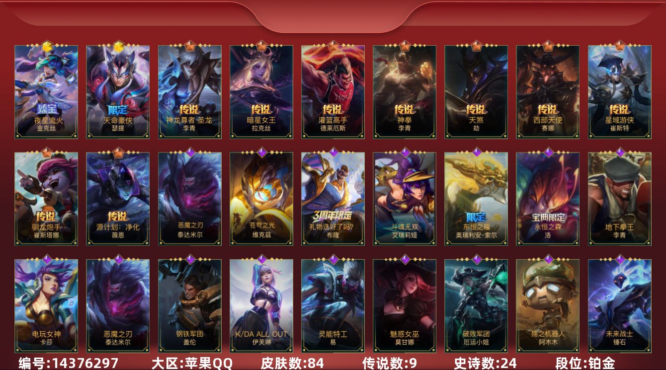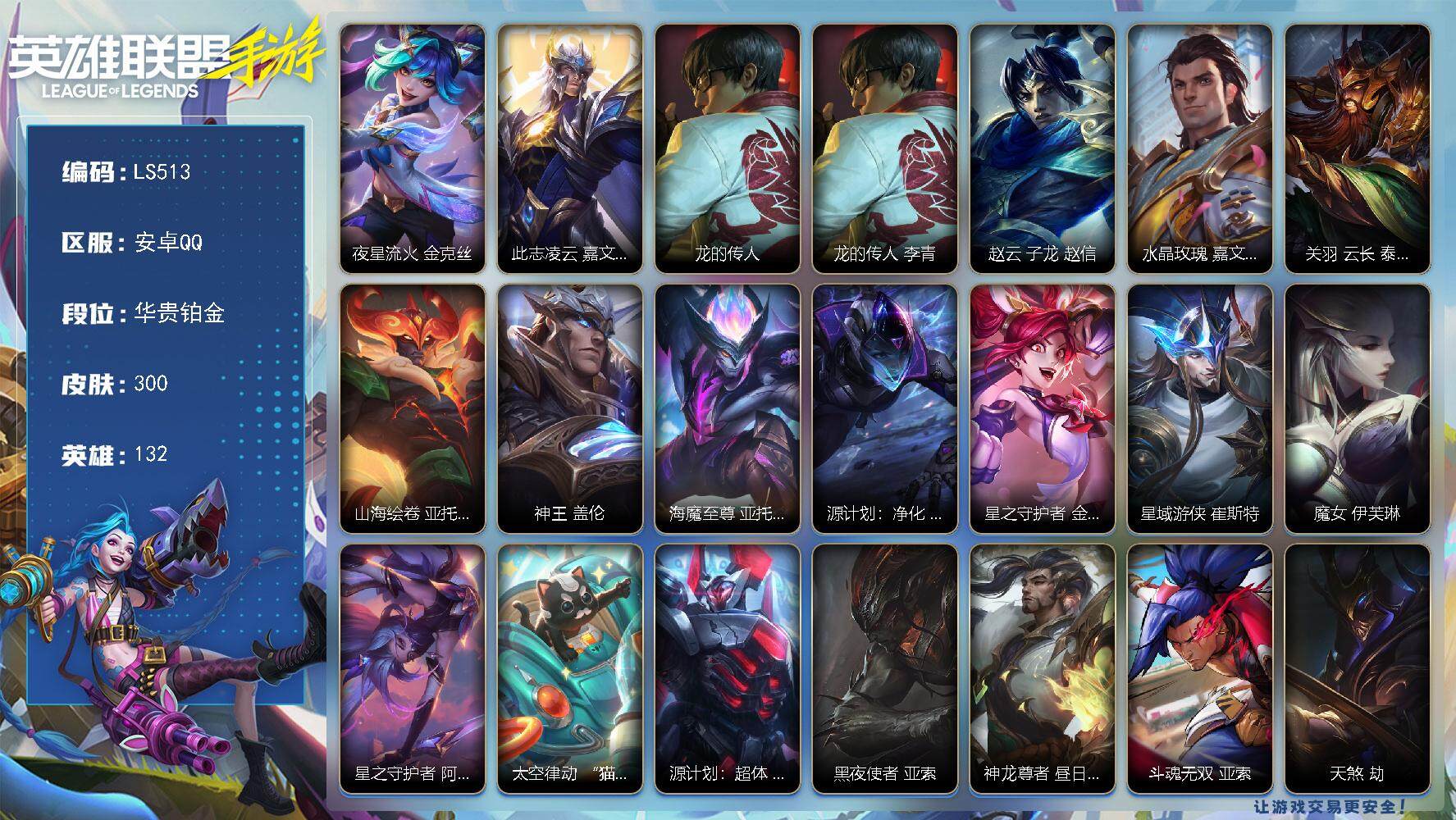 【ls513】132英雄/300皮肤/华贵铂金/夜星流火 金克丝/此志凌云 嘉文四世/龙的传人 李青/赵云 子龙 赵信/水晶玫瑰 嘉文四世/关羽 云长 泰达米尔/山海绘卷 亚托克斯/神王 盖伦/海魔至尊 亚托克斯/源计划:净化 薇恩/星之守护者 金克丝/星域游侠 崔斯特/魔女 伊芙琳/星之守护者 阿卡丽/太空律动 “猫猫”布里和里茨 布里茨/源计划:超体 莫德凯撒/黑夜使者 亚索/神龙尊者 昼日真龙 亚索/斗魂无双 亚索/天煞 劫/星域武神 贾克斯/西部魔影 卢锡安/欧米伽小队 幽灵特工 提莫/翩翩绣蕊 霞/星之守护者 陨 洛/剪胜裁春 格温/神拳 李青/神龙尊者 圣龙 李青/律政大亨 蒙多医生/炼狱魔犬 内瑟斯/福牛守护者 厄运小姐/黎明使者 永恩/源计划:林 易/神龙尊者 驭风啸龙 易/灌篮高手 德莱厄斯/神王 德莱厄斯/女主播 迦娜/黎明使者 德莱文/源计划:联合 艾希/黎明使者 锐雯/战斗学院 伊泽瑞尔/源计划:泯灭 雷克顿/最终boss 维迦/西部天使 赛娜/源计划:毁灭 派克/钢铁军团 盖伦/睡衣守护者 拉克丝/战斗学院 拉克丝/惊悚派对 阿木木/殇之机器人 阿木木/霸天战士 雷恩加尔/雷喵喵尔 雷恩加尔/黎明使者 卡尔玛/星域先知 卡尔玛/神龙尊者 宁静之龙 卡尔玛/丧尸 努努和威朗普/斗魂无双 孙悟空/探梦奇旅 艾克/野火首领 艾克/暗星 奥莉安娜/星之守护者 奥莉安娜/腥红之月 黛安娜/恶魔之刃 泰达米尔/斗魂无双 赵信/霸天异形 卡兹克/暗星 卡兹克/猎梦吞噬者 卡兹克/喵喵魅影金克丝/北极星守护者 赫卡里姆/烘焙童谣 悠米/猛虎 布隆/圣诞老人 布隆/礼物选好了吗? 布隆/灭迹行者 烬/斗魂觉醒 烬/霸天龙神 奥瑞利安·索尔/灰烬领主 奥瑞利安·索尔/东恒之曜 奥瑞利安·索尔/星之守护者 辛德拉/腥红之月 崔斯特/怪诞童话 崔斯特/弹幕天使 卡莎/k/da all out 卡莎/斗魂无双 尼菈/魔女 尼菈/魅惑女巫 莫甘娜/k/da all out 伊芙琳/猎龙勇士 潘森/清剿小队 潘森/未来战士 潘森/深海奇域 潘森/铁血女忍 阿卡丽/源计划:暗影 阿卡丽/泳池派对 菲奥娜/福牛守护者 菲奥娜/苹果机器人 布里茨/战场之王 布里茨/星之守护者 萨勒芬妮/银河魔装机神 安妮/福牛守护者 安妮/电玩女神 阿狸/幻梦甜心 阿狸/源计划:阴 劫/死亡誓约 劫/灵能特工 劫/武神 贾克斯/灵能特工 凯尔/屠龙勇士 凯尔/泳池派对 蕾欧娜/欧米伽小队 魔鬼伞兵 崔丝塔娜/我,羽饰骑士 崔丝塔娜/灵魂莲华 崔丝塔娜/预备备!砰! 崔丝塔娜/灵魂莲华 提莫/小蜜蜂 提莫/寒冬精灵 璐璐/睡衣守护者 璐璐/秘旅探索者 希瓦娜/燎原烈焰 蔚/晨星之翎 洛/西部魔影 送葬人 图奇/星域裁断使 格温/源代码 卡蜜尔/暗星 嘉文四世/福牛守护者 嘉文四世/神龙尊者 均衡之龙 沃利贝尔/泳池派对 李青/地下拳王 李青/柯基 库奇/奈落之炎 凯南/战地机甲 内瑟斯/盗梦者 内瑟斯/星之守护者 厄运小姐/龙腾虎跃 瑟提/心之钢 瑟提/持胡萝卜的雪人 易/玉剑传说 无极 易/福牛守护者 德莱厄斯/禁卫机甲 格雷福斯/战斗教授 格雷福斯/灵魂收割者 德莱文/破败军团 德莱文/斗魂无双 德莱文/福牛守护者 阿利斯塔/霸天巨兽 墨菲特/暗星 墨菲特/灵魂莲华 奈德丽/银河魔装机神 菲兹/虚空海灵 菲兹/绒毛 菲兹/欧米伽小队 鬼影蛙人 菲兹/柚子软糖 菲兹/泳池派对 吉格斯/天棱寒雨 弗拉基米尔/玉剑传说 武剑仙 锐雯/白色死神 韦鲁斯/暗星 韦鲁斯/觅心射手 韦鲁斯/源计划:天眼 韦鲁斯/西部天使 艾瑞莉娅/斗魂无双 艾瑞莉娅/金玉贺吉 艾瑞莉娅/源计划:雄心 卡特琳娜/地狱火 加里奥/秘旅探索者 加里奥/霸天战鹰 加里奥/抵抗军雷神 杰斯/战地机甲 厄加特/西部魔影 持呛女巫 莎弥拉/猎龙勇士 奥拉夫/光明哨兵 奥拉夫/泳池派对 凯特琳/电玩女神 凯特琳/奈落之炎 慎/灵魂烈焰 布兰德/泳池派对 雷克顿/欧米伽小队 天雷爆破手 维迦/我,怒角 维迦/真实伤害 赛娜/星之守护者 赛娜/怨之砂 派克/西部魔影 猎天使恶魔 泰隆/未来战士 锤石/盗梦暗影 锤石/源计划:末日 沃里克/星之吞噬者 费德提克/斗魂觉醒 卡莉丝塔/黑夜使者 莉莉娅/梦游仙境 莉莉娅/雷霆领主 奥恩/魅惑女巫 薇古丝/红帽迷影 薇古丝/s1光耀之刃/s2光耀之芒/s3光耀之灵/s4光耀之心/s5绯金魅影/s6绯金丽刃/s7绯金战斧/s8绯金鮫灵/s9王牌舰长/s10王牌上将/s11王牌勇将/s11王牌司令/s12龙冕先锋/s13龙冕御盾/s14龙冕神策/s15龙冕异士/s16冠翎飞行员/s17冠翎御风使/海上霸主 盖伦/游侠法师 拉克丝/暗黑武士 雷恩加尔/脏兮兮 努努和威朗普/斗战胜佛 孙悟空/猎龙勇士 薇恩/光耀之心 奥莉安娜/光耀之刃 泰达米尔/秘密特工 赵信/龙冕先锋 赵信/死亡绽放 卡兹克/光耀之芒 金克丝/双城之战 金克丝/猎龙勇士 布隆/狮心 布隆/龙冕御盾 布隆/龙冕异士 烬/赌侠 崔斯特/探戈灵魂 崔斯特/王牌舰长 崔斯特/探戈灵魂 伊芙琳/绯金魅影 伊芙琳/银色之牙 阿卡丽/超武乾坤:暗影 阿卡丽/皇家守卫 菲奥娜/绯金丽刃 菲奥娜/擂台皇帝 布里茨/小红帽 安妮/“你看见过我的熊猫吗?” 安妮/西部牛仔 亚索/腥红之月 亚索/偶像歌手 阿狸/焰尾妖狐 阿狸/风纪委员 阿狸/冲击之刃 劫/光明骑士 贾克斯/末世天使 凯尔/烧烤女神 蕾欧娜/熊猫 提莫/五连摇滚键盘手 娑娜/缪斯女神 娑娜/邪恶女巫 璐璐/光耀之灵 璐璐/冰霜亚龙 希瓦娜/黯黑魔龙 希瓦娜/女警官 蔚/双城之战 蔚/孤胆英豪 嘉文四世/王牌上将 嘉文四世/至高之拳 李青/海牛骑手 库奇/冠翎飞行员 库奇/超