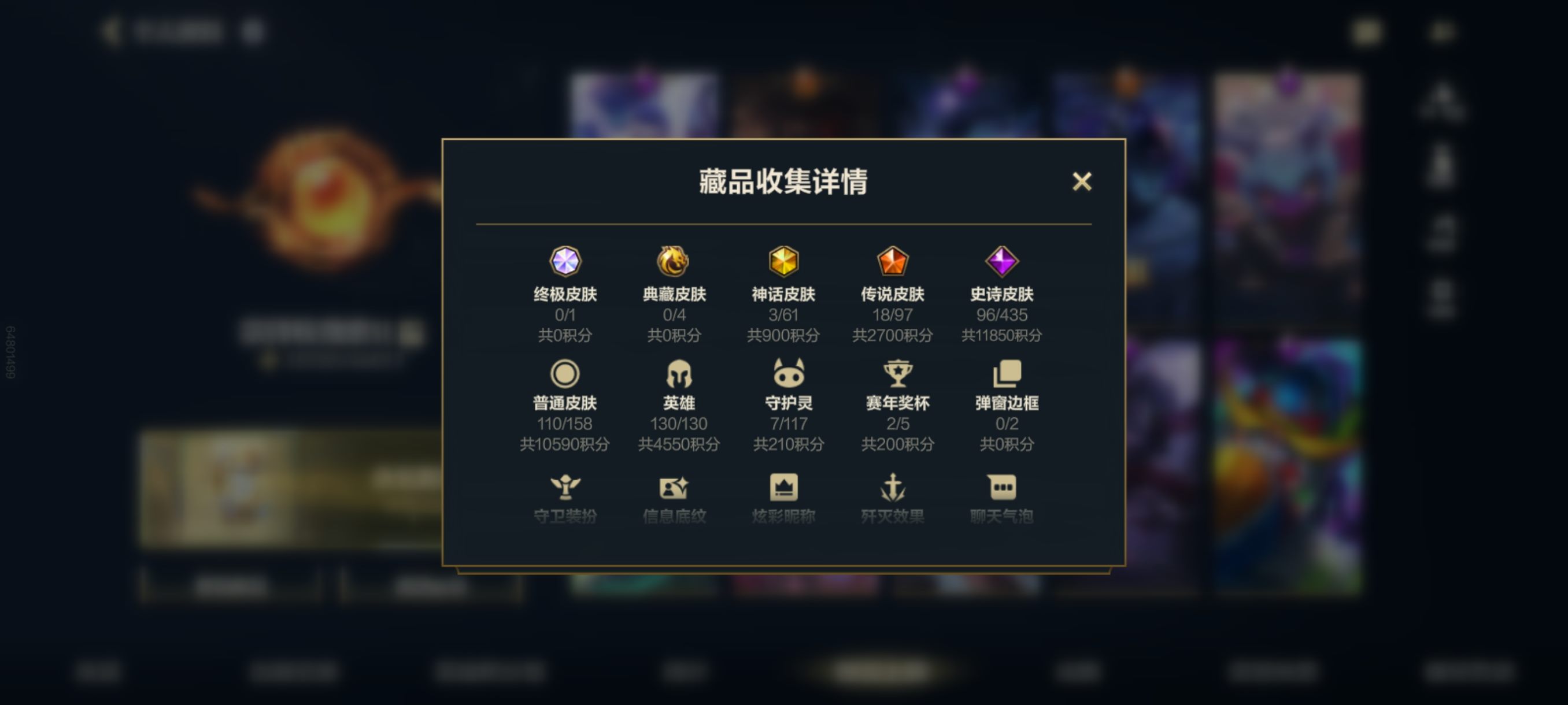 LOLM25765号130 英雄 227 皮肤 3 神话 18 传说 96 史诗