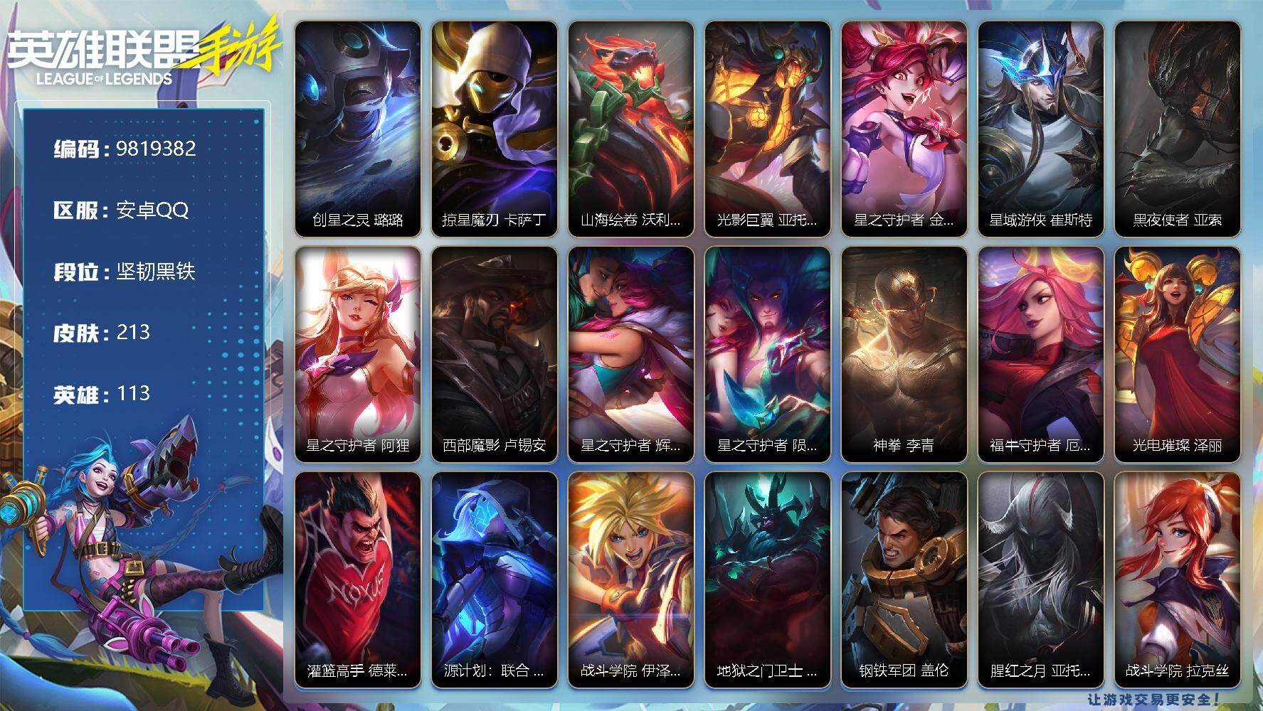 【编号14853】店长推荐特价处理精品号 【商品标题】:113英雄-213皮肤 【限定皮肤】:创星之灵 璐璐,掠星魔刃 卡萨丁,山海绘卷 沃利贝尔 【传说皮肤】:光影巨翼 亚托克斯,星之守护者 金克丝,星域游侠 崔斯特,黑夜使者 亚索,星之守护者 阿狸,西部魔影 卢锡安,星之守护者 辉 霞,星之守护者 陨 洛,神拳 李青,福牛守护者 厄运小姐,光电璀璨 泽丽,灌篮高手 德莱厄斯,源计划:联合 艾希,战斗学院 伊泽瑞尔,地狱之门卫士 加里奥 【史诗皮肤】:钢铁军团 盖伦,腥红之月 亚托克斯,战斗学院 拉克丝,惊悚派对 阿木木,地狱火 阿木木,摄魂猎手 凯隐,霸天战士 雷恩加尔,星域先知 卡尔玛,地狱行者 孙悟空,探梦奇旅 艾克,暗星 奥莉安娜,腥红之月 黛安娜,暗星 卡兹克,烘焙童谣 悠米,圣诞老人 布隆,灭迹行者 烬,灰烬领主 奥瑞利安·索尔,东恒之曜 奥瑞利安·索尔,k/da all out 卡莎,神龙尊者 玉境灵龙 卡莎,玉剑传说 苍鸾 莫甘娜,k/da all out 伊芙琳,猎龙勇士 潘森,铁血女忍 阿卡丽,源计划:火 菲奥娜,玉剑传说 无双 菲奥娜,福牛守护者 菲奥娜,战场之王 布里茨,福牛守护者 安妮,幻梦甜心 阿狸,源计划:阴 劫,秘旅探索者 贾克斯,灵能特工 凯尔,屠龙勇士 凯尔,娜就去看看 崔丝塔娜,小蜜蜂 提莫,泳池派对 璐璐,星之守护者 璐璐,创星之灵 璐璐,银河魔装机神 希瓦娜,秘旅探索者 希瓦娜,源计划:裁决 蔚,炼狱魔女 蔚,燎原烈焰 蔚,太空律动 “百万调音” 格温,源代码 卡蜜尔,暗星 嘉文四世,福牛守护者 嘉文四世,山海绘卷 沃利贝尔,地下拳王 李青,柯基 库奇,冰封王子 蒙多医生,魔女 婕拉,光源盛放 婕拉,盗梦者 内瑟斯,源计划:燃 泽丽,灵魂莲华 永恩,持胡萝卜的雪人 易,福牛守护者 德莱厄斯,泳池派对 格雷福斯,禁卫机甲 格雷福斯,绝命机甲 格雷福斯,光焰澎湃 格雷福斯,玉剑传说 风仙子 迦娜,灵魂收割者 德莱文,破败军团 德莱文,福牛守护者 阿利斯塔,冰川巨兽 墨菲特,虚空海灵 菲兹,欧米伽小队 鬼影蛙人 菲兹,战场之王 吉格斯,玉剑传说 寒潭夭夭 娜美,电玩勇者 锐雯,白色死神 韦鲁斯,光明哨兵 艾瑞莉娅,源计划:雄心 卡特琳娜,死亡誓约 卡特琳娜,冬境仙灵 索拉卡,星域学者 索拉卡,地狱火 加里奥,秘旅探索者 加里奥,战斗学院 阿克尚,天启骑士 杰斯,神奇先驱 杰斯,西部魔影 厄加特,掠星魔刃 卡萨丁,灵能特工 莎弥拉,猎龙勇士 奥拉夫,泳池派对 凯特琳,未来战士 慎,灵魂烈焰 布兰德,泳池派对 雷克顿,黯晶巨鳄 雷克顿,冰糖葫芦 维迦,梦境灵探 赛娜,怨之砂 派克,西部魔影 锤石,盗梦暗影 锤石,光灵永燃 锤石,古神 沃里克,雷霆领主 奥恩,魅惑女巫 薇古丝 【赛季皮肤】:s1光耀之刃,s2光耀之芒,s3光耀之灵,s4光耀之心,s5绯金魅影,s6绯金丽刃,s7绯金战斧,s8绯金鮫灵,s9王牌舰长,s10王牌上将,s11王牌勇将,s11王牌司令,s12龙冕先锋 【其他皮肤】:暗黑武士 雷恩加尔,脏兮兮 努努和威朗普,三昧真火 孙悟空,斗战胜佛 孙悟空,苍穹之光 薇恩,猎龙勇士 薇恩,哥特女仆 奥莉安娜,光耀之心 奥莉安娜,暗黑女武神 黛安娜,光耀之刃 泰达米尔,秘密特工 赵信,龙冕先锋 赵信,死亡绽放 卡兹克,光耀之芒 金克丝,双城之战 金克丝,猎龙勇士 布隆,狮心 布隆,赌侠 崔斯特,探戈灵魂 崔斯特,王牌舰长 崔斯特,刀锋女王 莫甘娜,绯金魅影 伊芙琳,银色之牙 阿卡丽,超武乾坤:暗影 阿卡丽,皇家守卫 菲奥娜,绯金丽刃 菲奥娜,兔宝宝 布里茨,冰霜烈焰 安妮,小红帽 安妮,腥红之月 亚索,偶像歌手 阿狸,焰尾妖狐 阿狸,冲击之刃 劫,光明骑士 贾克斯,末世天使 凯尔,烧烤女神 蕾欧娜,熊猫 提莫,五连摇滚键盘手 娑娜,缪斯女神 娑娜,邪恶女巫 璐璐,光耀之灵 璐璐,冰霜亚龙 希瓦娜,铁拳执事 蔚,女警官 蔚,双城之战 蔚,孤胆英豪 嘉文四世,王牌上将 嘉文四世,至高之拳 李青,刺客信条 凯南,超级英雄 凯南,超武乾坤:电弧 凯南,战争血统 蒙多医生,熔火之心 拉莫斯,创世魔神 内瑟斯,单身贵族 内瑟斯,西部牛仔 厄运小姐,女帝 厄运小姐,暗影 易,热血班长 德莱厄斯,无情重炮 格雷福斯,暴风女神 迦娜,金牌主播 德莱文,德莱德莱 德莱文,绯金战斧 德莱文,极地女神 艾希,女皇 艾希,黑暗骑士 艾希,王牌司令 艾希,黑暗骑士 阿利斯塔,无畏号 墨菲特,兔宝宝 菲兹,科学狂人 吉格斯,兔宝宝 吉格斯,飞车暴走族 古拉加斯,鲛妮座人 娜美,河水之灵 娜美,绯金鲛灵 娜美,苍穹之光 韦鲁斯,迅箭 韦鲁斯,冰霜之刃 艾瑞莉娅,抵抗军玫瑰 卡特琳娜,冲浪高手 辛吉德,炼金狂士 辛吉德,蕉泥座人 索拉卡,冰川勇者 伊泽瑞尔,风执事 加里奥,光明之锤 杰斯,铁哥们儿 奥拉夫,黑暗骑士 奥拉夫,王牌勇将 奥拉夫,铁血狙击手 凯特琳,腥红之月 鬼武者 慎,枯萎之壤 雷克顿,鳄霸 雷克顿,穿着正装的恶魔 维迦,兔宝宝 薇古丝