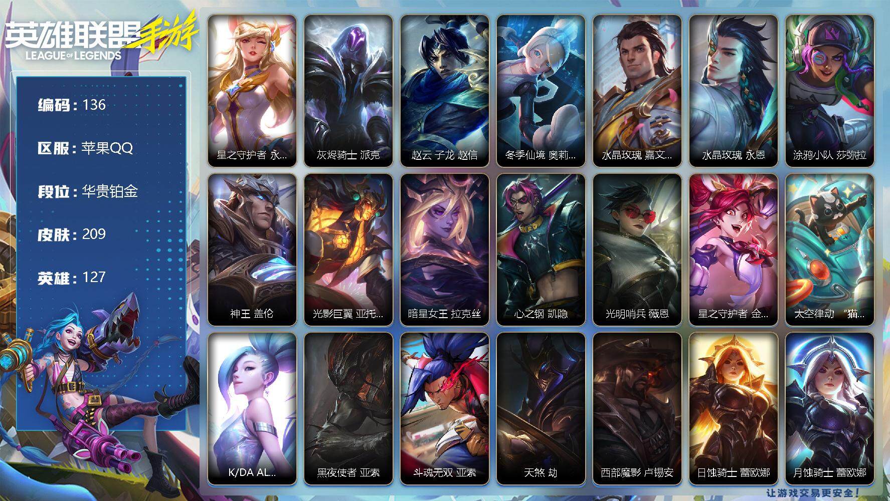 【商品标题】:127英雄-270皮肤 【神话皮肤】:摄魂使者 薇恩,巡游踏云霄! 墨菲特 【限定皮肤】:鸡里奥 加里奥,水晶玫瑰 永恩,关羽 云长 泰达米尔,山海绘卷 烬 【传说皮肤】:神王 盖伦,源计划:净化 薇恩,光明哨兵 薇恩,星之守护者 金克丝,暗星尊 烬,星域游侠 崔斯特,星之守护者 卡莎,春晖神女 莫甘娜,太空律动 “猫猫”布里和里茨 布里茨,黑夜使者 亚索,神龙尊者 昼日真龙 亚索,斗魂无双 亚索,星之守护者 阿狸,灵魂莲华 阿狸,天煞 劫,西部魔影 卢锡安,日蚀骑士 蕾欧娜,月蚀骑士 蕾欧娜,驯龙炮手 崔丝塔娜,欧米伽小队 幽灵特工 提莫,星之守护者 陨 洛,神拳 李青,跳跳倩影 厄运小姐,源计划:林 易,神龙尊者 驭风啸龙 易,灌篮高手 德莱厄斯,女主播 迦娜,源计划:联合 艾希,西部天使 艾希,黎明使者 锐雯,战斗学院 伊泽瑞尔,西部天使 赛娜,源计划:毁灭 派克,霸天零式 赛恩,灵魂莲华 锤石 【史诗皮肤】:钢铁军团 盖伦,星之守护者 拉克丝,睡衣守护者 拉克丝,战斗学院 拉克丝,惊悚派对 阿木木,摄魂猎手 凯隐,雷喵喵尔 雷恩加尔,黎明使者 卡尔玛,星域先知 卡尔玛,丧尸 努努和威朗普,地狱行者 孙悟空,暗星 奥莉安娜,泳池派对 奥莉安娜,无限烈焰 黛安娜,光明哨兵 黛安娜,黑夜使者 泰达米尔,猎龙勇士 赵信,斗魂无双 赵信,猎梦吞噬者 卡兹克,清剿小队 金克丝,战斗校长 悠米,猛虎 布隆,山海绘卷 烬,霸天龙神 奥瑞利安·索尔,灰烬领主 奥瑞利安·索尔,东恒之曜 奥瑞利安·索尔,腥红之月 崔斯特,弹幕天使 卡莎,电玩女神 卡莎,k/da all out 卡莎,春晖仙子 卡莎,斗魂无双 尼菈,玉剑传说 苍鸾 莫甘娜,猎龙勇士 潘森,西宙之晖 潘森,铁血女忍 阿卡丽,k/da all out 阿卡丽,源计划:暗影 阿卡丽,源计划:火 菲奥娜,泳池派对 菲奥娜,战场之王 布里茨,福牛守护者 安妮,源计划:风 亚索,战场之王 亚索,灵魂莲华 亚索,电玩女神 阿狸,k/da all out 阿狸,幻梦甜心 阿狸,源计划:阴 劫,武神 贾克斯,秘旅探索者 贾克斯,源计划:雷 卢锡安,欧米伽小队 魔鬼伞兵 崔丝塔娜,小恶魔 崔丝塔娜,我,羽饰骑士 崔丝塔娜,娜就去看看 崔丝塔娜,小蜜蜂 提莫,泳池派对 璐璐,驯龙女巫 璐璐,寒冬精灵 璐璐,银河魔装机神 希瓦娜,破败军团 希瓦娜,燎原烈焰 蔚,暮星之羽 霞,晨星之翎 洛,斗魂觉醒 格温,源代码 卡蜜尔,魔女 卡蜜尔,暗星 嘉文四世,福牛守护者 嘉文四世,地下拳王 李青,电玩上校 库奇,柯基 库奇,涂鸦小队 库奇,奈落之炎 凯南,冰封王子 蒙多医生,盗梦者 内瑟斯,太空律动 “狗头” 内瑟斯,星之守护者 厄运小姐,电玩女神 厄运小姐,破败军团 厄运小姐,源计划:燃 泽丽,涂鸦小队 泽丽,心之钢 瑟提,水晶玫瑰 永恩,持胡萝卜的雪人 易,灵能特工 易,西部魔影 德莱厄斯,福牛守护者 德莱厄斯,战斗教授 格雷福斯,灵魂收割者 德莱文,斗魂无双 德莱文,神龙尊者 苍龙 艾希,福牛守护者 阿利斯塔,霸天巨兽 墨菲特,冰川巨兽 墨菲特,暗星 墨菲特,虚空海灵 菲兹,绒毛 菲兹,柚子软糖 菲兹,战场之王 吉格斯,玉剑传说 寒潭夭夭 娜美,电玩勇者 锐雯,玉剑传说 武剑仙 锐雯,白色死神 韦鲁斯,暗星 韦鲁斯,玉剑传说 舞剑仙 艾瑞莉娅,西部天使 艾瑞莉娅,斗魂无双 艾瑞莉娅,源计划:雄心 卡特琳娜,死亡誓约 卡特琳娜,战斗学院 卡特琳娜,源代码 索拉卡,睡衣守护者 伊泽瑞尔,星之守护者 伊泽瑞尔,鸡里奥 加里奥,秘旅探索者 加里奥,战斗学院 阿克尚,黎明使者 阿克尚,神奇先驱 杰斯,西部魔影 厄加特,灵能特工 莎弥拉,猎龙勇士 奥拉夫,灵魂烈焰 布兰德,战场之王 布兰德,冰糖葫芦 维迦,真实伤害 赛娜,梦境灵探 赛娜,怨之砂 派克,西部魔影 猎天使恶魔 泰隆,盗梦暗影 锤石,宇航员 诺提勒斯,灵魂莲华 莉莉娅,雷霆领主 奥恩 【赛季皮肤】:s1光耀之刃,s2光耀之芒,s3光耀之灵,s4光耀之心,s5绯金魅影,s6绯金丽刃,s7绯金战斧,s8绯金鮫灵,s9王牌舰长,s10王牌上将,s11王牌勇将,s11王牌司令,s12龙冕先锋,s13龙冕御盾,s14龙冕神策,s15龙冕异士,s16冠翎飞行员,s17冠翎御风使 【其他皮肤】:死亡骑士 盖伦,海上霸主 盖伦,游侠法师 拉克丝,小小骑士 阿木木,暗黑武士 雷恩加尔,三昧真火 孙悟空,斗战胜佛 孙悟空,苍穹之光 薇恩,猎龙勇士 薇恩,时之砂 艾克,哥特女仆 奥莉安娜,光耀之心 奥莉安娜,暗黑女武神 黛安娜,光耀之刃 泰达米尔,关羽 云长 泰达米尔,龙冕先锋 赵信,死亡绽放 卡兹克,末路狂花 金克丝,光耀之芒 金克丝,双城之战 金克丝,猎龙勇士 布隆,龙冕御盾 布隆,龙冕异士 烬,赌侠 崔斯特,探戈灵魂 崔斯特,王牌舰长 崔斯特,刀锋女王 莫甘娜,探戈灵魂 伊芙琳,绯金魅影 伊芙琳,银色之牙 阿卡丽,超武乾坤:暗影 阿卡丽,皇家守卫 菲奥娜,绯金丽刃 菲奥娜,兔宝宝 布里茨,冰霜烈焰 安妮,西部牛仔 亚索,腥红之月 亚索,偶像歌手 阿狸,冲击之刃 劫,末世天使 凯尔,烧烤女神 蕾欧娜,游击队员 崔丝塔娜,兔宝宝 提莫,熊猫 提莫,缪斯女神 娑娜,邪恶女巫 璐璐,光耀之灵 璐璐,黯黑魔龙 希瓦娜,女警官 蔚,双城之战 蔚,王牌上将 嘉文四世,至高之拳 李青,海牛骑手 库奇,冠翎飞行员 库奇,超级英雄 凯南,超武乾坤:电弧 凯南,战争血统 蒙多医生,制胜金球 拉莫斯,单身贵族 内瑟斯,西部牛仔 厄运小姐,女帝 厄运小姐,暗影 易,热血班长 德莱厄斯,暴风女神 迦娜,冠翎御风使 迦娜,德莱德莱 德莱文,绯金战斧 德莱文,极地女神 艾希,女皇 艾希,黑暗骑士 艾希,王牌司令 艾希,