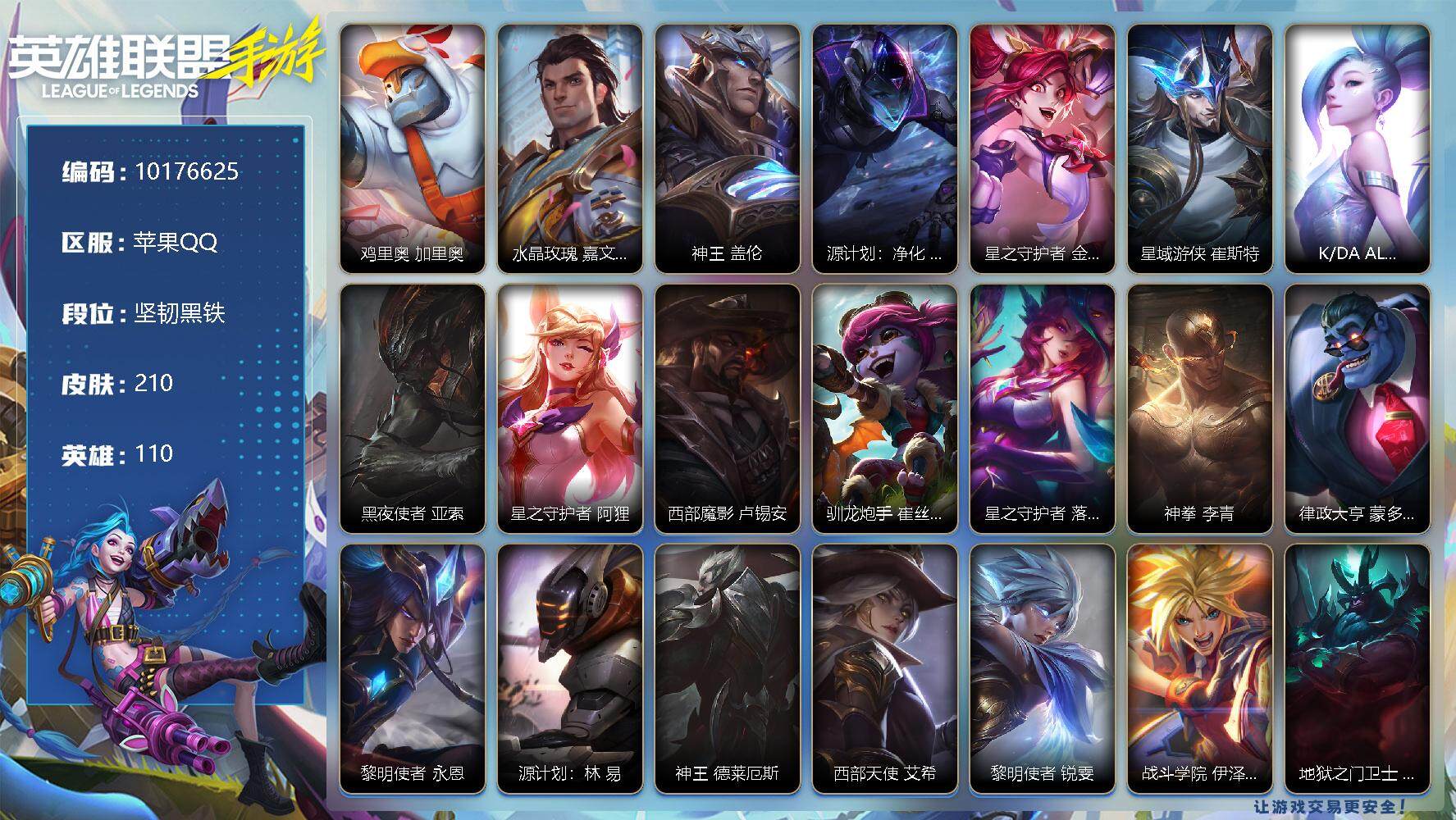 [13323820]【编号42731可秒换绑】店长推荐特价处理精品号 110英雄-210皮肤 【限定皮肤】:鸡里奥 加里奥,水晶玫瑰 嘉文四世 【传说皮肤】:神王 盖伦,源计划:净化 薇恩,星之守护者 金克丝,星域游侠 崔斯特,k/da all out 萨勒芬妮,黑夜使者 亚索,星之守护者 阿狸,西部魔影 卢锡安,驯龙炮手 崔丝塔娜,星之守护者 落 霞,神拳 李青,律政大亨 蒙多医生,黎明使者 永恩,源计划:林 易,神王 德莱厄斯,西部天使 艾希,黎明使者 锐雯,战斗学院 伊泽瑞尔,地狱之门卫士 加里奥,源计划:泯灭 雷克顿,灵魂莲华 锤石 【史诗皮肤】:钢铁军团 盖伦,惊悚派对 阿木木,殇之机器人 阿木木,地狱火 阿木木,雷喵喵尔 雷恩加尔,星域先知 卡尔玛,丧尸 努努和威朗普,地狱行者 孙悟空,探梦奇旅 艾克,暗星 奥莉安娜,泳池派对 奥莉安娜,腥红之月 黛安娜,无限烈焰 黛安娜,恶魔之刃 泰达米尔,猎龙勇士 赵信,霸天异形 卡兹克,暗星 卡兹克,烘焙童谣 悠米,灭迹行者 烬,圣龙 奥瑞利安·索尔,弹幕天使 卡莎,电玩女神 卡莎,神龙尊者 玉境灵龙 卡莎,k/da all out 伊芙琳,清剿小队 潘森,铁血女忍 阿卡丽,k/da all out 阿卡丽,源计划:暗影 阿卡丽,福牛守护者 菲奥娜,苹果机器人 布里茨,银河魔装机神 安妮,福牛守护者 安妮,战场之王 亚索,k/da all out 阿狸,幻梦甜心 阿狸,源计划:阴 劫,死亡誓约 劫,武神 贾克斯,源计划:雷 卢锡安,源计划:山 蕾欧娜,小恶魔 崔丝塔娜,大魔王 提莫,泳池派对 璐璐,驯龙女巫 璐璐,秘旅探索者 希瓦娜,破败军团 希瓦娜,源计划:裁决 蔚,燎原烈焰 蔚,太空律动 “百万调音” 格温,星域审判官 卡蜜尔,暗星 嘉文四世,水晶玫瑰 嘉文四世,地下拳王 李青,柯基 库奇,奈落之炎 凯南,冰封王子 蒙多医生,盗梦者 内瑟斯,nova 天赋觉醒 内瑟斯,持胡萝卜的雪人 易,玉剑传说 无极 易,西部魔影 德莱厄斯,福牛守护者 德莱厄斯,禁卫机甲 格雷福斯,绝命机甲 格雷福斯,星之守护者 迦娜,魅惑女巫 迦娜,灵魂收割者 德莱文,神龙尊者 苍龙 艾希,冰川巨兽 墨菲特,银河魔装机神 菲兹,虚空海灵 菲兹,绒毛 菲兹,战场之王 吉格斯,奥术大师 吉格斯,电玩勇者 锐雯,nova 天赋觉醒 锐雯,白色死神 韦鲁斯,玉剑