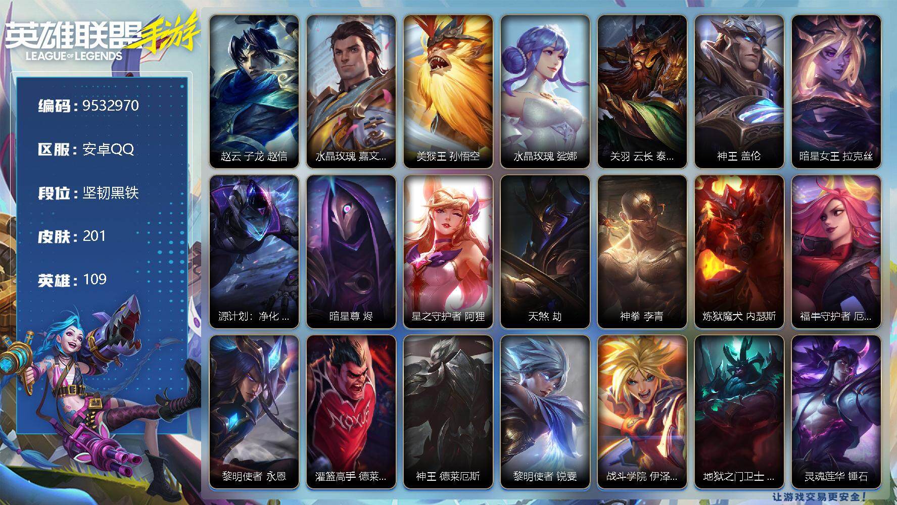 【编号09753可秒换绑】店长推荐特价处理精品号 【商品标题】:109英雄-201皮肤 【限定皮肤】:赵云 子龙 赵信,水晶玫瑰 嘉文四世,美猴王 孙悟空,水晶玫瑰 娑娜,关羽 云长 泰达米尔 【传说皮肤】:神王 盖伦,暗星女王 拉克丝,源计划:净化 薇恩,暗星尊 烬,星之守护者 阿狸,天煞 劫,神拳 李青,炼狱魔犬 内瑟斯,福牛守护者 厄运小姐,黎明使者 永恩,灌篮高手 德莱厄斯,神王 德莱厄斯,黎明使者 锐雯,战斗学院 伊泽瑞尔,地狱之门卫士 加里奥,灵魂莲华 锤石 【史诗皮肤】:钢铁军团 盖伦,殇之机器人 阿木木,地狱火 阿木木,霸天战士 雷恩加尔,星域先知 卡尔玛,丧尸 努努和威朗普,美猴王 孙悟空,暗星 奥莉安娜,无限烈焰 黛安娜,焕影迎春 佐伊,赵云 子龙 赵信,猎龙勇士 赵信,暗星 卡兹克,觅心猫猫 悠米,腥红之月 烬,灭迹行者 烬,腥红之月 崔斯特,弹幕天使 卡莎,k/da all out 伊芙琳,未来战士 潘森,铁血女忍 阿卡丽,源计划:暗影 阿卡丽,泳池派对 菲奥娜,福牛守护者 菲奥娜,星之守护者 萨勒芬妮,银河魔装机神 安妮,福牛守护者 安妮,源计划:风 亚索,战场之王 亚索,灵魂莲华 亚索,源计划:阴 劫,死亡誓约 劫,武神 贾克斯,源计划:雷 卢锡安,nova 天赋觉醒 卢锡安,小恶魔 崔丝塔娜,娜就去看看 崔丝塔娜,虎头虎脑 崔丝塔娜,大魔王 提莫,灵魂莲华 提莫,小蜜蜂 提莫,招财进宝 提莫,水晶玫瑰 娑娜,秘旅探索者 希瓦娜,破败军团 希瓦娜,炼狱魔女 蔚,燎原烈焰 蔚,暮星之羽 霞,晨星之翎 洛,星域审判官 卡蜜尔,暗星 嘉文四世,水晶玫瑰 嘉文四世,福牛守护者 嘉文四世,奈落之炎 凯南,冰封王子 蒙多医生,星之守护者 厄运小姐,电玩女神 厄运小姐,魅惑女巫 厄运小姐,破败军团 厄运小姐,龙腾虎跃 瑟提,灵魂莲华 永恩,福牛守护者 德莱厄斯,绝命机甲 格雷福斯,星之守护者 迦娜,灵魂收割者 德莱文,破败军团 德莱文,福牛守护者 阿利斯塔,冰川巨兽 墨菲特,暗星 墨菲特,虚空海灵 菲兹,欧米伽小队 鬼影蛙人 菲兹,战场之王 吉格斯,奥术大师 吉格斯,电玩勇者 锐雯,nova 天赋觉醒 锐雯,白色死神 韦鲁斯,暗星 韦鲁斯,玉剑传说 舞剑仙 艾瑞莉娅,光明哨兵 艾瑞莉娅,源计划:雄心 卡特琳娜,死亡誓约 卡特琳娜,地狱火 加里奥,秘旅探索者 加里奥,战斗学院 阿克尚,猎龙勇士 奥拉夫,灵魂烈焰 布兰德,神龙尊者 魔龙 布兰德,泳池派对 雷克顿,真实伤害 赛娜,西部魔影 锤石,宇航员 诺提勒斯,灵魂莲华 莉莉娅 【赛季皮肤】:s1光耀之刃,s2光耀之芒,s3光耀之灵,s4光耀之心,s5绯金魅影,s6绯金丽刃,s7绯金战斧,s8绯金鮫灵,s9王牌舰长,s10王牌上将,s11王牌司令 【其他皮肤】:小小骑士 阿木木,暗黑武士 雷恩加尔,脏兮兮 努努和威朗普,斗战胜佛 孙悟空,苍穹之光 薇恩,猎龙勇士 薇恩,哥特女仆 奥莉安娜,光耀之心 奥莉安娜,国王 泰达米尔,光耀之刃 泰达米尔,关羽 云长 泰达米尔,秘密特工 赵信,死亡绽放 卡兹克,末路狂花 金克丝,光耀之芒 金克丝,双城之战 金克丝,猎龙勇士 布隆,狮心 布隆,赌侠 崔斯特,探戈灵魂 崔斯特,王牌舰长 崔斯特,刀锋女王 莫甘娜,探戈灵魂 伊芙琳,绯金魅影 伊芙琳,银色之牙 阿卡丽,皇家守卫 菲奥娜,绯金丽刃 菲奥娜,擂台皇帝 布里茨,甜心宝贝 安妮,小红帽 安妮,偶像歌手 阿狸,焰尾妖狐 阿狸,风纪委员 阿狸,冲击之刃 劫,光明骑士 贾克斯,末世天使 凯尔,绝命呛手 卢锡安,烧烤女神 蕾欧娜,兔宝宝 提莫,熊猫 提莫,五连摇滚键盘手 娑娜,邪恶女巫 璐璐,光耀之灵 璐璐,冰霜亚龙 希瓦娜,双城之战 蔚,孤胆英豪 嘉文四世,王牌上将 嘉文四世,至高之拳 李青,海牛骑手 库奇,刺客信条 凯南,腥红之月 凯南,超级英雄 凯南,超武乾坤:电弧 凯南,战争血统 蒙多医生,熔火之心 拉莫斯,制胜金球 拉莫斯,创世魔神 内瑟斯,单身贵族 内瑟斯,西部牛仔 厄运小姐,女帝 厄运小姐,无情重炮 格雷福斯,黑暗骑士 格雷福斯,金牌主播 德莱文,德莱德莱 德莱文,绯金战斧 德莱文,极地女神 艾希,女皇 艾希,王牌司令 艾希,哞利斯塔 阿利斯塔,黑暗骑士 阿利斯塔,兔宝宝 菲兹,科学狂人 吉格斯,兔宝宝 吉格斯,飞车暴走族 古拉加斯,碎桶者 古拉加斯,鲛妮座人 娜美,绯金鲛灵 娜美,苍穹之光 韦鲁斯,冰霜之刃 艾瑞莉娅,莲花之令 艾瑞莉娅,海贼魅影 卡特琳娜,冲浪高手 辛吉德,光执事 伊泽瑞尔,冰川勇者 伊泽瑞尔,风执事 加里奥,光明之锤 杰斯,铁哥们儿 奥拉夫,黑暗骑士 奥拉夫,铁血狙击手 凯特琳,腥红之月 鬼武者 慎,鳄霸 雷克顿,穿着正装的恶魔 维迦
