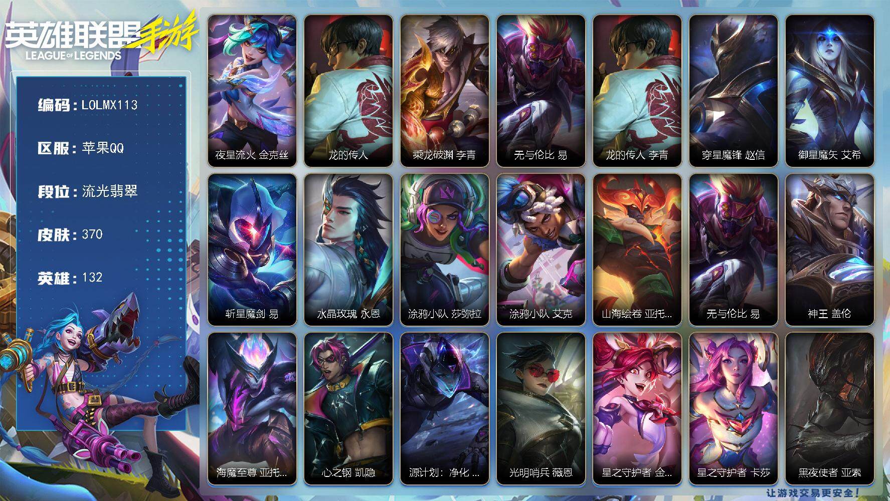 【lox113】132英雄/370皮肤/4神话/34传说/176史诗/流光翡翠/夜星流火 金克丝/龙的传人/乘龙破渊李青/无与伦比易/穿星魔锋/御星魔矢/斩星魔剑/水晶玫瑰永恩/涂鸦小队莎弥拉/涂鸦小队艾克/山海绘卷剑魔/神王盖伦/海魔至尊亚托克斯/心之钢凯隐/源计划:净化薇恩/光明哨兵薇恩/星之守护者金克丝/星之守护者卡莎/黑夜使者亚索/灵魂莲华阿狸/天煞劫/西部魔影卢锡安/斗魂无双 卢