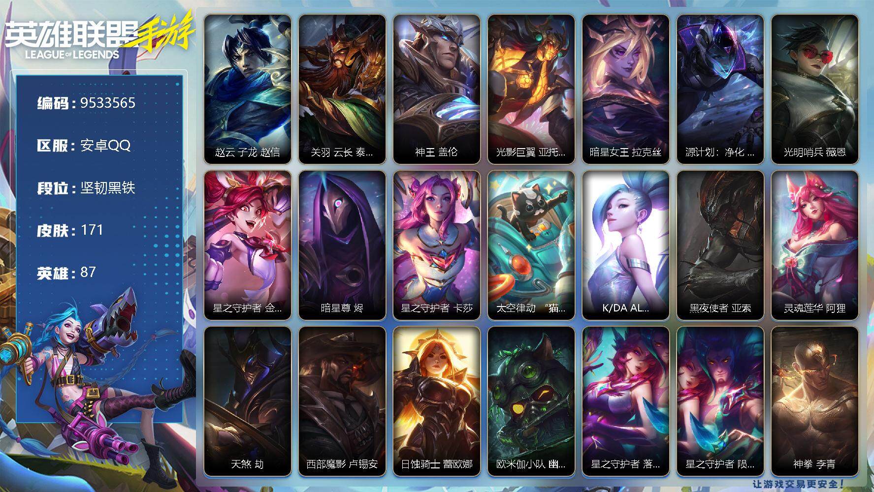 【编号54421】【店长推荐捡漏号】【商品标题】:87英雄-171皮肤 【限定皮肤】:赵云 子龙 赵信,关羽 云长 泰达米尔 【传说皮肤】:神王 盖伦,光影巨翼 亚托克斯,暗星女王 拉克丝,源计划:净化 薇恩,光明哨兵 薇恩,星之守护者 金克丝,暗星尊 烬,星之守护者 卡莎,太空律动 “猫猫”布里和里茨 布里茨,k/da all out 萨勒芬妮,黑夜使者 亚索,灵魂莲华 阿狸,天煞 劫,西部魔影 卢锡安,日蚀骑士 蕾欧娜,欧米伽小队 幽灵特工 提莫,星之守护者 落 霞,星之守护者 陨 洛,神拳 李青,炼狱魔犬 内瑟斯,福牛守护者 厄运小姐,灵魂莲华 瑟提,黎明使者 永恩,源计划:林 易,神龙尊者 驭风啸龙 易,灌篮高手 德莱厄斯,神王 德莱厄斯,光明哨兵 格雷福斯,源计划:联合 艾希,西部天使 艾希,黎明使者 锐雯,战斗学院 伊泽瑞尔,地狱之门卫士 加里奥,未来战士 凯特琳,源计划:泯灭 雷克顿,最终boss 维迦,西部天使 赛娜,源计划:毁灭 派克,灵魂莲华 锤石 【史诗皮肤】:钢铁军团 盖伦,霸天剑魔 亚托克斯,星之守护者 拉克丝,睡衣守护者 拉克丝,黎明使者 卡尔玛,探梦奇旅 艾克,泳池派对 奥莉安娜,腥红之月 黛安娜,无限烈焰 黛安娜,光明哨兵 黛安娜,赵云 子龙 赵信,霸天异形 卡兹克,暗星 卡兹克,觅心猫猫 悠米,源计划:升华 烬,西部牛仔 烬,神龙尊者 玉境灵龙 卡莎,k/da all out 伊芙琳,猎龙勇士 潘森,源计划:暗影 阿卡丽,源计划:火 菲奥娜,银河魔装机神 安妮,源计划:风 亚索,灵魂莲华 亚索,屠龙勇士 凯尔,源计划:雷 卢锡安,泳池派对 蕾欧娜,小恶魔 崔丝塔娜,灵魂莲华 崔丝塔娜,大魔王 提莫,泳池派对 璐璐,星之守护者 璐璐,银河魔装机神 希瓦娜,破败军团 希瓦娜,暮星之羽 霞,西部魔影 送葬人 图奇,暗星 嘉文四世,地下拳王 李青,魔女 婕拉,盗梦者 内瑟斯,破败军团 厄运小姐,源计划:燃 泽丽,龙腾虎跃 瑟提,灵魂莲华 永恩,灵魂莲华 易,西部魔影 德莱厄斯,战斗教授 格雷福斯,光焰澎湃 格雷福斯,星之守护者 迦娜,玉剑传说 风仙子 迦娜,魅惑女巫 迦娜,灵魂收割者 德莱文,破败军团 德莱文,神龙尊者 苍龙 艾希,霸天巨兽 墨菲特,冰川巨兽 墨菲特,银河魔装机神 菲兹,虚空海灵 菲兹,灵魂莲华 锐雯,光明哨兵 锐雯,暗星 韦鲁斯,源计划:天眼 韦鲁斯,玉剑传说 舞剑仙 艾瑞莉娅,西部天使 艾瑞莉娅,光明哨兵 艾瑞莉娅,源计划:雄心 卡特琳娜,源代码 索拉卡,睡衣守护者 伊泽瑞尔,星之守护者 伊泽瑞尔,西部魔影 厄加特,光明哨兵 奥拉夫,神龙尊者 魔龙 布兰德,泳池派对 雷克顿,真实伤害 赛娜,梦境灵探 赛娜,西部魔影 锤石,源计划:末日 沃里克,灵魂莲华 莉莉娅,黑夜使者 莉莉娅 【赛季皮肤】:s1光耀之刃,s2光耀之芒,s3光耀之灵,s5绯金魅影,s6绯金丽刃,s7绯金战斧,s8绯金鮫灵,s9王牌舰长,s11王牌勇将,s11王牌司令,s12龙冕先锋 【其他皮肤】:死亡骑士 盖伦,海上霸主 盖伦,小小骑士 阿木木,暗黑武士 雷恩加尔,苍穹之光 薇恩,光耀之刃 泰达米尔,关羽 云长 泰达米尔,秘密特工 赵信,龙冕先锋 赵信,末路狂花 金克丝,光耀之芒 金克丝,赌侠 崔斯特,探戈灵魂 崔斯特,王牌舰长 崔斯特,绯金魅影 伊芙琳,钢铁意志 潘森,绯金丽刃 菲奥娜,冰霜烈焰 安妮,西部牛仔 亚索,腥红之月 亚索,偶像歌手 阿狸,光明骑士 贾克斯,绝命呛手 卢锡安,兔宝宝 提莫,熊猫 提莫,缪斯女神 娑娜,光耀之灵 璐璐,铁拳执事 蔚,女警官 蔚,刺客信条 凯南,超级英雄 凯南,战争血统 蒙多医生,熔火之心 拉莫斯,单身贵族 内瑟斯,西部牛仔 厄运小姐,暗影 易,末路教父 格雷福斯,德莱德莱 德莱文,绯金战斧 德莱文,极地女神 艾希,王牌司令 艾希,黑暗骑士 阿利斯塔,兔宝宝 菲兹,绯金鲛灵 娜美,苍穹之光 韦鲁斯,海贼魅影 卡特琳娜,抵抗军玫瑰 卡特琳娜,炼金狂士 辛吉德,冰川勇者 伊泽瑞尔,光明之锤 杰斯,王牌勇将 奥拉夫,铁血狙击手 凯特琳,鳄霸 雷克顿