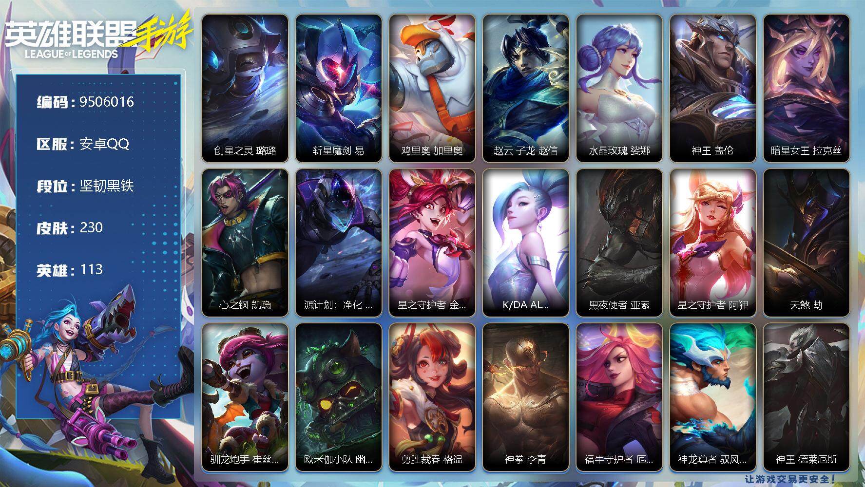 【编号92042】【店长推荐捡漏号】【商品标题】:113英雄-230皮肤 【限定皮肤】:创星之灵 璐璐,斩星魔剑 易,鸡里奥 加里奥,赵云 子龙 赵信,水晶玫瑰 娑娜 【传说皮肤】:神王 盖伦,暗星女王 拉克丝,心之钢 凯隐,源计划:净化 薇恩,星之守护者 金克丝,k/da all out 萨勒芬妮,黑夜使者 亚索,星之守护者 阿狸,天煞 劫,驯龙炮手 崔丝塔娜,欧米伽小队 幽灵特工 提莫,剪胜裁春 格温,神拳 李青,福牛守护者 厄运小姐,神龙尊者 驭风啸龙 易,神王 德莱厄斯,西部天使 艾希,黎明使者 锐雯,西部天使 赛娜,霸天零式 赛恩,灵魂莲华 锤石 【史诗皮肤】:战斗学院 拉克丝,殇之机器人 阿木木,地狱火 阿木木,摄魂猎手 凯隐,黎明使者 卡尔玛,星域先知 卡尔玛,丧尸 努努和威朗普,地狱行者 孙悟空,水晶玫瑰 薇恩,泳池派对 奥莉安娜,腥红之月 黛安娜,烈焰仙子 黛安娜,光明哨兵 黛安娜,恶魔之刃 泰达米尔,赵云 子龙 赵信,猎龙勇士 赵信,猛虎下山 赵信,霸天异形 卡兹克,清剿小队 金克丝,烘焙童谣 悠米,猛虎 布隆,圣诞老人 布隆,腥红之月 烬,霸天龙神 奥瑞利安·索尔,灰烬领主 奥瑞利安·索尔,圣龙 奥瑞利安·索尔,东恒之曜 奥瑞利安·索尔,腥红之月 崔斯特,弹幕天使 卡莎,k/da all out 卡莎,斗魂无双 尼菈,玉剑传说 苍鸾 莫甘娜,猎龙勇士 潘森,清剿小队 潘森,未来战士 潘森,铁血女忍 阿卡丽,k/da all out 阿卡丽,源计划:火 菲奥娜,福牛守护者 安妮,战场之王 亚索,k/da all out 阿狸,幻梦甜心 阿狸,屠龙勇士 凯尔,未来战士 卢锡安,欧米伽小队 魔鬼伞兵 崔丝塔娜,小恶魔 崔丝塔娜,娜就去看看 崔丝塔娜,灵魂莲华 崔丝塔娜,虎头虎脑 崔丝塔娜,大魔王 提莫,灵魂莲华 提莫,小蜜蜂 提莫,招财进宝 提莫,水晶玫瑰 娑娜,泳池派对 璐璐,驯龙女巫 璐璐,创星之灵 璐璐,银河魔装机神 希瓦娜,秘旅探索者 希瓦娜,破败军团 希瓦娜,炼狱魔女 蔚,燎原烈焰 蔚,暮星之羽 霞,晨星之翎 洛,源代码 卡蜜尔,暗星 嘉文四世,福牛守护者 嘉文四世,柯基 库奇,盗梦者 内瑟斯,太空律动 “狗头” 内瑟斯,破败军团 厄运小姐,龙腾虎跃 瑟提,斩星魔剑 易,西部魔影 德莱厄斯,福牛守护者 德莱厄斯,战斗教授 格雷福斯,绝命机甲 格雷福斯,魅惑女巫 迦娜,灵魂收割者 德莱文,破败军团 德莱文,福牛守护者 阿利斯塔,霸天巨兽 墨菲特,冰川巨兽 墨菲特,银河魔装机神 菲兹,虚空海灵 菲兹,战场之王 吉格斯,玉剑传说 寒潭夭夭 娜美,白色死神 韦鲁斯,暗星 韦鲁斯,玉剑传说 舞剑仙 艾瑞莉娅,西部天使 艾瑞莉娅,光明哨兵 艾瑞莉娅,源计划:雄心 卡特琳娜,死亡誓约 卡特琳娜,源代码 索拉卡,星域学者 索拉卡,星之守护者 伊泽瑞尔,鸡里奥 加里奥,地狱火 加里奥,秘旅探索者 加里奥,神龙守卫 加里奥,天启骑士 杰斯,神奇先驱 杰斯,灵能特工 莎弥拉,苍穹之光 布兰德,灵魂烈焰 布兰德,泳池派对 雷克顿,黯晶巨鳄 雷克顿,我,怒角 维迦,冰糖葫芦 维迦,梦境灵探 赛娜,怨之砂 派克,灵魂莲华 莉莉娅,魅惑女巫 薇古丝,星域巫灵 薇古丝 【赛季皮肤】:s1光耀之刃,s2光耀之芒,s3光耀之灵,s4光耀之心,s5绯金魅影,s6绯金丽刃,s7绯金战斧,s8绯金鮫灵,s9王牌舰长,s10王牌上将,s11王牌勇将,s11王牌司令 【其他皮肤】:海上霸主 盖伦,小小骑士 阿木木,暗黑武士 雷恩加尔,光明骑士 卡尔玛,脏兮兮 努努和威朗普,斗战胜佛 孙悟空,苍穹之光 薇恩,猎龙勇士 薇恩,哥特女仆 奥莉安娜,光耀之心 奥莉安娜,暗黑女武神 黛安娜,光耀之刃 泰达米尔,秘密特工 赵信,死亡绽放 卡兹克,光耀之芒 金克丝,双城之战 金克丝,猎龙勇士 布隆,狮心 布隆,赌侠 崔斯特,王牌舰长 崔斯特,刀锋女王 莫甘娜,探戈灵魂 伊芙琳,绯金魅影 伊芙琳,银色之牙 阿卡丽,绯金丽刃 菲奥娜,兔宝宝 布里茨,冰霜烈焰 安妮,小红帽 安妮,西部牛仔 亚索,腥红之月 亚索,焰尾妖狐 阿狸,冲击之刃 劫,宗师级钓鱼训练师 贾克斯,光明骑士 贾克斯,末世天使 凯尔,绝命呛手 卢锡安,烧烤女神 蕾欧娜,游击队员 崔丝塔娜,兔宝宝 提莫,熊猫 提莫,五连摇滚键盘手 娑娜,缪斯女神 娑娜,邪恶女巫 璐璐,光耀之灵 璐璐,冰霜亚龙 希瓦娜,黯黑魔龙 希瓦娜,铁拳执事 蔚,女警官 蔚,双城之战 蔚,孤胆英豪 嘉文四世,王牌上将 嘉文四世,至高之拳 李青,刺客信条 凯南,腥红之月 凯南,超级英雄 凯南,超武乾坤:电弧 凯南,熔火之心 拉莫斯,单身贵族 内瑟斯,西部牛仔 厄运小姐,暗影 易,热血班长 德莱厄斯,金牌主播 德莱文,德莱德莱 德莱文,绯金战斧 德莱文,极地女神 艾希,女皇 艾希,黑暗骑士 艾希,王牌司令 艾希,哞利斯塔 阿利斯塔,黑暗骑士 阿利斯塔,无畏号 墨菲特,兔宝宝 菲兹,科学狂人 吉格斯,兔宝宝 吉格斯,飞车暴走族 古拉加斯,鲛妮座人 娜美,绯金鲛灵 娜美,苍穹之光 韦鲁斯,迅箭 韦鲁斯,冰霜之刃 艾瑞莉娅,海贼魅影 卡特琳娜,抵抗军玫瑰 卡特琳娜,蕉泥座人 索拉卡,冰川勇者 伊泽瑞尔,风执事 加里奥,铁哥们儿 奥拉夫,王牌勇将 奥拉夫,铁血狙击手 凯特琳,腥红之月 鬼武者 慎,枯萎之壤 雷克顿,鳄霸 雷克顿,穿着正装的恶魔 维迦,战争机器 赛恩