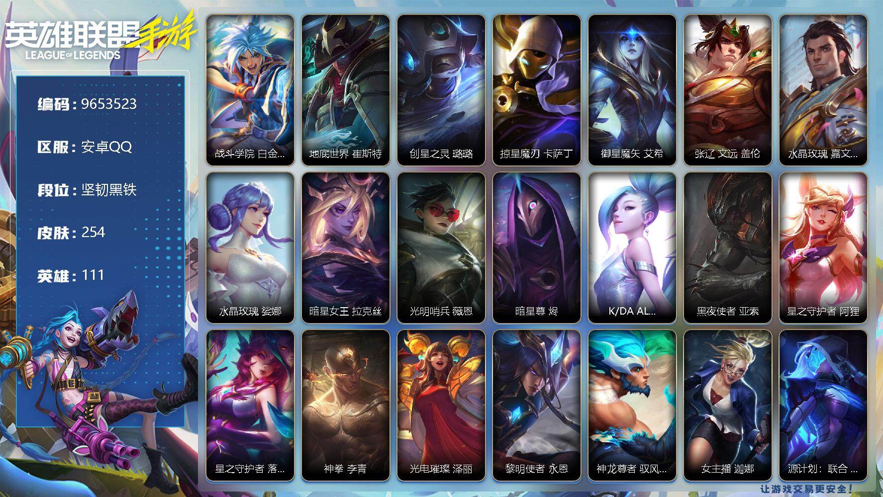 【编号64317】【店长推荐精品号】【商品标题】:111英雄-254皮肤 【神话皮肤】:战斗学院 白金学长 伊泽瑞尔 【限定皮肤】:地底世界 崔斯特,创星之灵 璐璐,掠星魔刃 卡萨丁,御星魔矢 艾希,张辽 文远 盖伦,水晶玫瑰 嘉文四世,水晶玫瑰 娑娜 【传说皮肤】:暗星女王 拉克丝,光明哨兵 薇恩,暗星尊 烬,k/da all out 萨勒芬妮,黑夜使者 亚索,星之守护者 阿狸,星之守护者 落 霞,神拳 李青,光电璀璨 泽丽,黎明使者 永恩,神龙尊者 驭风啸龙 易,女主播 迦娜,源计划:联合 艾希,西部天使 艾希,黎明使者 锐雯,战斗学院 伊泽瑞尔,西部天使 赛娜,灵魂莲华 锤石 【史诗皮肤】:钢铁军团 盖伦,张辽 文远 盖伦,星之守护者 拉克丝,睡衣守护者 拉克丝,战斗学院 拉克丝,地狱火 阿木木,黎明使者 卡尔玛,地狱行者 孙悟空,探梦奇旅 艾克,泳池派对 奥莉安娜,星之守护者 奥莉安娜,腥红之月 黛安娜,光明哨兵 黛安娜,焕影迎春 佐伊,恶魔之刃 泰达米尔,暗星 卡兹克,清剿小队 金克丝,战斗校长 悠米,觅心猫猫 悠米,烘焙童谣 悠米,圣诞老人 布隆,源计划:升华 烬,腥红之月 烬,灭迹行者 烬,霸天龙神 奥瑞利安·索尔,东恒之曜 奥瑞利安·索尔,腥红之月 崔斯特,弹幕天使 卡莎,电玩女神 卡莎,k/da all out 卡莎,神龙尊者 玉境灵龙 卡莎,k/da all out 伊芙琳,猎龙勇士 潘森,清剿小队 潘森,未来战士 潘森,k/da all out 阿卡丽,源计划:暗影 阿卡丽,福牛守护者 菲奥娜,苹果机器人 布里茨,战场之王 布里茨,星之守护者 萨勒芬妮,悦鼓春生 萨勒芬妮,银河魔装机神 安妮,福牛守护者 安妮,源计划:风 亚索,电玩女神 阿狸,k/da all out 阿狸,幻梦甜心 阿狸,死亡誓约 劫,灵能特工 劫,武神 贾克斯,未来战士 卢锡安,战斗学院 蕾欧娜,欧米伽小队 魔鬼伞兵 崔丝塔娜,娜就去看看 崔丝塔娜,小蜜蜂 提莫,水晶玫瑰 娑娜,泳池派对 璐璐,星之守护者 璐璐,寒冬精灵 璐璐,创星之灵 璐璐,破败军团 希瓦娜,源计划:裁决 蔚,炼狱魔女 蔚,燎原烈焰 蔚,甜心之羽 霞,暮星之羽 霞,晨星之翎 洛,太空律动 “百万调音” 格温,星域审判官 卡蜜尔,暗星 嘉文四世,水晶玫瑰 嘉文四世,福牛守护者 嘉文四世,泳池派对 李青,地下拳王 李青,电玩上校 库奇,奈落之炎 凯南,冰封王子 蒙多医生,盗梦者 内瑟斯,星之守护者 厄运小姐,电玩女神 厄运小姐,魅惑女巫 厄运小姐,破败军团 厄运小姐,心之钢 瑟提,灵魂莲华 永恩,持胡萝卜的雪人 易,玉剑传说 无极 易,灵魂莲华 易,福牛守护者 德莱厄斯,泳池派对 格雷福斯,禁卫机甲 格雷福斯,绝命机甲 格雷福斯,星之守护者 迦娜,灵魂收割者 德莱文,破败军团 德莱文,御星魔矢 艾希,神龙尊者 苍龙 艾希,福牛守护者 阿利斯塔,冰川巨兽 墨菲特,银河魔装机神 菲兹,虚空海灵 菲兹,欧米伽小队 鬼影蛙人 菲兹,战场之王 吉格斯,奥术大师 吉格斯,泳池派对 吉格斯,玉剑传说 寒潭夭夭 娜美,玉剑传说 武剑仙 锐雯,白色死神 韦鲁斯,觅心射手 韦鲁斯,玉剑传说 舞剑仙 艾瑞莉娅,西部天使 艾瑞莉娅,源计划:雄心 卡特琳娜,死亡誓约 卡特琳娜,战斗学院 卡特琳娜,冬境仙灵 索拉卡,星域学者 索拉卡,电玩勇者 伊泽瑞尔,睡衣守护者 伊泽瑞尔,星之守护者 伊泽瑞尔,秘旅探索者 加里奥,神奇先驱 杰斯,掠星魔刃 卡萨丁,灵能特工 莎弥拉,泳池派对 凯特琳,踏春来 凯特琳,未来战士 慎,苍穹之光 布兰德,灵魂烈焰 布兰德,真实伤害 赛娜,梦境灵探 赛娜,星之守护者 赛娜,怨之砂 派克,未来战士 锤石,盗梦暗影 锤石,黑夜使者 莉莉娅,魅惑女巫 薇古丝 【赛季皮肤】:s1光耀之刃,s2光耀之芒,s3光耀之灵,s4光耀之心,s5绯金魅影,s6绯金丽刃,s7绯金战斧,s8绯金鮫灵,s9王牌舰长,s10王牌上将,s11王牌勇将,s11王牌司令,s12龙冕先锋 【其他皮肤】:死亡骑士 盖伦,海上霸主 盖伦,游侠法师 拉克丝,小小骑士 阿木木,暗黑武士 雷恩加尔,光明骑士 卡尔玛,脏兮兮 努努和威朗普,三昧真火 孙悟空,苍穹之光 薇恩,猎龙勇士 薇恩,时之砂 艾克,哥特女仆 奥莉安娜,光耀之心 奥莉安娜,国王 泰达米尔,光耀之刃 泰达米尔,秘密特工 赵信,龙冕先锋 赵信,末路狂花 金克丝,光耀之芒 金克丝,双城之战 金克丝,猎龙勇士 布隆,狮心 布隆,地底世界 崔斯特,赌侠 崔斯特,探戈灵魂 崔斯特,王牌舰长 崔斯特,刀锋女王 莫甘娜,绯金魅影 伊芙琳,钢铁意志 潘森,银色之牙 阿卡丽,皇家守卫 菲奥娜,绯金丽刃 菲奥娜,擂台皇帝 布里茨,兔宝宝 布里茨,冰霜烈焰 安妮,小红帽 安妮,西部牛仔 亚索,偶像歌手 阿狸,焰尾妖狐 阿狸,风纪委员 阿狸,冲击之刃 劫,光明骑士 贾克斯,末世天使 凯尔,烧烤女神 蕾欧娜,熊猫 提莫,五连摇滚键盘手 娑娜,邪恶女巫 璐璐,光耀之灵 璐璐,冰霜亚龙 希瓦娜,黯黑魔龙 希瓦娜,铁拳执事 蔚,女警官 蔚,双城之战 蔚,王牌上将 嘉文四世,海牛骑手 库奇,刺客信条 凯南,腥红之月 凯南,超级英雄 凯南,熔火之心 拉莫斯,制胜金球 拉莫斯,单身贵族 内瑟斯,西部牛仔 厄运小姐,抵抗军战姬 厄运小姐,暗影 易,末路教父 格雷福斯,黑暗骑士 格雷福斯,德莱德莱 德莱文,绯金战斧 德莱文,极地女神 艾希,女皇 艾希,黑暗骑士 艾希,王牌司令 艾希,哞利斯塔 阿利斯塔,黑暗骑士 阿利斯塔,无畏号 墨菲特,兔宝宝 吉格斯,飞车暴走族 古拉加斯,碎桶者 古拉加斯,鲛妮座人 娜美,河水之灵 娜美,绯金鲛灵 娜美,冰霜之刃 艾瑞莉娅,莲花之令 艾瑞莉娅,抵抗军玫瑰 卡特琳娜,冲浪高手 辛吉德,炼金狂士 