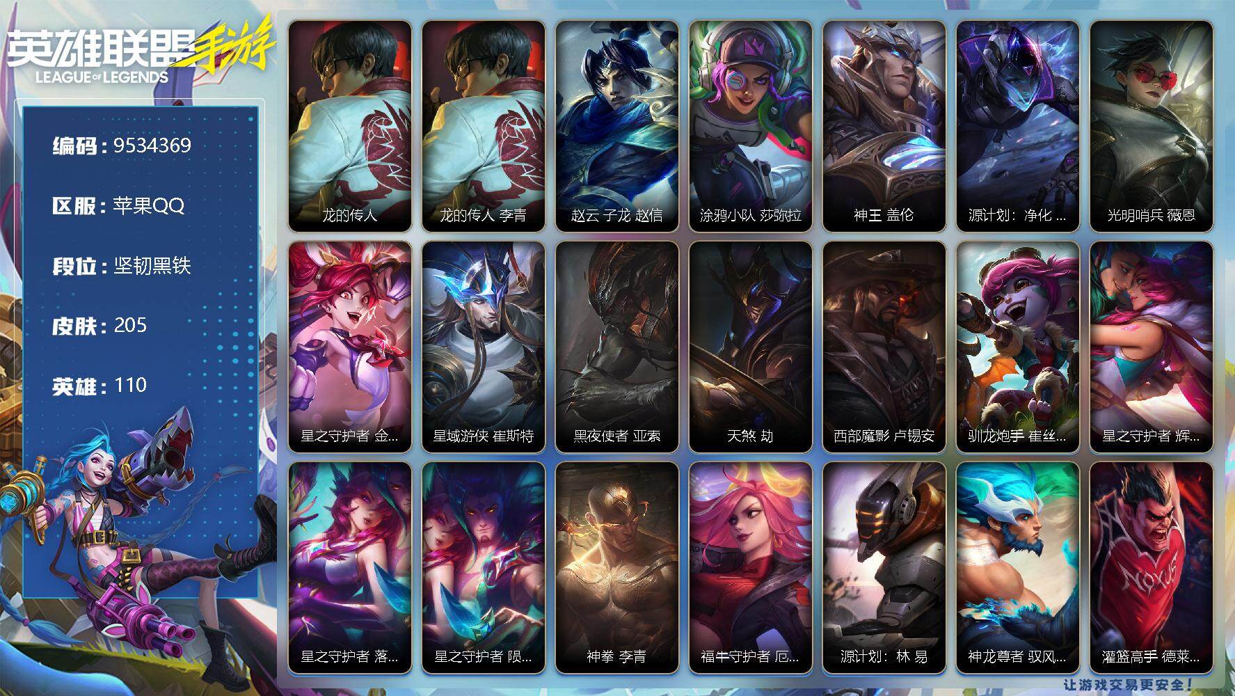 【编号74549】【店长推荐捡漏号】【商品标题】:110英雄-205皮肤 【神话皮肤】:龙的传人 李青 【限定皮肤】:龙的传人 李青,赵云 子龙 赵信,涂鸦小队 莎弥拉 【传说皮肤】:神王 盖伦,源计划:净化 薇恩,光明哨兵 薇恩,星之守护者 金克丝,星域游侠 崔斯特,黑夜使者 亚索,天煞 劫,西部魔影 卢锡安,驯龙炮手 崔丝塔娜,星之守护者 辉 霞,星之守护者 落 霞,星之守护者 陨 洛,神拳 李青,福牛守护者 厄运小姐,源计划:林 易,神龙尊者 驭风啸龙 易,灌篮高手 德莱厄斯,神王 德莱厄斯,源计划:联合 艾希,西部天使 艾希,战斗学院 伊泽瑞尔,地狱之门卫士 加里奥,涂鸦小队 莎弥拉,源计划:泯灭 雷克顿,西部天使 赛娜 【史诗皮肤】:钢铁军团 盖伦,星之守护者 拉克丝,霸天战士 雷恩加尔,雷喵喵尔 雷恩加尔,星域先知 卡尔玛,丧尸 努努和威朗普,腥红之月 黛安娜,无限烈焰 黛安娜,烈焰仙子 黛安娜,恶魔之刃 泰达米尔,赵云 子龙 赵信,猛虎下山 赵信,霸天异形 卡兹克,源计划:升华 烬,腥红之月 烬,灭迹行者 烬,霸天龙神 奥瑞利安·索尔,灰烬领主 奥瑞利安·索尔,圣龙 奥瑞利安·索尔,k/da all out 卡莎,猎龙勇士 潘森,铁血女忍 阿卡丽,k/da all out 阿卡丽,源计划:暗影 阿卡丽,泳池派对 菲奥娜,玉剑传说 无双 菲奥娜,福牛守护者 菲奥娜,银河魔装机神 安妮,福牛守护者 安妮,源计划:风 亚索,k/da all out 阿狸,源计划:阴 劫,武神 贾克斯,灵能特工 凯尔,源计划:雷 卢锡安,小恶魔 崔丝塔娜,娜就去看看 崔丝塔娜,虎头虎脑 崔丝塔娜,大魔王 提莫,小蜜蜂 提莫,招财进宝 提莫,电玩女神 娑娜,寒冬精灵 璐璐,银河魔装机神 希瓦娜,秘旅探索者 希瓦娜,破败军团 希瓦娜,源计划:裁决 蔚,炼狱魔女 蔚,太空律动 “百万调音” 格温,魔女 卡蜜尔,暗星 嘉文四世,福牛守护者 嘉文四世,泳池派对 李青,电玩上校 库奇,盗梦者 内瑟斯,破败军团 厄运小姐,源计划:燃 泽丽,龙腾虎跃 瑟提,持胡萝卜的雪人 易,玉剑传说 无极 易,西部魔影 德莱厄斯,福牛守护者 德莱厄斯,战斗教授 格雷福斯,绝命机甲 格雷福斯,星之守护者 迦娜,魅惑女巫 迦娜,破败军团 德莱文,福牛守护者 阿利斯塔,绒毛 菲兹,战场之王 吉格斯,奥术大师 吉格斯,电玩勇者 锐雯,玉剑传说 武剑仙 锐雯,白色死神 韦鲁斯,西部天使 艾瑞莉娅,光明哨兵 艾瑞莉娅,源计划:雄心 卡特琳娜,死亡誓约 卡特琳娜,源代码 索拉卡,地狱火 加里奥,秘旅探索者 加里奥,战斗学院 阿克尚,神奇先驱 杰斯,猎龙勇士 奥拉夫,神龙尊者 魔龙 布兰德,泳池派对 雷克顿,我,怒角 维迦,真实伤害 赛娜,梦境灵探 赛娜,怨之砂 派克,西部魔影 锤石,未来战士 锤石 【赛季皮肤】:s1光耀之刃,s2光耀之芒,s3光耀之灵,s4光耀之心,s5绯金魅影,s6绯金丽刃,s7绯金战斧,s8绯金鮫灵,s9王牌舰长,s10王牌上将,s11王牌勇将,s11王牌司令,s12龙冕先锋 【其他皮肤】:海上霸主 盖伦,暗黑武士 雷恩加尔,脏兮兮 努努和威朗普,三昧真火 孙悟空,苍穹之光 薇恩,猎龙勇士 薇恩,时之砂 艾克,哥特女仆 奥莉安娜,光耀之心 奥莉安娜,光耀之刃 泰达米尔,秘密特工 赵信,龙冕先锋 赵信,末路狂花 金克丝,光耀之芒 金克丝,双城之战 金克丝,猎龙勇士 布隆,狮心 布隆,赌侠 崔斯特,王牌舰长 崔斯特,刀锋女王 莫甘娜,绯金魅影 伊芙琳,皇家守卫 菲奥娜,绯金丽刃 菲奥娜,兔宝宝 布里茨,小红帽 安妮,西部牛仔 亚索,腥红之月 亚索,偶像歌手 阿狸,焰尾妖狐 阿狸,冲击之刃 劫,宗师级钓鱼训练师 贾克斯,光明骑士 贾克斯,末世天使 凯尔,绝命呛手 卢锡安,烧烤女神 蕾欧娜,游击队员 崔丝塔娜,兔宝宝 提莫,熊猫 提莫,邪恶女巫 璐璐,光耀之灵 璐璐,冰霜亚龙 希瓦娜,黯黑魔龙 希瓦娜,双城之战 蔚,孤胆英豪 嘉文四世,王牌上将 嘉文四世,至高之拳 李青,腥红之月 凯南,超武乾坤:电弧 凯南,战争血统 蒙多医生,熔火之心 拉莫斯,制胜金球 拉莫斯,单身贵族 内瑟斯,西部牛仔 厄运小姐,暗影 易,末路教父 格雷福斯,无情重炮 格雷福斯,暴风女神 迦娜,德莱德莱 德莱文,绯金战斧 德莱文,极地女神 艾希,黑暗骑士 艾希,王牌司令 艾希,哞利斯塔 阿利斯塔,黑暗骑士 阿利斯塔,无畏号 墨菲特,兔宝宝 菲兹,科学狂人 吉格斯,兔宝宝 吉格斯,飞车暴走族 古拉加斯,碎桶者 古拉加斯,鲛妮座人 娜美,河水之灵 娜美,绯金鲛灵 娜美,苍穹之光 韦鲁斯,冰霜之刃 艾瑞莉娅,莲花之令 艾瑞莉娅,海贼魅影 卡特琳娜,光执事 伊泽瑞尔,冰川勇者 伊泽瑞尔,光明之锤 杰斯,铁哥们儿 奥拉夫,黑暗骑士 奥拉夫,王牌勇将 奥拉夫,铁血狙击手 凯特琳,腥红之月 鬼武者 慎,枯萎之壤 雷克顿,鳄霸 雷克顿