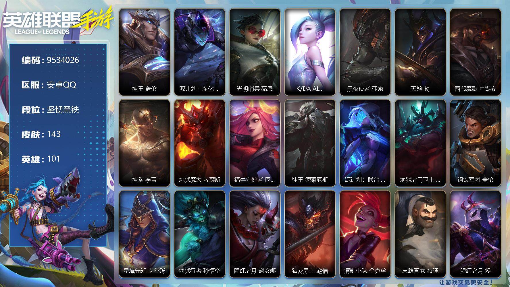 【编号65638】【店长推荐精品号】【商品标题】:101英雄-143皮肤 【传说皮肤】:神王 盖伦,源计划:净化 薇恩,光明哨兵 薇恩,k/da all out 萨勒芬妮,黑夜使者 亚索,天煞 劫,西部魔影 卢锡安,神拳 李青,炼狱魔犬 内瑟斯,福牛守护者 厄运小姐,神王 德莱厄斯,源计划:联合 艾希,地狱之门卫士 加里奥 【史诗皮肤】:钢铁军团 盖伦,星域先知 卡尔玛,地狱行者 孙悟空,腥红之月 黛安娜,猎龙勇士 赵信,清剿小队 金克丝,末路管家 布隆,腥红之月 烬,灭迹行者 烬,腥红之月 崔斯特,k/da all out 卡莎,神龙尊者 玉境灵龙 卡莎,k/da all out 伊芙琳,未来战士 潘森,铁血女忍 阿卡丽,泳池派对 菲奥娜,福牛守护者 菲奥娜,福牛守护者 安妮,k/da all out 阿狸,大魔王 提莫,寒冬精灵 璐璐,秘旅探索者 希瓦娜,破败军团 希瓦娜,炼狱魔女 蔚,晨星之翎 洛,暗星 嘉文四世,福牛守护者 嘉文四世,泳池派对 李青,柯基 库奇,奈落之炎 凯南,盗梦者 内瑟斯,破败军团 厄运小姐,战斗教授 格雷福斯,绝命机甲 格雷福斯,星之守护者 迦娜,玉剑传说 风仙子 迦娜,破败军团 德莱文,神龙尊者 苍龙 艾希,福牛守护者 阿利斯塔,霸天巨兽 墨菲特,冰川巨兽 墨菲特,银河魔装机神 菲兹,虚空海灵 菲兹,奥术大师 吉格斯,电玩勇者 锐雯,暗星 韦鲁斯,光明哨兵 艾瑞莉娅,星域学者 索拉卡,星之守护者 伊泽瑞尔,秘旅探索者 加里奥,猎龙勇士 奥拉夫,踏春来 凯特琳,未来战士 慎,我,怒角 维迦,真实伤害 赛娜,梦境灵探 赛娜,西部魔影 锤石,未来战士 锤石 【赛季皮肤】:s1光耀之刃,s2光耀之芒,s3光耀之灵,s4光耀之心,s5绯金魅影,s6绯金丽刃,s7绯金战斧,s8绯金鮫灵 【其他皮肤】:海上霸主 盖伦,游侠法师 拉克丝,小小骑士 阿木木,暗黑武士 雷恩加尔,猎龙勇士 薇恩,哥特女仆 奥莉安娜,光耀之心 奥莉安娜,光耀之刃 泰达米尔,秘密特工 赵信,光耀之芒 金克丝,双城之战 金克丝,猎龙勇士 布隆,狮心 布隆,探戈灵魂 崔斯特,刀锋女王 莫甘娜,绯金魅影 伊芙琳,钢铁意志 潘森,银色之牙 阿卡丽,皇家守卫 菲奥娜,绯金丽刃 菲奥娜,偶像歌手 阿狸,焰尾妖狐 阿狸,冲击之刃 劫,宗师级钓鱼训练师 贾克斯,烧烤女神 蕾欧娜,游击队员 崔丝塔娜,熊猫 提莫,五连摇滚键盘手 娑娜,邪恶女巫 璐璐,光耀之灵 璐璐,冰霜亚龙 希瓦娜,黯黑魔龙 希瓦娜,女警官 蔚,双城之战 蔚,孤胆英豪 嘉文四世,刺客信条 凯南,腥红之月 凯南,超级英雄 凯南,超武乾坤:电弧 凯南,熔火之心 拉莫斯,制胜金球 拉莫斯,创世魔神 内瑟斯,单身贵族 内瑟斯,西部牛仔 厄运小姐,抵抗军战姬 厄运小姐,暗影 易,热血班长 德莱厄斯,末路教父 格雷福斯,暴风女神 迦娜,德莱德莱 德莱文,绯金战斧 德莱文,极地女神 艾希,女皇 艾希,哞利斯塔 阿利斯塔,黑暗骑士 阿利斯塔,兔宝宝 吉格斯,碎桶者 古拉加斯,鲛妮座人 娜美,绯金鲛灵 娜美,迅箭 韦鲁斯,冲浪高手 辛吉德,炼金狂士 辛吉德,光执事 伊泽瑞尔,冰川勇者 伊泽瑞尔,光明之锤 杰斯,铁哥们儿 奥拉夫,铁血狙击手 凯特琳,腥红之月 鬼武者 慎,枯萎之壤 雷克顿,鳄霸 雷克顿,腥红之月 锤石