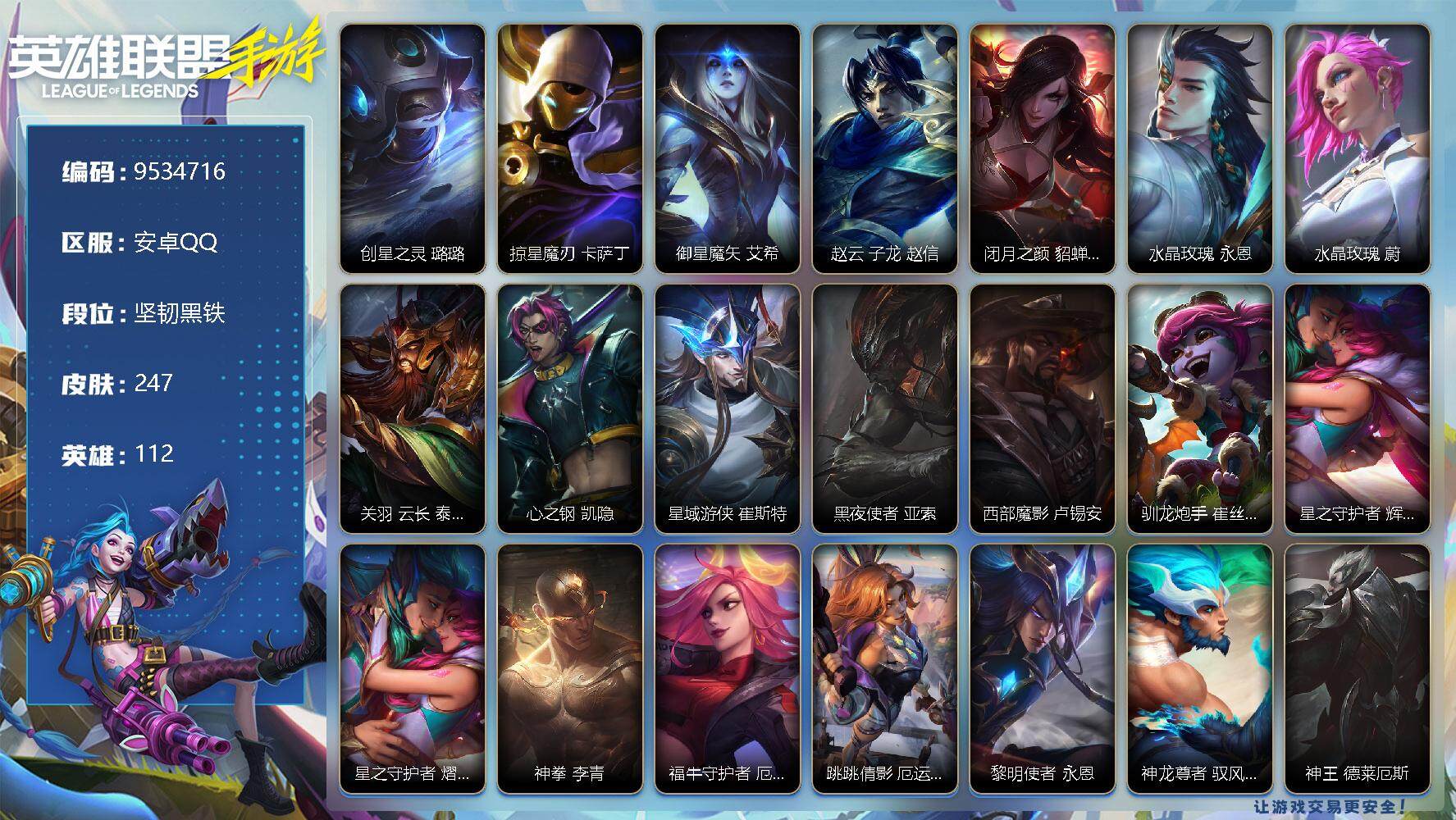 【编号41487】【店长推荐精品号】【商品标题】:112英雄-247皮肤 【限定皮肤】:创星之灵 璐璐,掠星魔刃 卡萨丁,御星魔矢 艾希,赵云 子龙 赵信,闭月之颜 貂蝉 卡特琳娜,水晶玫瑰 永恩,水晶玫瑰 蔚,关羽 云长 泰达米尔 【传说皮肤】:心之钢 凯隐,星域游侠 崔斯特,黑夜使者 亚索,西部魔影 卢锡安,驯龙炮手 崔丝塔娜,星之守护者 辉 霞,星之守护者 熠 洛,神拳 李青,福牛守护者 厄运小姐,跳跳倩影 厄运小姐,黎明使者 永恩,神龙尊者 驭风啸龙 易,神王 德莱厄斯,女主播 迦娜,黎明使者 德莱文,黎明使者 锐雯,灵魂莲华 锤石 【史诗皮肤】:钢铁军团 盖伦,霸天剑魔 亚托克斯,腥红之月 亚托克斯,星之守护者 拉克丝,战斗学院 拉克丝,黎明使者 卡尔玛,星域先知 卡尔玛,地狱行者 孙悟空,水晶玫瑰 薇恩,探梦奇旅 艾克,泳池派对 奥莉安娜,腥红之月 黛安娜,烈焰仙子 黛安娜,焕影迎春 佐伊,恶魔之刃 泰达米尔,赵云 子龙 赵信,霸天异形 卡兹克,暗星 卡兹克,清剿小队 金克丝,喵喵魅影金克丝,烘焙童谣 悠米,末路管家 布隆,西部牛仔 烬,腥红之月 烬,灭迹行者 烬,灰烬领主 奥瑞利安·索尔,圣龙 奥瑞利安·索尔,东恒之曜 奥瑞利安·索尔,电玩女神 卡莎,神龙尊者 玉境灵龙 卡莎,斗魂无双 尼菈,魅惑女巫 莫甘娜,k/da all out 伊芙琳,清剿小队 潘森,未来战士 潘森,k/da all out 阿卡丽,源计划:暗影 阿卡丽,泳池派对 菲奥娜,玉剑传说 无双 菲奥娜,福牛守护者 菲奥娜,苹果机器人 布里茨,战场之王 布里茨,星之守护者 萨勒芬妮,福牛守护者 安妮,灵魂莲华 亚索,幻梦甜心 阿狸,源计划:阴 劫,死亡誓约 劫,灵能特工 劫,武神 贾克斯,灵能特工 凯尔,屠龙勇士 凯尔,源计划:山 蕾欧娜,泳池派对 蕾欧娜,娜就去看看 崔丝塔娜,大魔王 提莫,灵魂莲华 提莫,小蜜蜂 提莫,招财进宝 提莫,电玩女神 娑娜,驯龙女巫 璐璐,创星之灵 璐璐,银河魔装机神 希瓦娜,秘旅探索者 希瓦娜,破败军团 希瓦娜,水晶玫瑰 蔚,燎原烈焰 蔚,晨星之翎 洛,太空律动 “百万调音” 格温,魔女 卡蜜尔,裂帛剪春 卡蜜尔,福牛守护者 嘉文四世,泳池派对 李青,地下拳王 李青,nova 天赋觉醒 李青,柯基 库奇,盗梦者 内瑟斯,破败军团 厄运小姐,源计划:燃 泽丽,龙腾虎跃 瑟提,水晶玫瑰 永恩,西部魔影 德莱厄斯,福牛守护者 德莱厄斯,泳池派对 格雷福斯,禁卫机甲 格雷福斯,战斗教授 格雷福斯,绝命机甲 格雷福斯,星之守护者 迦娜,魅惑女巫 迦娜,灵魂收割者 德莱文,斗魂无双 德莱文,御星魔矢 艾希,福牛守护者 阿利斯塔,霸天巨兽 墨菲特,暗星 墨菲特,虚空海灵 菲兹,绒毛 菲兹,欧米伽小队 鬼影蛙人 菲兹,奥术大师 吉格斯,电玩勇者 锐雯,玉剑传说 武剑仙 锐雯,光明哨兵 锐雯,白色死神 韦鲁斯,暗星 韦鲁斯,战斗学院 卡特琳娜,源代码 索拉卡,地狱火 加里奥,战斗学院 阿克尚,天启骑士 杰斯,神奇先驱 杰斯,掠星魔刃 卡萨丁,灵能特工 莎弥拉,猎龙勇士 奥拉夫,未来战士 慎,苍穹之光 布兰德,神龙尊者 魔龙 布兰德,泳池派对 雷克顿,黯晶巨鳄 雷克顿,我,怒角 维迦,冰糖葫芦 维迦,梦境灵探 赛娜,西部魔影 猎天使恶魔 泰隆,未来战士 锤石,盗梦暗影 锤石,古神 沃里克,宇航员 诺提勒斯,灵魂莲华 莉莉娅,黑夜使者 莉莉娅,雷霆领主 奥恩,魅惑女巫 薇古丝 【赛季皮肤】:s1光耀之刃,s2光耀之芒,s3光耀之灵,s4光耀之心,s5绯金魅影,s6绯金丽刃,s7绯金战斧,s8绯金鮫灵,s9王牌舰长,s10王牌上将,s11王牌勇将,s11王牌司令,s12龙冕先锋 【其他皮肤】:死亡骑士 盖伦,游侠法师 拉克丝,小小骑士 阿木木,暗黑武士 雷恩加尔,脏兮兮 努努和威朗普,斗战胜佛 孙悟空,时之砂 艾克,哥特女仆 奥莉安娜,光耀之心 奥莉安娜,光耀之刃 泰达米尔,关羽 云长 泰达米尔,秘密特工 赵信,龙冕先锋 赵信,死亡绽放 卡兹克,末路狂花 金克丝,光耀之芒 金克丝,猎龙勇士 布隆,狮心 布隆,赌侠 崔斯特,探戈灵魂 崔斯特,王牌舰长 崔斯特,刀锋女王 莫甘娜,探戈灵魂 伊芙琳,绯金魅影 伊芙琳,银色之牙 阿卡丽,超武乾坤:暗影 阿卡丽,皇家守卫 菲奥娜,绯金丽刃 菲奥娜,擂台皇帝 布里茨,兔宝宝 布里茨,小红帽 安妮,西部牛仔 亚索,偶像歌手 阿狸,焰尾妖狐 阿狸,风纪委员 阿狸,冲击之刃 劫,光明骑士 贾克斯,末世天使 凯尔,绝命呛手 卢锡安,熊猫 提莫,五连摇滚键盘手 娑娜,缪斯女神 娑娜,邪恶女巫 璐璐,光耀之灵 璐璐,冰霜亚龙 希瓦娜,黯黑魔龙 希瓦娜,铁拳执事 蔚,女警官 蔚,双城之战 蔚,孤胆英豪 嘉文四世,王牌上将 嘉文四世,海牛骑手 库奇,刺客信条 凯南,超级英雄 凯南,超武乾坤:电弧 凯南,泳池派对 蒙多医生,战争血统 蒙多医生,熔火之心 拉莫斯,制胜金球 拉莫斯,单身贵族 内瑟斯,西部牛仔 厄运小姐,女帝 厄运小姐,抵抗军战姬 厄运小姐,暗影 易,德莱德莱 德莱文,绯金战斧 德莱文,极地女神 艾希,女皇 艾希,王牌司令 艾希,哞利斯塔 阿利斯塔,黑暗骑士 阿利斯塔,无畏号 墨菲特,黑曜石守护者 墨菲特,兔宝宝 菲兹,科学狂人 吉格斯,兔宝宝 吉格斯,飞车暴走族 古拉加斯,碎桶者 古拉加斯,鲛妮座人 娜美,绯金鲛灵 娜美,苍穹之光 韦鲁斯,迅箭 韦鲁斯,冰霜之刃 艾瑞莉娅,闭月之颜 貂蝉 卡特琳娜,抵抗军玫瑰 卡特琳娜,炼金狂士 辛吉德,蕉泥座人 索拉卡,光执事 伊泽瑞尔,冰川勇者 伊泽瑞尔,风执事 加里奥,先驱行者 卡萨丁,铁哥们儿 奥拉夫,黑暗骑士 奥拉夫,王牌勇将 奥拉夫,铁血狙击手 凯特琳,腥红之月 