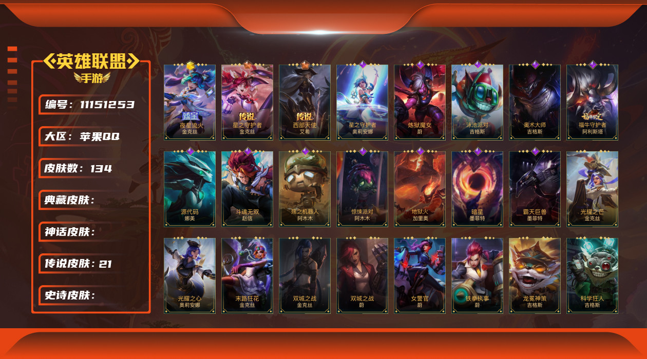 可二次 可修改实名 21传说 49史诗 134皮肤 128英雄 大师 皮肤:金克丝-夜星流火金克丝-光耀之芒金克丝-星之守护者金克丝-末路狂花金克丝-双城之战蔚-双城之战蔚-女警官蔚-炼狱魔女蔚-铁拳执事吉格斯-泳池派对吉格斯-奥术大师吉格斯-龙冕神策吉格斯-科学狂人