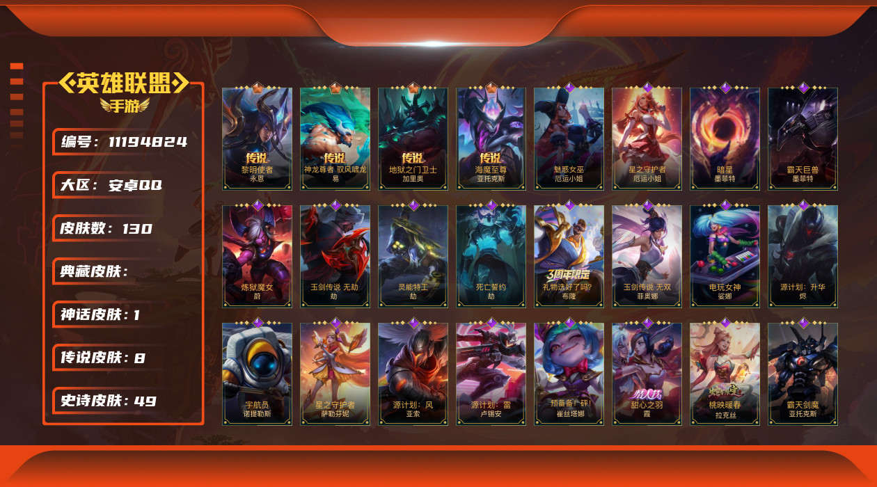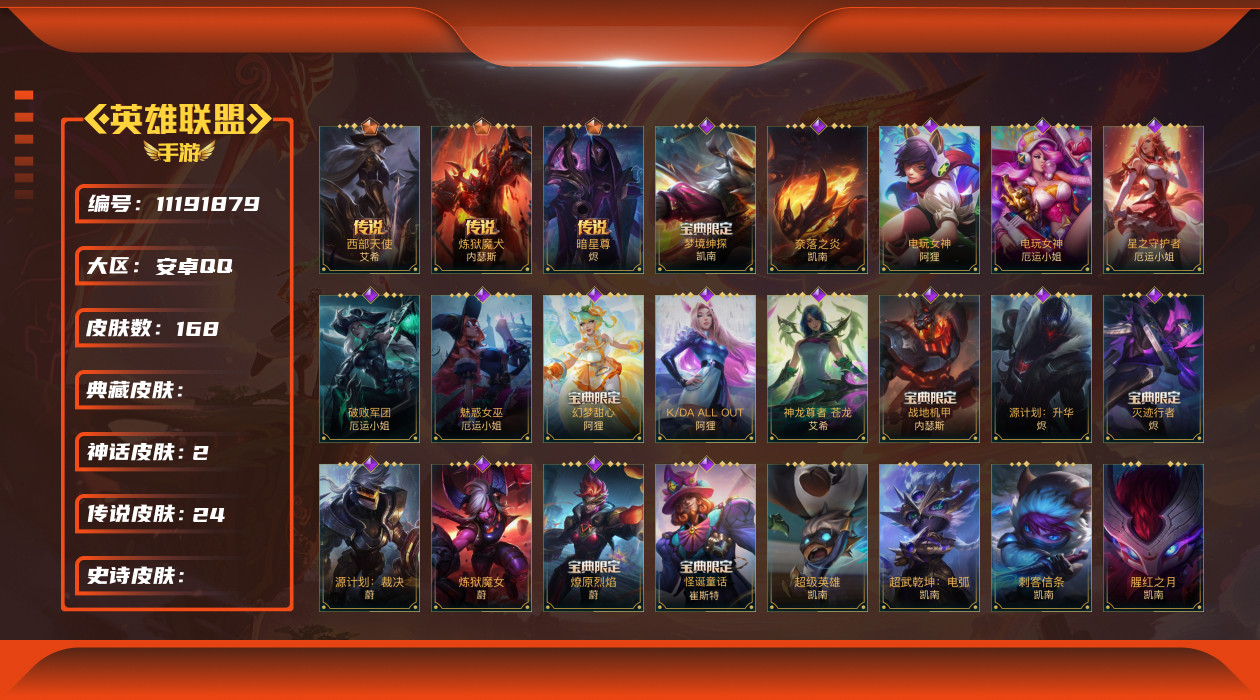 可二次 可修改实名 2神话 24传说 73史诗 168皮肤 128英雄 钻石 皮肤:凯南-超级英雄凯南-超武乾坤:电弧凯南-刺客信条凯南-梦境绅探凯南-奈落之炎凯南-腥红之月厄运小姐-电玩女神厄运小姐-星之守护者厄运小姐-破败军团厄运小姐-魅惑女巫厄运小姐-西部牛仔阿狸