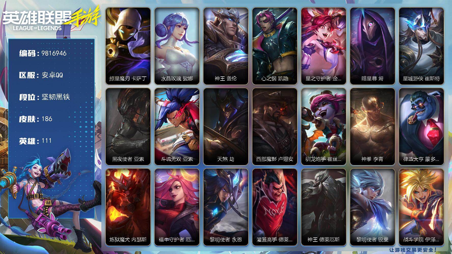 【编号18537】【店长推荐精品号】【商品标题】:111英雄-186皮肤 【限定皮肤】:掠星魔刃 卡萨丁,水晶玫瑰 娑娜 【传说皮肤】:神王 盖伦,心之钢 凯隐,星之守护者 金克丝,暗星尊 烬,星域游侠 崔斯特,黑夜使者 亚索,斗魂无双 亚索,天煞 劫,西部魔影 卢锡安,驯龙炮手 崔丝塔娜,神拳 李青,律政大亨 蒙多医生,炼狱魔犬 内瑟斯,福牛守护者 厄运小姐,黎明使者 永恩,灌篮高手 德莱厄斯,神王 德莱厄斯,黎明使者 锐雯,战斗学院 伊泽瑞尔,地狱之门卫士 加里奥 【史诗皮肤】:星之守护者 拉克丝,惊悚派对 阿木木,殇之机器人 阿木木,星域先知 卡尔玛,丧尸 努努和威朗普,探梦奇旅 艾克,暗星 奥莉安娜,星之守护者 奥莉安娜,腥红之月 黛安娜,无限烈焰 黛安娜,平湖秋月 黛安娜,猛虎下山 赵信,暗星 卡兹克,烘焙童谣 悠米,圣诞老人 布隆,腥红之月 烬,圣龙 奥瑞利安·索尔,东恒之曜 奥瑞利安·索尔,弹幕天使 卡莎,电玩女神 卡莎,斗魂无双 尼菈,k/da all out 伊芙琳,猎龙勇士 潘森,源计划:火 菲奥娜,泳池派对 菲奥娜,福牛守护者 菲奥娜,战场之王 布里茨,福牛守护者 安妮,战场之王 亚索,灵能特工 劫,欧米伽小队 魔鬼伞兵 崔丝塔娜,娜就去看看 崔丝塔娜,大魔王 提莫,灵魂莲华 提莫,小蜜蜂 提莫,水晶玫瑰 娑娜,泳池派对 璐璐,银河魔装机神 希瓦娜,秘旅探索者 希瓦娜,魔女 卡蜜尔,福牛守护者 嘉文四世,奈落之炎 凯南,光源盛放 婕拉,心之钢 瑟提,心之钢 永恩,西部魔影 德莱厄斯,福牛守护者 德莱厄斯,战斗教授 格雷福斯,神龙尊者 苍龙 艾希,海之歌 艾希,福牛守护者 阿利斯塔,霸天巨兽 墨菲特,冰川巨兽 墨菲特,虚空海灵 菲兹,欧米伽小队 鬼影蛙人 菲兹,奥术大师 吉格斯,电玩勇者 锐雯,灵魂莲华 锐雯,白色死神 韦鲁斯,暗星 韦鲁斯,玉剑传说 舞剑仙 艾瑞莉娅,光明哨兵 艾瑞莉娅,战斗学院 卡特琳娜,星之守护者 伊泽瑞尔,心之钢 伊泽瑞尔,秘旅探索者 加里奥,战斗学院 阿克尚,神奇先驱 杰斯,霸天战车 厄加特,掠星魔刃 卡萨丁,梦境灵探 赛娜,怨之砂 派克,未来战士 锤石,盗梦暗影 锤石,灵魂莲华 莉莉娅,黑夜使者 莉莉娅,雷霆领主 奥恩 【赛季皮肤】:s1光耀之刃,s2光耀之芒,s3光耀之灵,s4光耀之心,s5绯金魅影,s6绯金丽刃,s7绯金战斧,s8绯金鮫灵,s9王牌舰长,s10王牌上将,s11王牌勇将,s11王牌司令,s12龙冕先锋 【其他皮肤】:死亡骑士 盖伦,游侠法师 拉克丝,小小骑士 阿木木,暗黑武士 雷恩加尔,脏兮兮 努努和威朗普,斗战胜佛 孙悟空,时之砂 艾克,哥特女仆 奥莉安娜,光耀之心 奥莉安娜,国王 泰达米尔,光耀之刃 泰达米尔,秘密特工 赵信,龙冕先锋 赵信,光耀之芒 金克丝,猎龙勇士 布隆,王牌舰长 崔斯特,刀锋女王 莫甘娜,探戈灵魂 伊芙琳,绯金魅影 伊芙琳,钢铁意志 潘森,银色之牙 阿卡丽,皇家守卫 菲奥娜,绯金丽刃 菲奥娜,擂台皇帝 布里茨,小红帽 安妮,西部牛仔 亚索,腥红之月 亚索,偶像歌手 阿狸,焰尾妖狐 阿狸,冲击之刃 劫,光明骑士 贾克斯,绝命呛手 卢锡安,烧烤女神 蕾欧娜,兔宝宝 提莫,熊猫 提莫,五连摇滚键盘手 娑娜,邪恶女巫 璐璐,光耀之灵 璐璐,冰霜亚龙 希瓦娜,铁拳执事 蔚,双城之战 蔚,王牌上将 嘉文四世,海牛骑手 库奇,刺客信条 凯南,腥红之月 凯南,超级英雄 凯南,超武乾坤:电弧 凯南,战争血统 蒙多医生,熔火之心 拉莫斯,制胜金球 拉莫斯,创世魔神 内瑟斯,单身贵族 内瑟斯,西部牛仔 厄运小姐,暗影 易,热血班长 德莱厄斯,无情重炮 格雷福斯,黑暗骑士 格雷福斯,暴风女神 迦娜,金牌主播 德莱文,德莱德莱 德莱文,绯金战斧 德莱文,女皇 艾希,黑暗骑士 艾希,王牌司令 艾希,黑暗骑士 阿利斯塔,无畏号 墨菲特,兔宝宝 菲兹,兔宝宝 吉格斯,碎桶者 古拉加斯,绯金鲛灵 娜美,苍穹之光 韦鲁斯,迅箭 韦鲁斯,莲花之令 艾瑞莉娅,海贼魅影 卡特琳娜,抵抗军玫瑰 卡特琳娜,冲浪高手 辛吉德,炼金狂士 辛吉德,蕉泥座人 索拉卡,冰川勇者 伊泽瑞尔,风执事 加里奥,光明之锤 杰斯,先驱行者 卡萨丁,黑暗骑士 奥拉夫,王牌勇将 奥拉夫,铁血狙击手 凯特琳,腥红之月 鬼武者 慎,枯萎之壤 雷克顿,鳄霸 雷克顿,穿着正装的恶魔 维迦