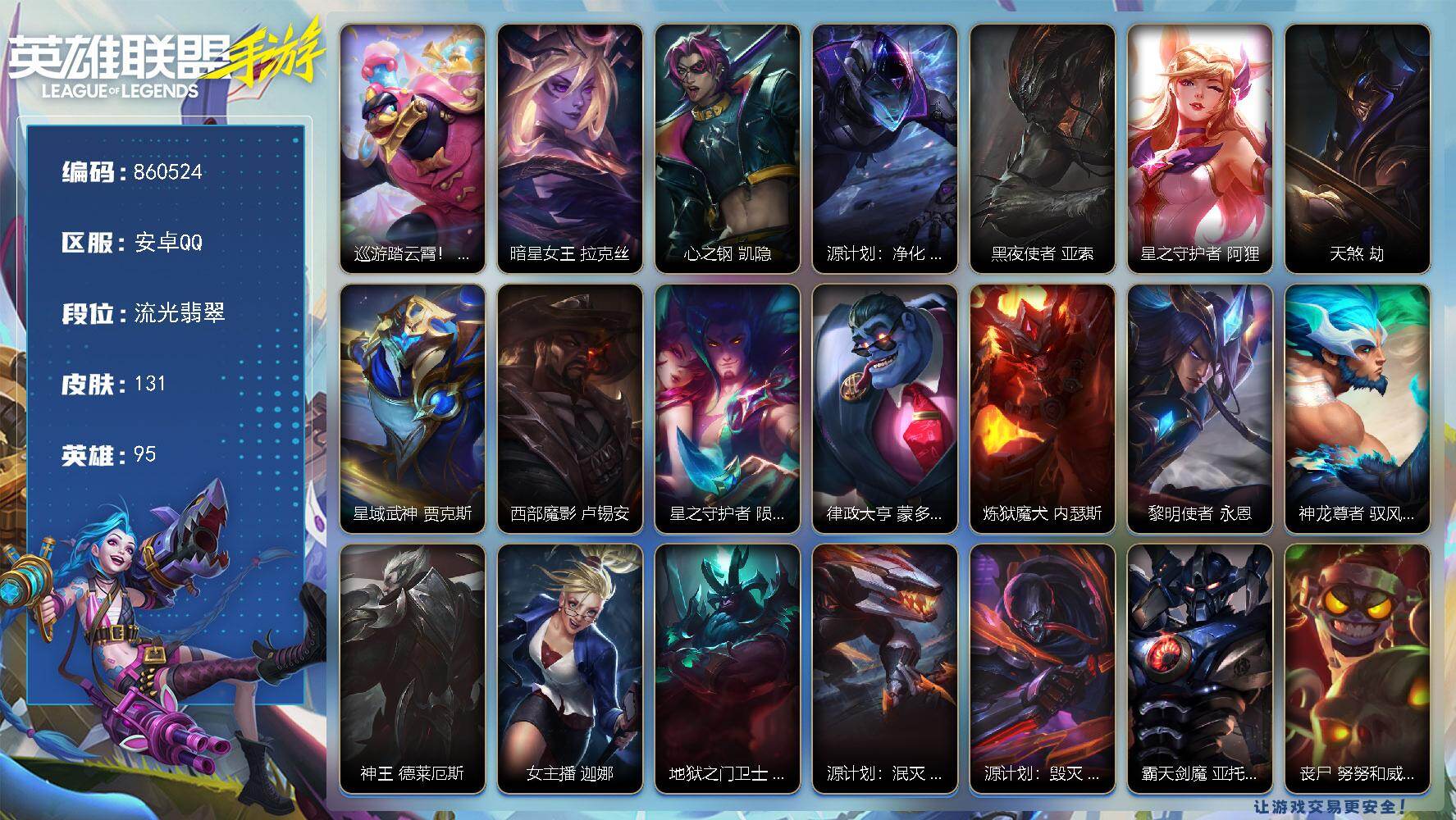 【安卓q-英雄133-皮肤138-传说14 史诗41】段位流光翡翠 福牛守护者女呛 光明哨兵薇恩 黑夜使者亚索 黎明使者锐雯 神拳盲僧 神王盖伦 西部天使寒冰 西部天使赛娜 暗星尊 驯龙炮手 太空律动机器人 星之守护者 陨 腥红之月烬 清剿小队金克丝 清剿小队潘森 战斗学院阿克尚 神龙尊者 玉境灵龙 魅惑女巫莫甘娜 泳池派对盲僧 源计划:裁决 源计划:暗影 玉剑传说 风仙子 源代码青钢影 玉剑传说