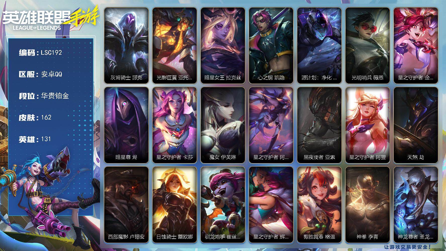 【lsc192】131英雄/162皮肤/1神话/27传说/67史诗/华贵铂金/灰烬骑士派克/光影巨翼亚托克斯/暗星女王拉克丝/心之钢凯隐/源计划:净化薇恩/光明哨兵薇恩/星之守护者金克丝/暗星尊烬/星之守护者卡莎/魔女伊芙琳/星之守护者 阿卡丽/黑夜使者亚索/星之守护者阿狸/天煞劫/西部魔影卢锡安/日蚀骑士蕾欧娜/驯龙炮手崔丝塔娜/星之守护者辉霞/剪胜裁春格温/神拳李青/神龙尊者 圣龙 李青/