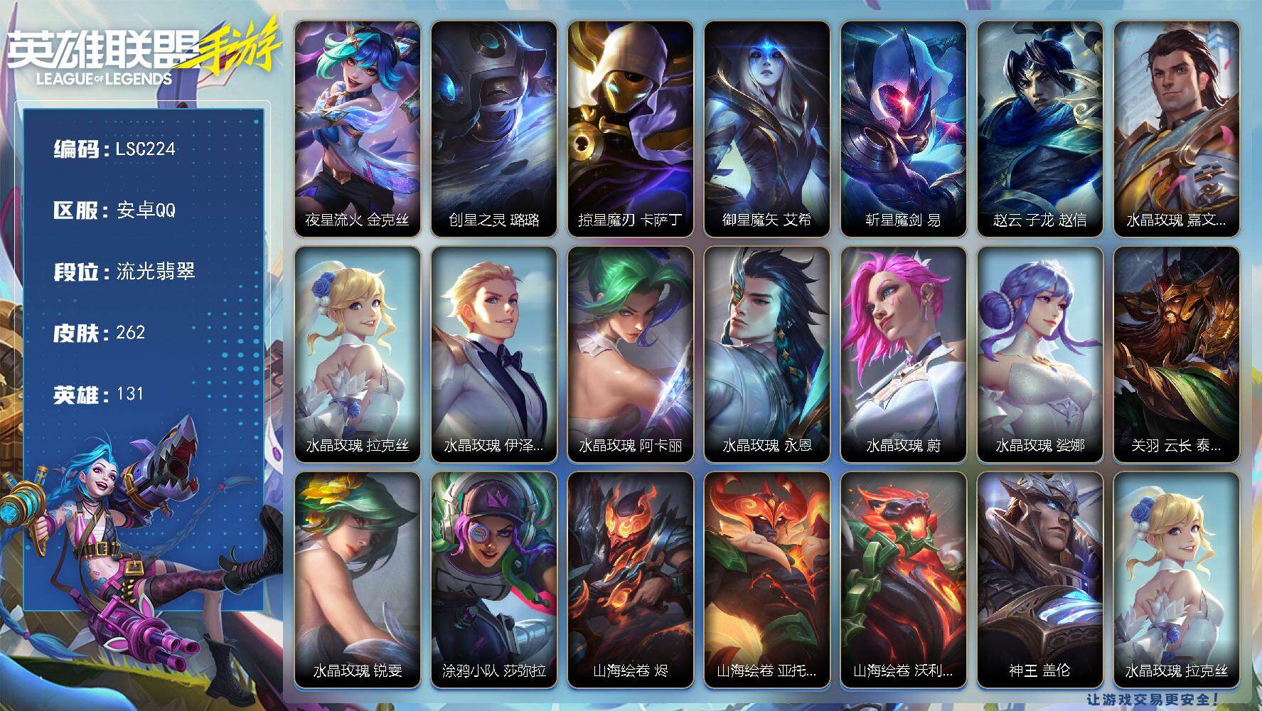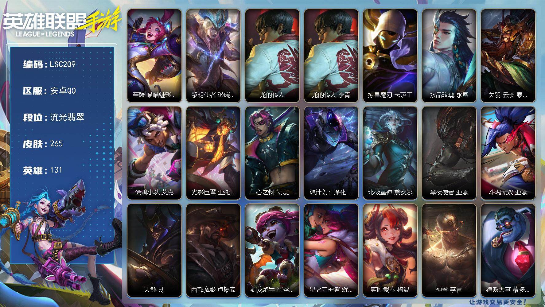 【lsc209】131英雄/265皮肤/2神话/24传说/130史诗/流光翡翠/至臻 喵喵魅影 金克丝/黎明使者 破晓之殇 佛耶戈/龙的传人 李青/掠星魔刃 卡萨丁/水晶玫瑰 永恩/关羽 云长 泰达米尔/涂鸦小队 艾克/光影巨翼 亚托克斯/心之钢 凯隐/源计划:净化 薇恩/北极星神 黛安娜/黑夜使者 亚索/斗魂无双 亚索/天煞 劫/西部魔影 卢锡安/驯龙炮手 崔丝塔娜/星之守护者 辉 霞/剪胜裁春 格温/神拳 李青/律政大亨 蒙多医生/炼狱魔犬 内瑟斯/福牛守护者 厄运小姐/黎明使者 永恩/灌篮高手 德莱厄斯/神王 德莱厄斯/源计划:联合 艾希/西部天使 艾希/黎明使者 锐雯/战斗学院 伊泽瑞尔/最终boss 维迦/西部天使 赛娜/钢铁军团 盖伦/霸天剑魔 亚托克斯/腥红之月 亚托克斯/惊悚派对 阿木木/殇之机器人 阿木木/地狱火 阿木木/摄魂猎手 凯隐/霸天战士 雷恩加尔/雷喵喵尔 雷恩加尔/黎明使者 卡尔玛/星域先知 卡尔玛/神龙尊者 宁静之龙 卡尔玛/丧尸 努努和威朗普/地狱行者 孙悟空/探梦奇旅 艾克/暗星 奥莉安娜/泳池派对 奥莉安娜/腥红之月 黛安娜/无限烈焰 黛安娜/恶魔之刃 泰达米尔/猛虎下山 赵信/霸天异形 卡兹克/暗星 卡兹克/西部魔影 赫卡里姆/烘焙童谣 悠米/末路管家 布隆/猛虎 布隆/礼物选好了吗? 布隆/源计划:升华 烬/西部牛仔 烬/灭迹行者 烬/霸天龙神 奥瑞利安·索尔/东恒之曜 奥瑞利安·索尔/腥红之月 崔斯特/春晖仙子 卡莎/魅惑女巫 莫甘娜/k/da all out 伊芙琳/铁血女忍 阿卡丽/源计划:火 菲奥娜/泳池派对 菲奥娜/玉剑传说 无双 菲奥娜/福牛守护者 菲奥娜/苹果机器人 布里茨/银河魔装机神 安妮/源计划:风 亚索/电玩女神 阿狸/k/da all out 阿狸/幻梦甜心 阿狸/源计划:阴 劫/死亡誓约 劫/灵能特工 劫/武神 贾克斯/灵能特工 凯尔/屠龙勇士 凯尔/源计划:山 蕾欧娜/欧米伽小队 魔鬼伞兵 崔丝塔娜/我,羽饰骑士 崔丝塔娜/虎头虎脑 崔丝塔娜/灵魂莲华 提莫/小蜜蜂 提莫/泳池派对 璐璐/驯龙女巫 璐璐/破败军团 希瓦娜/炼狱魔女 蔚/燎原烈焰 蔚/暮星之羽 霞/太空律动 “百万调音” 格温/源代码 卡蜜尔/魔女 卡蜜尔/星域审判官 卡蜜尔/裂帛剪春 卡蜜尔/福牛守护者 嘉文四世/黎明使者 佛耶戈/神龙尊者 均衡之龙 沃利贝尔/泳池派对 李青/地下拳王 李青/电玩上校 库奇/奈落之炎 凯南/盗梦者 内瑟斯/太空律动 “狗头” 内瑟斯/源计划:燃 泽丽/灵魂莲华 永恩/持胡萝卜的雪人 易/玉剑传说 无极 易/西部魔影 德莱厄斯/泳池派对 格雷福斯/禁卫机甲 格雷福斯/战斗教授 格雷福斯/绝命机甲 格雷福斯/星之守护者 迦娜/玉剑传说 风仙子 迦娜/灵魂收割者 德莱文/神龙尊者 苍龙 艾希/霸天巨兽 墨菲特/暗星 墨菲特/虚空海灵 菲兹/奥术大师 吉格斯/泳池派对 吉格斯/玉剑传说 寒潭夭夭 娜美/电玩勇者 锐雯/玉剑传说 武剑仙 锐雯/光明哨兵 锐雯/白色死神 韦鲁斯/玉剑传说 舞剑仙 艾瑞莉娅/西部天使 艾瑞莉娅/斗魂无双 艾瑞莉娅/死亡誓约 卡特琳娜/战斗学院 卡特琳娜/秘旅探索者 加里奥/天启骑士 杰斯/神奇先驱 杰斯/战地机甲 厄加特/灵能特工 莎弥拉/猎龙勇士 奥拉夫/黯晶巨鳄 雷克顿/欧米伽小队 天雷爆破手 维迦/冰糖葫芦 维迦/星之守护者 赛娜/怨之砂 派克/西部魔影 猎天使恶魔 泰隆/西部魔影 锤石/盗梦暗影 锤石/古神 沃里克/宇航员 诺提勒斯/灵魂莲华 莉莉娅/黑夜使者 莉莉娅/梦游仙境 莉莉娅/红帽迷影 薇古丝/s1光耀之刃/s2光耀之芒/s3光耀之灵/s4光耀之心/s5绯金魅影/s6绯金丽刃/s7绯金战斧/s8绯金鮫灵/s9王牌舰长/s10王牌上将/s11王牌勇将/s11王牌司令/s12龙冕先锋/s13龙冕御盾/s14龙冕神策/s15龙冕异士/s16冠翎飞行员/s17冠翎御风使/s18冠翎巨神像/s19冠翎征服者/海上霸主 盖伦/小小骑士 阿木木/暗黑武士 雷恩加尔/脏兮兮 努努和威朗普/三昧真火 孙悟空/苍穹之光 薇恩/猎龙勇士 薇恩/时之砂 艾克/哥特女仆 奥莉安娜/光耀之心 奥莉安娜/国王 泰达米尔/光耀之刃 泰达米尔/秘密特工 赵信/龙冕先锋 赵信/死亡绽放 卡兹克/末路狂花 金克丝/光耀之芒 金克丝/猎龙勇士 布隆/狮心 布隆/龙冕御盾 布隆/龙冕异士 烬/赌侠 崔斯特/探戈灵魂 崔斯特/王牌舰长 崔斯特/冠翎征服者 尼菈/刀锋女王 莫甘娜/探戈灵魂 伊芙琳/绯金魅影 伊芙琳/钢铁意志 潘森/银色之牙 阿卡丽/皇家守卫 菲奥娜/绯金丽刃 菲奥娜/擂台皇帝 布里茨/兔宝宝 布里茨/冰霜烈焰 安妮/小红帽 安妮/西部牛仔 亚索/腥红之月 亚索/偶像歌手 阿狸/风纪委员 阿狸/冲击之刃 劫/光明骑士 贾克斯/末世天使 凯尔/熊猫 提莫/五连摇滚键盘手 娑娜/缪斯女神 娑娜/光耀之灵 璐璐/冰霜亚龙 希瓦娜/铁拳执事 蔚/孤胆英豪 嘉文四世/王牌上将 嘉文四世/至高之拳 李青/海牛骑手 库奇/冠翎飞行员 库奇/刺客信条 凯南/超级英雄 凯南/超武乾坤:电弧 凯南/熔火之心 拉莫斯/制胜金球 拉莫斯/单身贵族 内瑟斯/女帝 厄运小姐/抵抗军战姬 厄运小姐/热血班长 德莱厄斯/末路教父 格雷福斯/无情重炮 格雷福斯/黑暗骑士 格雷福斯/暴风女神 迦娜/冠翎御风使 迦娜/德莱德莱 德莱文/绯金战斧 德莱文/极地女神 艾希/女皇 艾希/黑暗骑士 艾希/王牌司令 艾希/哞利斯塔 阿利斯塔/黑暗骑士 阿利斯塔/无畏号 墨菲特/兔宝宝 菲兹/兔宝宝 吉格斯/龙冕神策 吉格斯/飞车暴走族 古拉加斯/碎桶者 古拉加斯/河水之灵 娜美/绯金鲛灵 娜美/苍穹之光 韦鲁斯/迅箭 韦鲁斯/冰霜之刃 艾