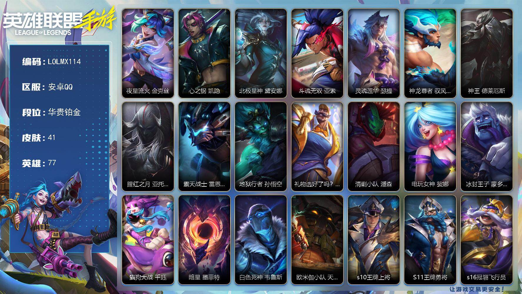 【lolmx114】77英雄/41皮肤/1神话/6传说/11史诗/华贵铂金/夜星流火 金克丝/心之钢 凯隐/北极星神 黛安娜/斗魂无双 亚索/灵魂莲华 瑟提/神龙尊者 驭风啸龙 易/神王 德莱厄斯/腥红之月 亚托克斯/霸天战士 雷恩加尔/地狱行者 孙悟空/礼物选好了吗? 布隆/清剿小队 潘森/电玩女神 娑娜/冰封王子 蒙多医生/猫狗大战 千珏/暗星 墨菲特/白色死神 韦鲁斯/欧米伽小队 天雷爆破手 维迦/s10王牌上将/s11王牌勇将/s16冠翎飞行员/s17冠翎御风使/s18冠翎巨神像/国王 泰达米尔/秘密特工 赵信/探戈灵魂 伊芙琳/偶像歌手 阿狸/焰尾妖狐 阿狸/冲击之刃 劫/烧烤女神 蕾欧娜/五连摇滚键盘手 娑娜/冰霜亚龙 希瓦娜/女警官 蔚/王牌上将 嘉文四世/海牛骑手 库奇/冠翎飞行员 库奇/单身贵族 内瑟斯/女帝 厄运小姐/暗影 易/冠翎御风使 迦娜/哞利斯塔 阿利斯塔/兔宝宝 吉格斯/飞车暴走族 古拉加斯/冠翎巨神像 加里奥/王牌勇将 奥拉夫/鳄霸 雷克顿