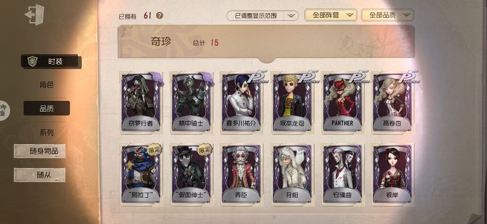 [16508054]华为 手机账号 61时装 2金皮 15紫皮 6随从 37随身物品 【时装】:野人-弄臣杂技演员-雨宫莲魔术师-“假面绅士”厂长-“阿拉丁”“杰克”-林中骑士红蝶-彼岸红夫人-赤宴舞女-高卷杏舞女-panther先知-月相孽蜥-窃梦行者前锋-坂本龙司入殓师-喜多川祐介宿伞之魂-安魂曲 【随身物品】:结冰的齿轮(奇珍)加拉尔奇珍玫瑰手杖蓝奇珍梦魇结晶稀世白羽奇珍电阻表奇珍火焰精灵奇珍星星糖奇珍星象仪奇珍厌离稀世誓言奇珍甜筒奇珍