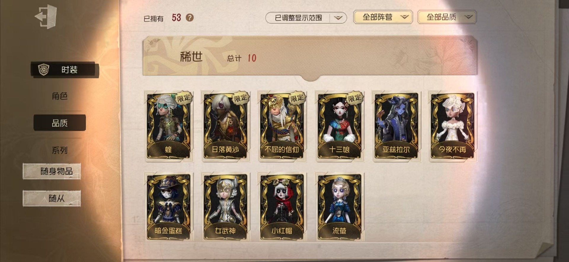 [14337930]苹果官服 手机账号 53时装 10金皮 9紫皮 2随从 6随身物品 【时装】:医生-流萤蜘蛛-窥伺之心咒术师-“向导”26号守卫-西部大亨空军-黑天鹅之羽勘探员-雀舌机械师-小红帽红蝶-十三娘舞女-女武神调香师-今夜不再调酒师-黑玫瑰守墓人-日落黄沙先知-观测者先知-不屈的信仰盲女-暗金蛋糕梦之女巫-羽蛇宿伞之魂-箭竹摄影师-亚兹拉尔“囚徒”-蝰