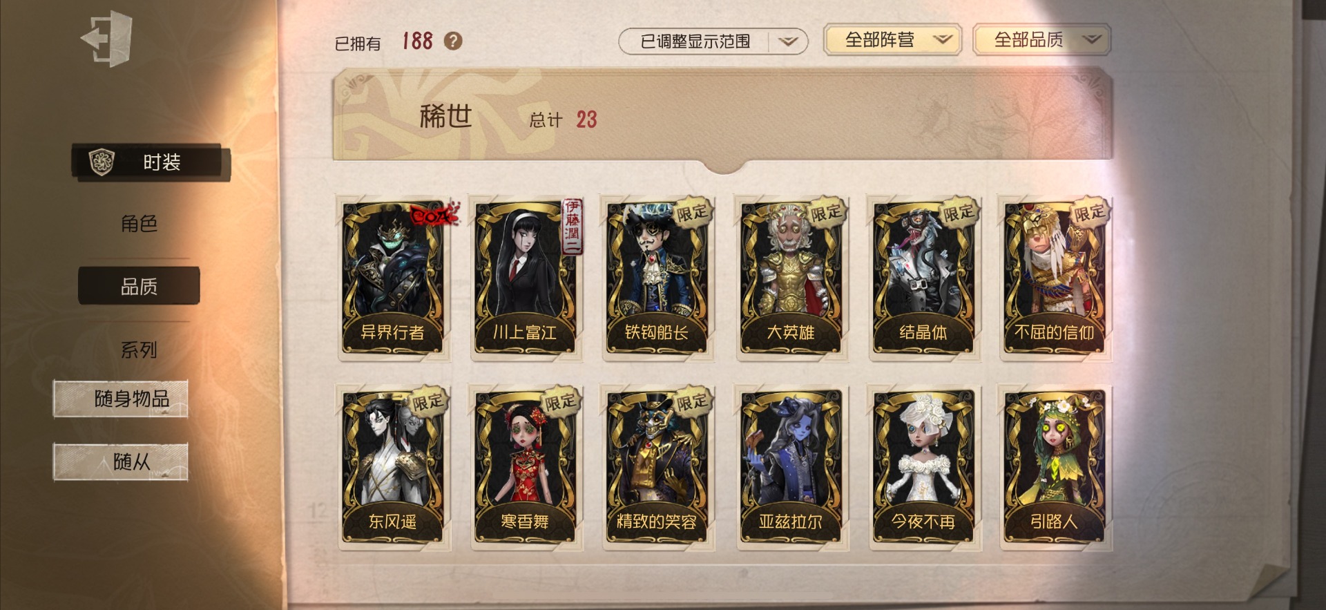 [14618116]苹果官服 手机账号 188时装 23金皮 57紫皮 8随从 60随身物品 【时装】:医生-流萤野人-大英雄佣兵-缚咒法老园丁-幽灵公主园丁-真相小姐26号守卫-西部大亨空军-新岛真空军-queen空军-寒香舞祭司-撒玛拉机械师-小红帽祭司-引路人鹿头-蒸汽朋克鹿头-刻律涅之伤魔术师-寻宝贵族大副-铁钩船长疯眼-禁闭院长“杰克”-斯文加利“杰克”-忘川渡人红蝶-花嫁红蝶-白无垢黄衣之主-死灵师舞女-金舞女-女武神舞女-恶之花调香师-时之砂调香师-今夜不再小丑-小丑皇医生-雨中曲小丑-异界行者小丑-精致的笑容幸运儿-双一先知-月相先知-历战猎人先知-观测者先知-独行者先知-不屈的信仰孽蜥-结晶体孽蜥-窃梦行者前锋-坂本龙司盲女-暗金蛋糕冒险家-发明家梦之女巫-川上富江梦之女巫-羽蛇摄影师-亚兹拉尔宿伞之魂-十字路口的美少年摄影师-阿波罗宿伞之魂-东风遥入殓师-哈姆雷特