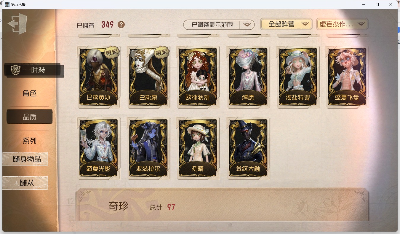 [16587875]安卓官服 手机账号 349时装 16金皮 97紫皮 16随从 138随身物品 【时装】园丁-源自星辰园丁初晴爱丽丝·德罗斯-片刻闲暇渔女-破魔之刃隐士-升学礼蜘蛛-时之猎手咒术师-缄默者野人-雪原猎人“小女孩”-欧律狄刻摄影师-安宁“慈善家”-鎏金的表演大师小女孩-石榴蝶小姐咒术师-噬恶之渊机械师-莎莉红蝶-融化的泪琥珀气象学家-茶歇小姐摄影师-盛夏光影调香师-聂莫黎古董商-陶梦嫣幸运儿-“未知射线”x守墓人-冥契 黄衣之主-衣帽架先生“心理学家”-恒梦爱哭鬼-善恶的本性骑士-ment k歌剧演员-拂晓女士空军-梅爱丽病患-休塔尔克昆虫学者-缚愿26号守卫-秘密大厨记者-恐惧的旧影冒险家-赞因弓箭手-发散谱r音核裂响“法罗女士”-向深处求告作曲家-暮影画家-掌中篆记噩梦-溃夜猎者雕刻家-善忘的海马体佣兵-弦音畸变火灾调查员-“膨化”时空之影-“有机磷”“法罗女士”-芳泽霞蜘蛛-聚光灯下“愚人金”-辉锑矿勘探员-盛夏飞盘邮差-华生医生记者-梦境中的爱丽丝小说家-“伊始新篇”哭泣小丑-熄灭的太阳画家-多色印刷木偶师-义体再构“博士”-“裁纸机”蜘蛛-不息载械“小女孩”-异动指针拉拉队员-采集速巡空军-琼楼遗恨空军-新岛真祭司-“朝圣者”祭司-梦之使者机械师-诡笑症蜡像师-淋浴昆虫学者-曼陀罗厂长-永恒之王爱哭鬼-被时间遗忘的男孩“杰克”-白纹大触“杰克”-金纹大触红蝶-竹华红夫人-最后一舞冒险家-考古教授舞女-恶之花玩具商-纸翼小姐小丑-异界行者小丑-焗炉调香师-致命温柔调香师-猩红新娘调香师-lady k调香师-红菱艳调酒师-海盐特调幸运儿-女仆装园丁-奥村春先知-历战猎人先知-观测者先知-独行者孽蜥-窃梦行者孽蜥-骨笛牛仔-教鞭前锋-坂本龙司前锋-skull牛仔-逆刃之鞭盲女-吉尔达牛仔-部族勇士摄影师-亚兹拉尔摄影师-月下绅士摄影师-阿波罗摄影师-暮剑“使徒”-白松露守墓人-日落黄沙守墓人-奶酪宿伞之魂-日月相随宿伞之魂-安魂曲宿伞之魂-残花泪 【随身物品】沙滩镜(奇珍)微缩星球(奇珍)沙漠精灵(奇珍)致命的邀请函稀世充气海豚奇珍枯萎的花