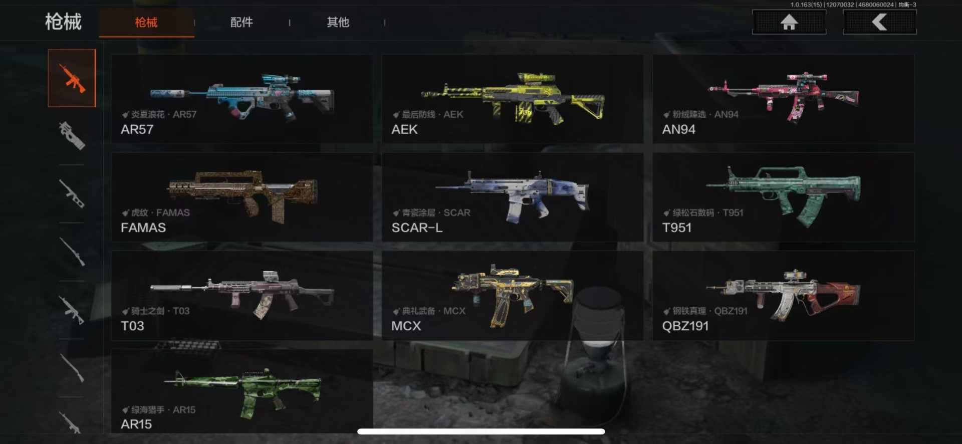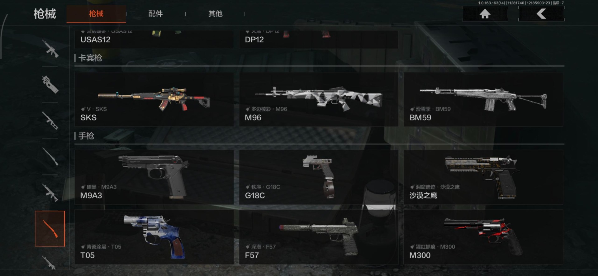 【近战武器】:s-07折刀,空腔战术 【金色呛皮】:竞技fal,伦琴幻影fal,告丧夜曲ar57,战术大师aek,战术大师an94,浮鳞影青q192,利齿风暴m,旧王圣谕vss
