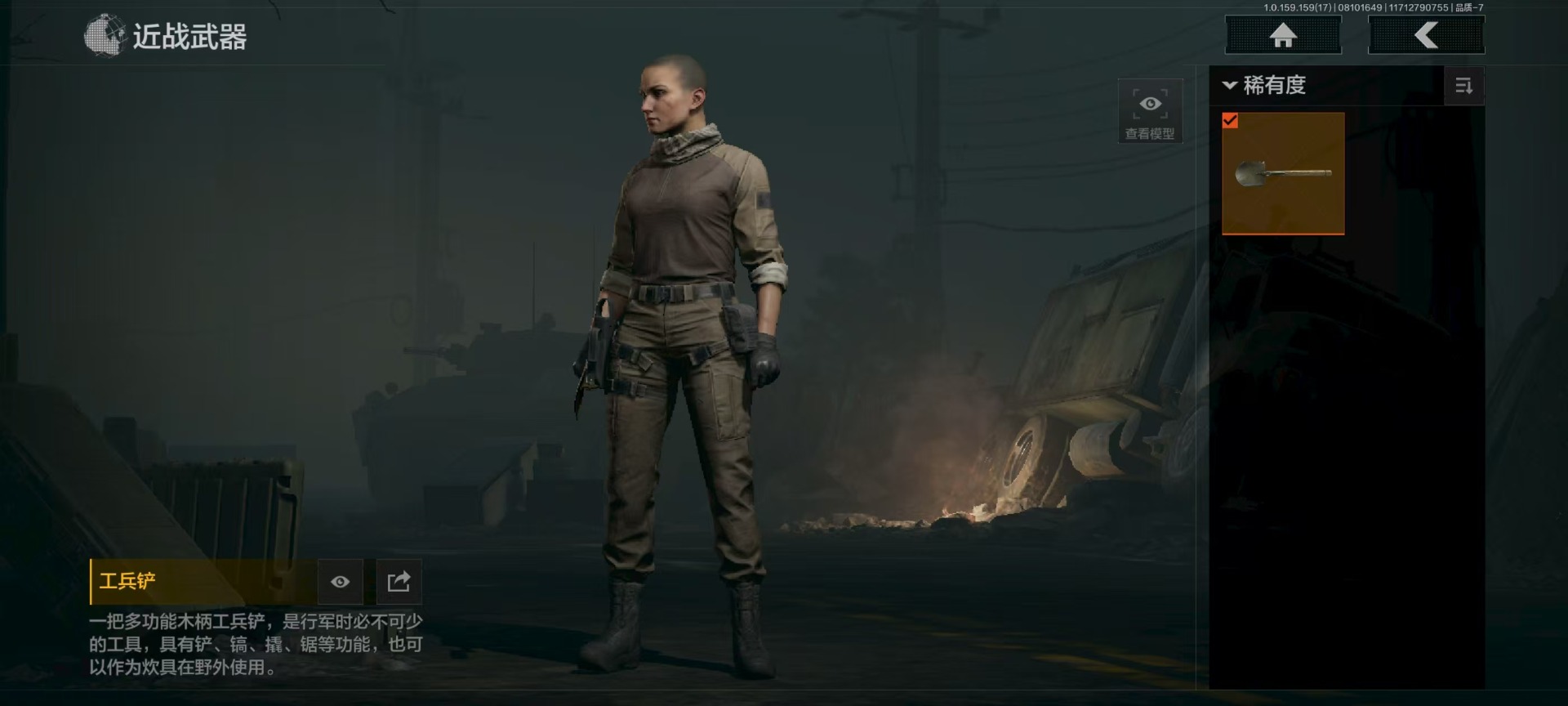 库存价值20.1 1近战武器 可修改实名 柯恩币数量:0 近战武器:工兵铲
