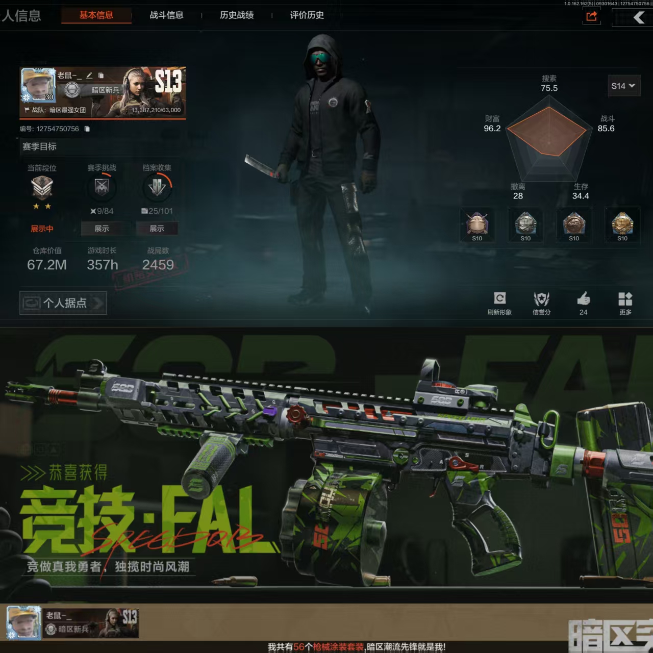 [12191264]暗区 可二次 现金号 仓库价值67.2m 2金呛皮 竞技·fal 棱光裂变·qbu191 5600万现金 理想国 骤羽尖啸·m4a1 竞技·aug 骤羽尖啸·m 都市夜影套装