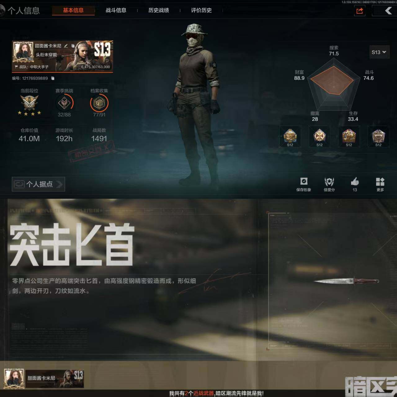 [10447083]暗区 可二次 1刀 2金呛 仓库价值41m 4096万现金 突击匕首 钢铁真理·q191 旗帜·aek 快乐游戏·m 棱光裂变·akm 棱光裂变·ak74n 炎夏浪花·ar57 无畏·usas12 都市夜影套装 机密文件陈列 理想国陈列