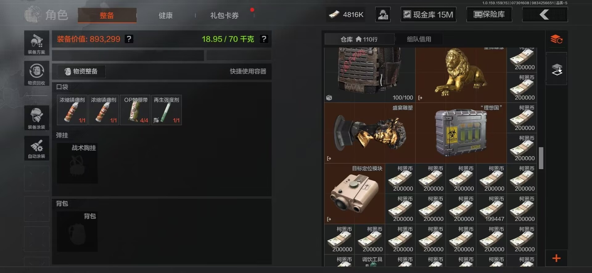 [10448168]暗区 可二次 欧皇摸金号 多大金 仓库价值53.7m 现金158万 火力倾泻·akm 竞技·aug 炎夏浪花·ar57 棱光裂变·ace31 火力倾泻·mp5 都市夜影套装 金狮雕像 盛宴雕塑 石中剑