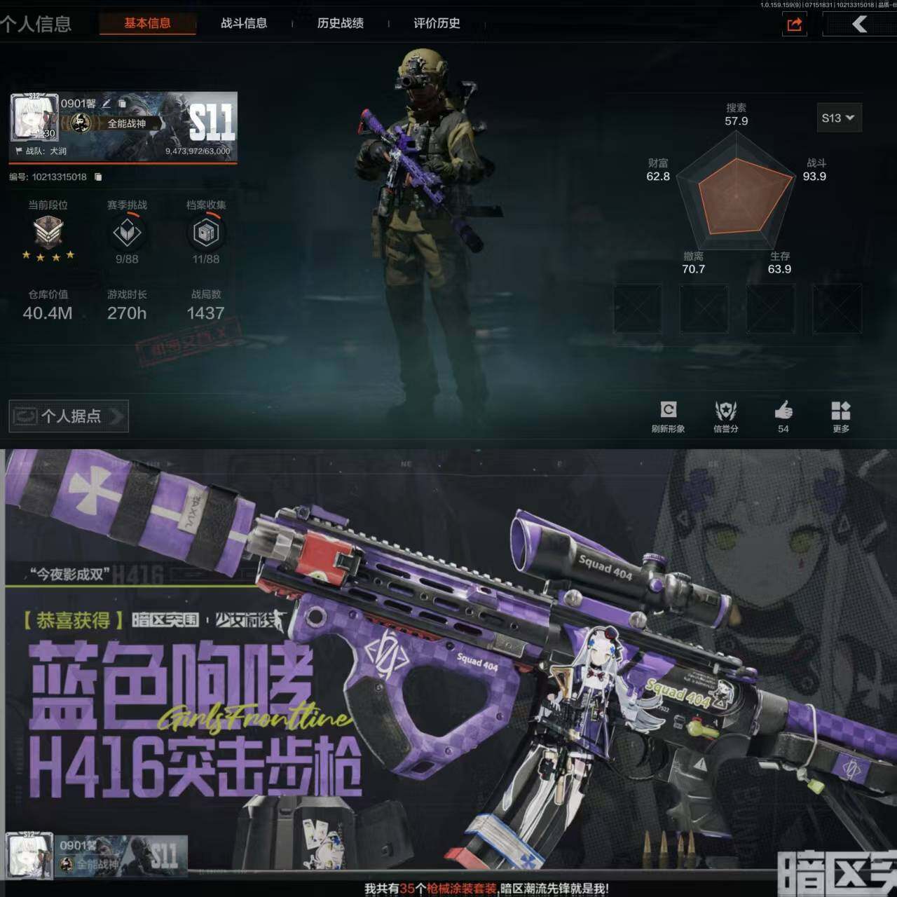 [9920588]暗区 可二次 欧皇号 多大金 机密文件 仓库价值42.9m 1金衣 1金刀 2金呛 钢铁壁垒作战服 盘牙·彻甲短刃 伸冤者迷踪·m4a1 银月·an94 1740万现金 15天6格保险体验卡 目标定位模块 花瓶 炎夏浪花·h416 火力倾泻·akm