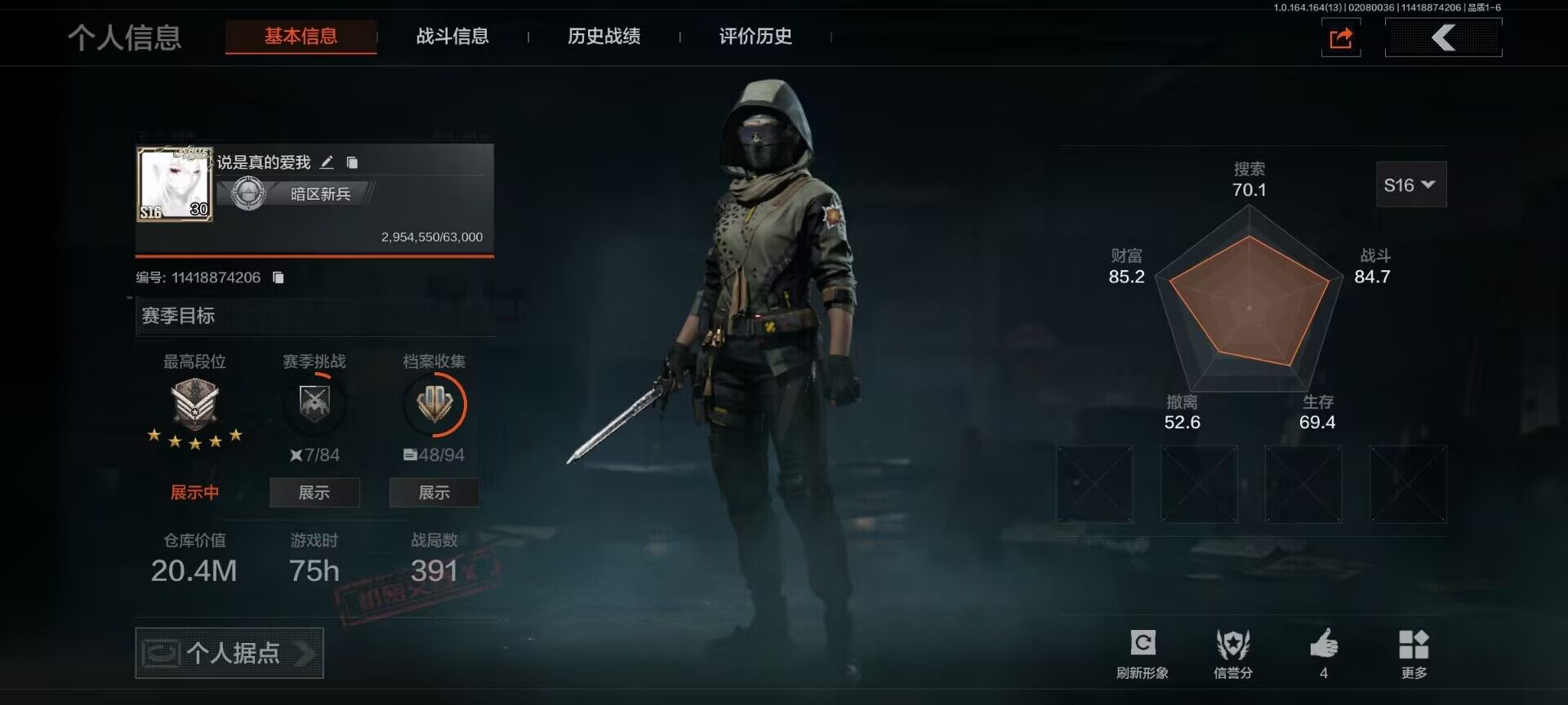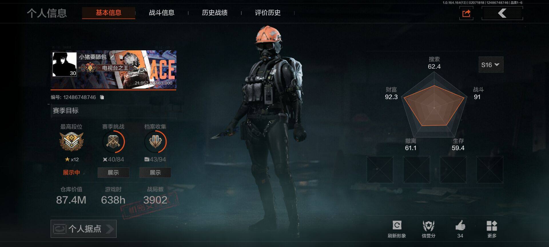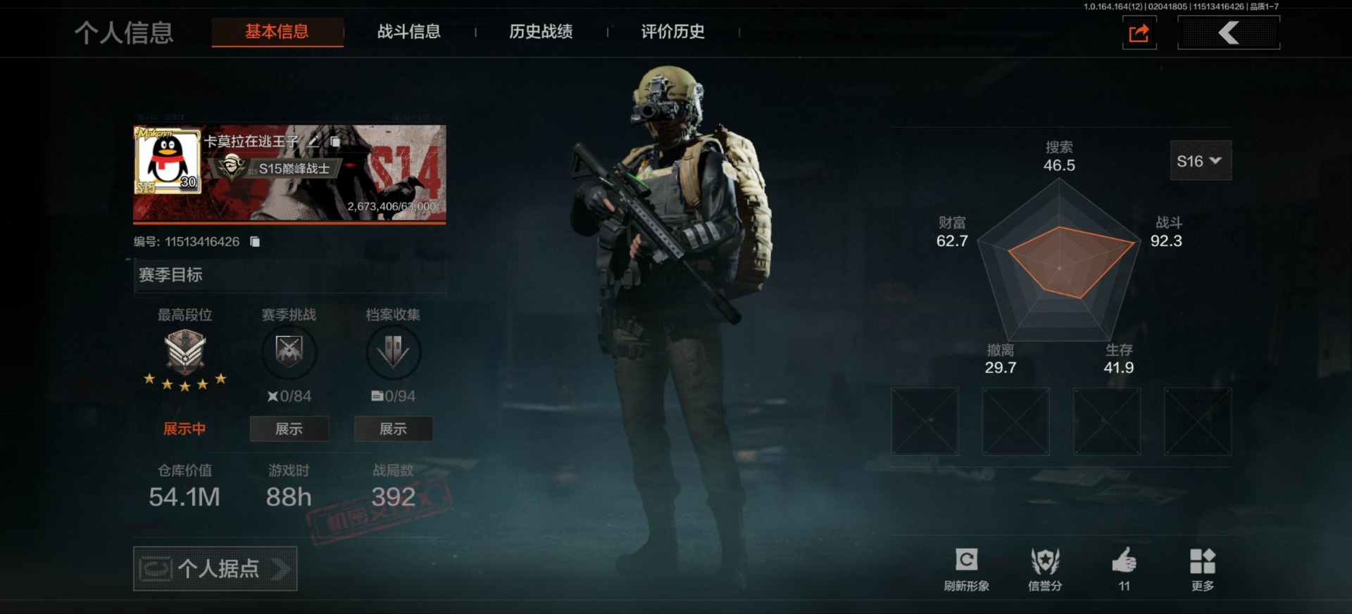 【aqzg1237】等级:30/段位:大师/仓库价值百万:20.4/柯恩币:273290000/百炼恒常/工兵铲/地脉深处fal/战术大师aek