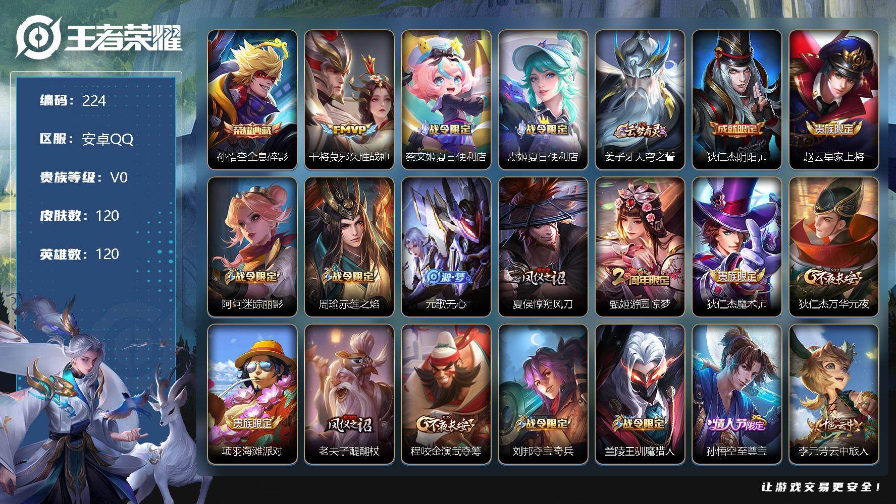 贵族3/皮肤212/典藏1/传说7/史诗69/英雄121/李白鸣剑曳影/孙尚香蔷薇恋人/嬴政优雅恋人/狄仁杰超时空战士/孙尚香末日机甲/干将莫邪久胜战神/关羽武圣/孙悟空零号赤焰/桑启鸣野蒿/云缨幻光神呛/蒙犽顽岩魄/蔡文姬夏日便利店/虞姬夏日便利店/姜子牙天穹之誓/狄仁杰阴阳师/赵云皇家上将/嬴政优雅恋人/嬴政白昼王子/孙尚香蔷薇恋人/庄周高山流水/高渐离死亡摇滚/阿轲迷踪丽影/芈月重明/芈月白晶晶/吕布猎兽之王/周瑜赤莲之焰/元歌云间偶戏/夏侯惇朔风刀/曹操烛龙/典韦穷奇/马可波罗暗影游猎/马可波罗山海玄木吟/狄仁杰魔术师/狄仁杰万华元夜/达摩沙漠行僧/项羽海滩派对/老夫子醍醐杖/关羽冰锋战神/关羽武圣/程咬金演武夺筹/刘邦夺宝奇兵/韩信飞衡/王昭君午后时光/兰陵王驯魔猎人/兰陵王金庭之子/亚瑟潮玩骑士王/孙悟空至尊宝/孙悟空大圣娶亲/孙悟空零号赤焰/牛魔御旌/李元芳银河之约/李元芳云中旅人/钟馗驱傩正仪/杨玉环遇见飞天/雅典娜单词大作战/雅典娜黎明之约/蔡文姬繁星吟游/鬼谷子原初探秘者/鬼谷子五谷丰年/苏烈千军破阵/百里玄策原初追逐者/弈星混沌棋/梦奇顽趣/沈梦溪星空之诺/沈梦溪大漠名商/明世隐疑决卦/裴擒虎李小龙/裴擒虎擒涛扼浪/狂铁御狮/狂铁电玩高手/米莱狄御霄/云中君纤云弄巧/盾山御銮/猪八戒西部大镖客/猪八戒猪悟能/上官婉儿梁祝/嫦娥暖冬兔眠/蒙犽狂想玩偶喵/鲁班大师探海日志/桑启海盐诗旅/暃星界游侠/艾琳流音漫舞/司空震地狱燃心/阿古朵江河有灵/张良古海寻踪/蒙恬荣光圣徽/鬼谷子天穹祈灯/刘邦剑破天穹/程咬金群星魔术团/周瑜熔金海岸/韩信飞衡/关羽武圣/马可波罗山海玄木吟/芈月重明/夏侯惇朔风刀/曹操烛龙/典韦穷奇/狄仁杰万华元夜/达摩沙漠行僧/老夫子醍醐杖/程咬金演武夺筹/兰陵王金庭之子/张良古海寻踪/牛魔御旌/李元芳云中旅人/钟馗驱傩正仪/雅典娜黎明之约/鬼谷子原初探秘者/苏烈千军破阵/百里玄策原初追逐者/弈星混沌棋/梦奇顽趣/沈梦溪大漠名商/明世隐疑决卦/裴擒虎擒涛扼浪/狂铁御狮/米莱狄御霄/盾山御銮/鲁班大师探海日志/桑启海盐诗旅/鬼谷子天穹祈灯/蒙恬荣光圣徽/刘邦剑破天穹/姜子牙天穹之誓/蔡文姬夏日便利店/虞姬夏日便利店/嬴政白昼王子/阿轲迷踪丽影/吕布猎兽之王/周瑜赤莲之焰/元歌云间偶戏/马可波罗暗影游猎/刘邦夺宝奇兵/王昭君午后时光/兰陵王驯魔猎人/艾琳流音漫舞/亚瑟潮玩骑士王/李元芳银河之约/雅典娜单词大作战/沈梦溪星空之诺/狂铁电玩高手/猪八戒西部大镖客/嫦娥暖冬兔眠/蒙犽狂想玩偶喵/司空震地狱燃心/暃星界游侠/鲁班七号电玩小子/项羽苍穹之光/露娜紫霞仙子/赵云皇家上将/赵云未来纪元/貂蝉圣诞恋歌/甄姬冰雪圆舞曲/王昭君偶像歌手/狄仁杰魔术师/廉颇地狱岩魂/宫本武藏鬼剑武藏/孙尚香蔷薇恋人/孙尚香水果甜心/嬴政优雅恋人/嬴政摇滚巨星/妲己魅力维加斯/妲己女仆咖啡/墨子金属风暴/吕布圣诞狂欢/李白千年之狐/吕布末日机甲/关羽冰锋战神/孙悟空至尊宝/花木兰水晶猎龙者/刘邦德古拉伯爵/夏侯惇乘风破浪/小乔缤纷独角兽/诸葛亮黄金分割率/雅典娜冰冠公主/百里守约特工魅影/铠曙光守护者/刘禅天才门将/李元芳逐浪之夏/程咬金功夫厨神/白起星夜王子/杨玉环遇见飞天/嬴政白昼王子/孙悟空大圣娶亲/狄仁杰鹰眼统帅/公孙离无限星赏官/兰陵王驯魔猎人/上官婉儿梁祝/蔡文姬繁星吟游/李元芳银河之约/韩信飞衡/阿轲迷踪丽影/马可波罗暗影游猎/蒙犽狂想玩偶喵/百里玄策原初追逐者/裴擒虎李小龙/云中君纤云弄巧/元歌云间偶戏/芈月白晶晶/百里玄策热力回旋/猪八戒猪悟能/庄周高山流水/雅典娜黎明之约/狂铁电玩高手/鬼谷子五谷丰年/梦奇顽趣/暃星界游侠/马可波罗山海玄木吟/刘禅电玩爆裂旋风/司空震地狱燃心/阿古朵江河有灵/蒙恬荣光圣徽/蔡文姬夏日便利店/蒙犽顽岩魄/牛魔星界战将/项羽海滩派对/韩信教廷特使/韩信街头霸王/露娜哥特玫瑰/达摩大发明家/赵云忍炎影/芈月红桃皇后/白起白色死神/牛魔西部大镖客/扁鹊化身博士/宫本武藏未来纪元/安琪拉玩偶对对碰/妲己少女阿狸/典韦黄金武士/亚瑟死亡骑士/达摩拳王/花木兰兔女郎/张飞五福同心/狄仁杰阴阳师/高渐离死亡摇滚/刘备汉昭烈帝/关羽龙腾万里/钟无艳海滩丽影/曹操烛龙/王昭君幻想奇妙夜/芈月重明/典韦穷奇/鬼谷子幻乐之宴/狂铁御狮/苏烈坚韧之力/米莱狄御霄/吕布猎兽之王/明世隐虹云星官/张良幽兰居士/牛魔御旌/小乔丁香结/吕布野性能量/盾山御銮/孙膑归虚梦演/沈梦溪鲨炮海盗猫/夏侯惇朔风刀/周瑜赤莲之焰/沈梦溪星空之诺/弈星混沌棋/哪吒次元突破/明世隐疑决卦/刘邦夺宝奇兵/盾山圆桌骑士/老夫子醍醐杖/猪八戒西部大镖客/廉颇无尽征程/鬼谷子原初探秘者/雅典娜单词大作战/狄仁杰万华元夜/亚瑟潮玩骑士王/杨戬次元傲视/露娜瓷语鉴心/程咬金演武夺筹/张良缤纷绘卷/钟馗驱傩正仪/鲁班大师乓乓大师/苏烈千军破阵/达摩沙漠行僧/兰陵王金庭之子/王昭君午后时光/沈梦溪大漠名商/李元芳云中旅人/桑启海盐诗旅/嫦娥暖冬兔眠/海月幻泉雾影/猪八戒潮玩探月行/牛魔牛运亨通/白起乐园追猎者/裴擒虎擒涛扼浪/莱西奥西部游侠/鲁班大师探海日志/姬小满零食大作战/艾琳流音漫舞/张良古海寻踪/亚连破局者/后羿完美运算/鬼谷子天穹