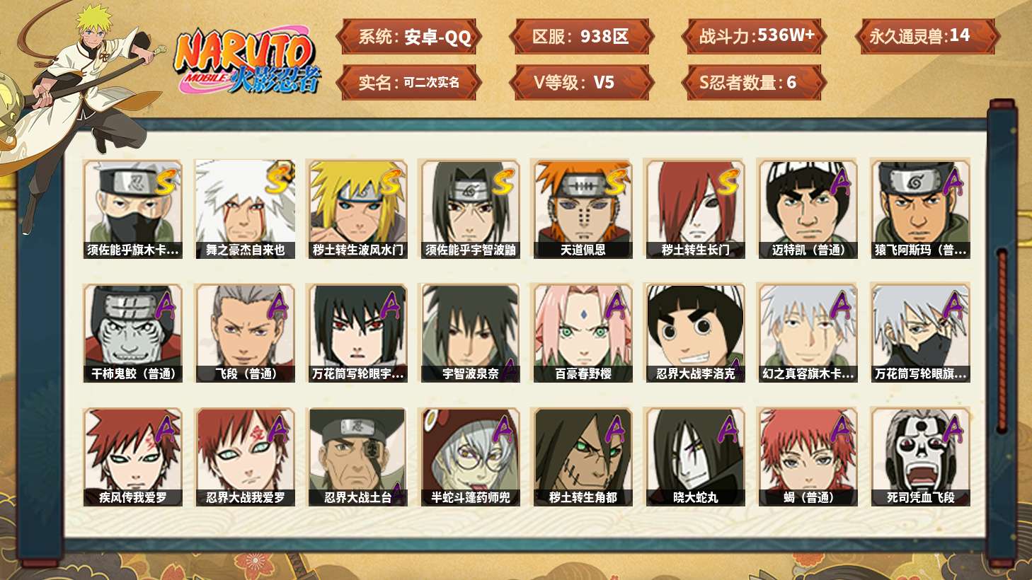 【24s忍者 44a忍者 20通灵】【安卓q-1023区-150级-v11-1235万战力】【s级】 鸣人暴怒六尾 永恒万花筒佐助 自来也 豪杰自来也 传说中的三忍自来也 大蛇丸 百豪纲手 纲手 波风水门 秽土水门 波风水门-九喇嘛连结 秽土日斩 秽土扉间 创立柱间 秽土斑 秽土解斑 须佐鼬 白面具 红夜带土 鬼灯幻月 秽土金银角 秽土无 佩恩 秽土长门 【a级】 凯 猿飞阿斯