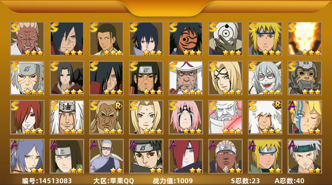 【14s忍者 35a忍者 14通灵】【安卓q-1020区-143级-v9-456万战力】【s级】 九喇嘛鸣人 永恒万花筒佐助 豪杰自来也 大蛇丸 波风水门 秽土水门 波风水门-九喇嘛连结 秽土日斩 秽土扉间 秽土解斑 须佐鼬 秽土鼬 忍战带土 佩恩 【a级】 猿飞阿斯玛 疾风我爱罗 飞段 九尾鸣人 鹰小队佐助 须佐佐助 宇智波泉奈 忍战丁次 忍战宁次 万花筒卡卡西 凯 凯-青春