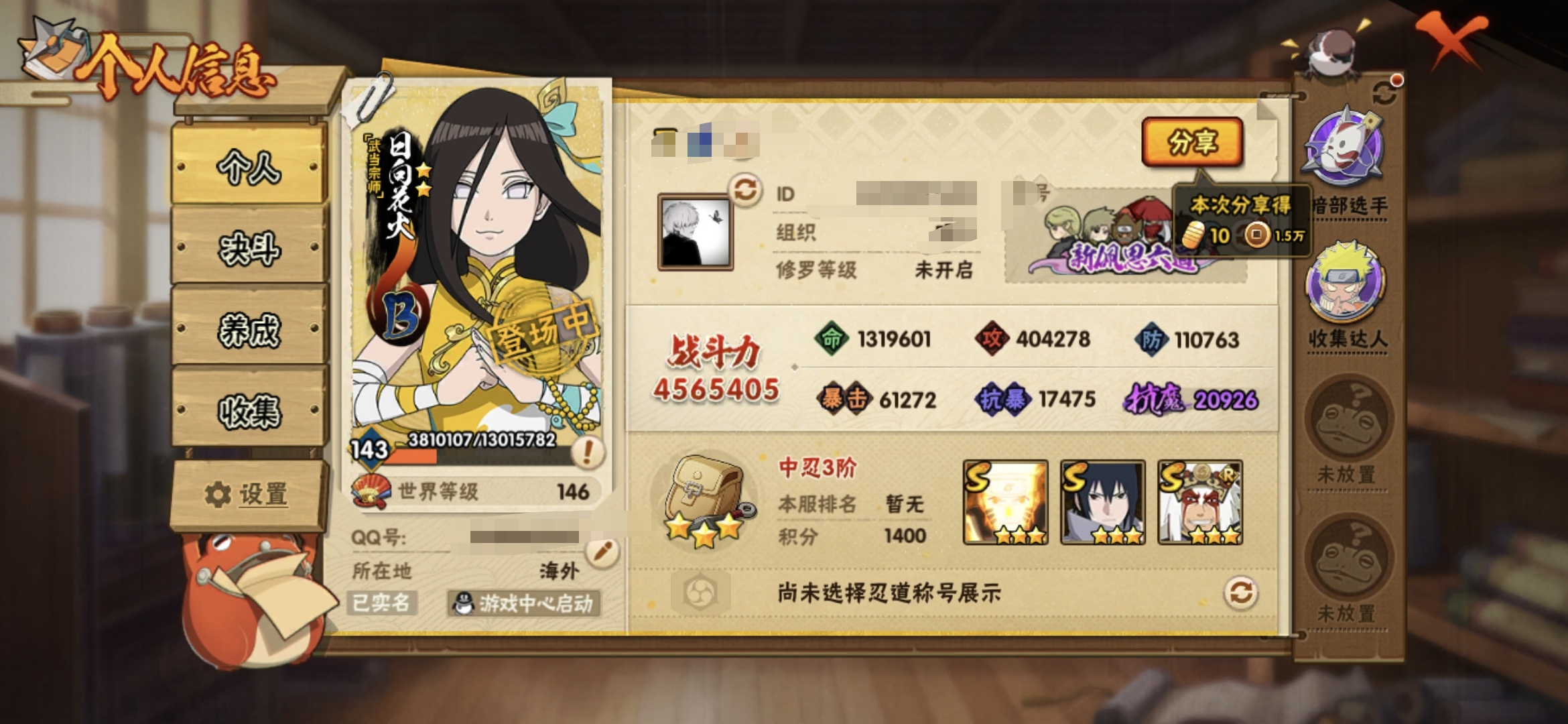 【火影忍者】【lyhy9113】战斗力:536w;段位:中忍1阶;本服排名:2220;vip:v5级;s忍:6个;a忍:19个;通灵兽:14个,s忍:须佐能乎旗木卡卡西|舞之豪杰自来也|秽土转生波风水门|须佐能乎宇智波鼬|天道佩恩|秽土转生长门__a忍:迈特凯(普通) 4星|猿飞阿斯玛(普通) 4星|干柿鬼鲛(普通) 3星|飞段(普通) 3星|万花筒写轮眼宇智波佐助|宇智波泉奈|百豪春野樱|忍界大战李洛克|幻之真容旗木卡卡西|万花筒写轮眼旗木卡卡西|疾风传我爱罗|忍界大战我爱罗|忍界大战土台|半蛇斗篷药师兜|秽土转生角都|晓大蛇丸|蝎(普通)|死司凭血飞段|桃式显现漩涡博人__通灵兽:忍犬(普通)|蓝蛇|蛤蟆吉|忍龟|镰鼬|猿魔|山椒鱼|蜃|蛤蟆仙人|鲛鲨|砂之守鹤|蛤蟆健|乌鸦(普通)|蛤蟆龙