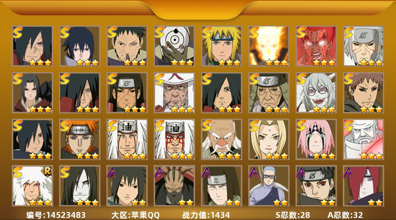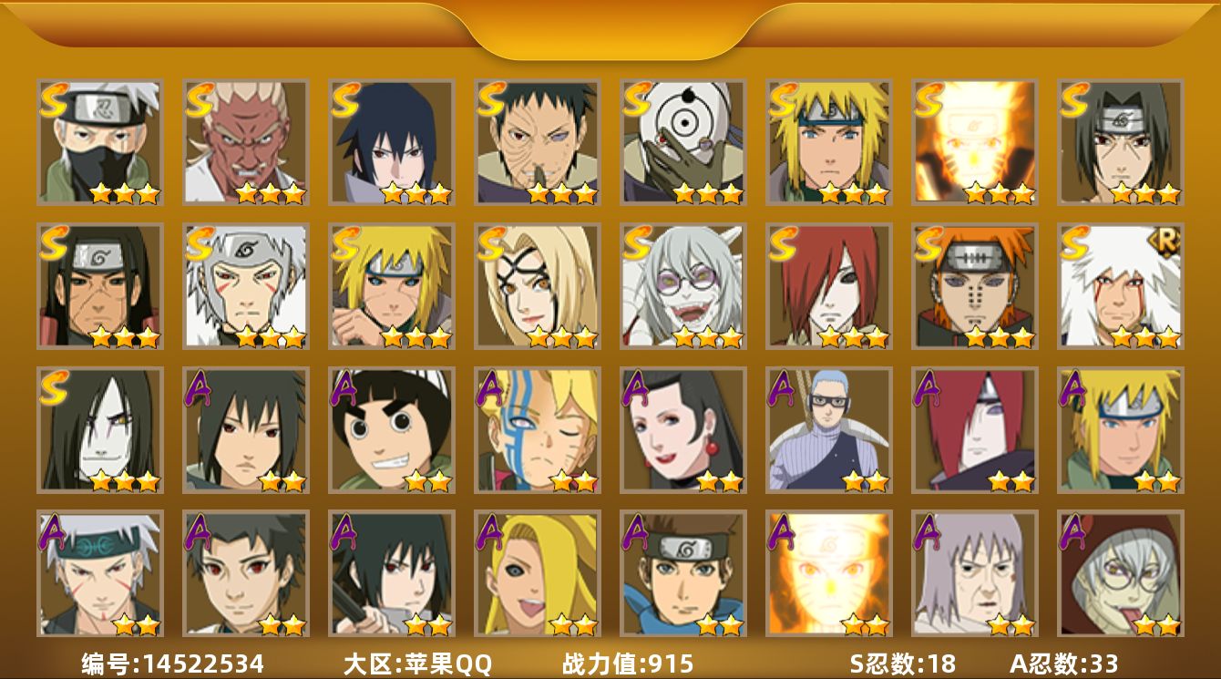ios/8s忍/18a忍/战力361w/v4/区服769 【s忍者】 宇智波带土「忍界大战」,自来也「舞之豪杰」,旗木卡卡西「须佐能乎」,自来也「传说中的三忍」,宇智波鼬「须佐能乎」,佩恩「天道」,波风水门,波风水门「九喇嘛连结」, 【a忍者】 漩涡博人「桃式显现」,李洛克「忍界大战」,蝎「绯流琥」,宇智波泉奈,神农「羁绊」,桃地再不斩「秽土转生」,不风,宇智波佐助「须佐能乎」,旗木卡卡西「忍界大