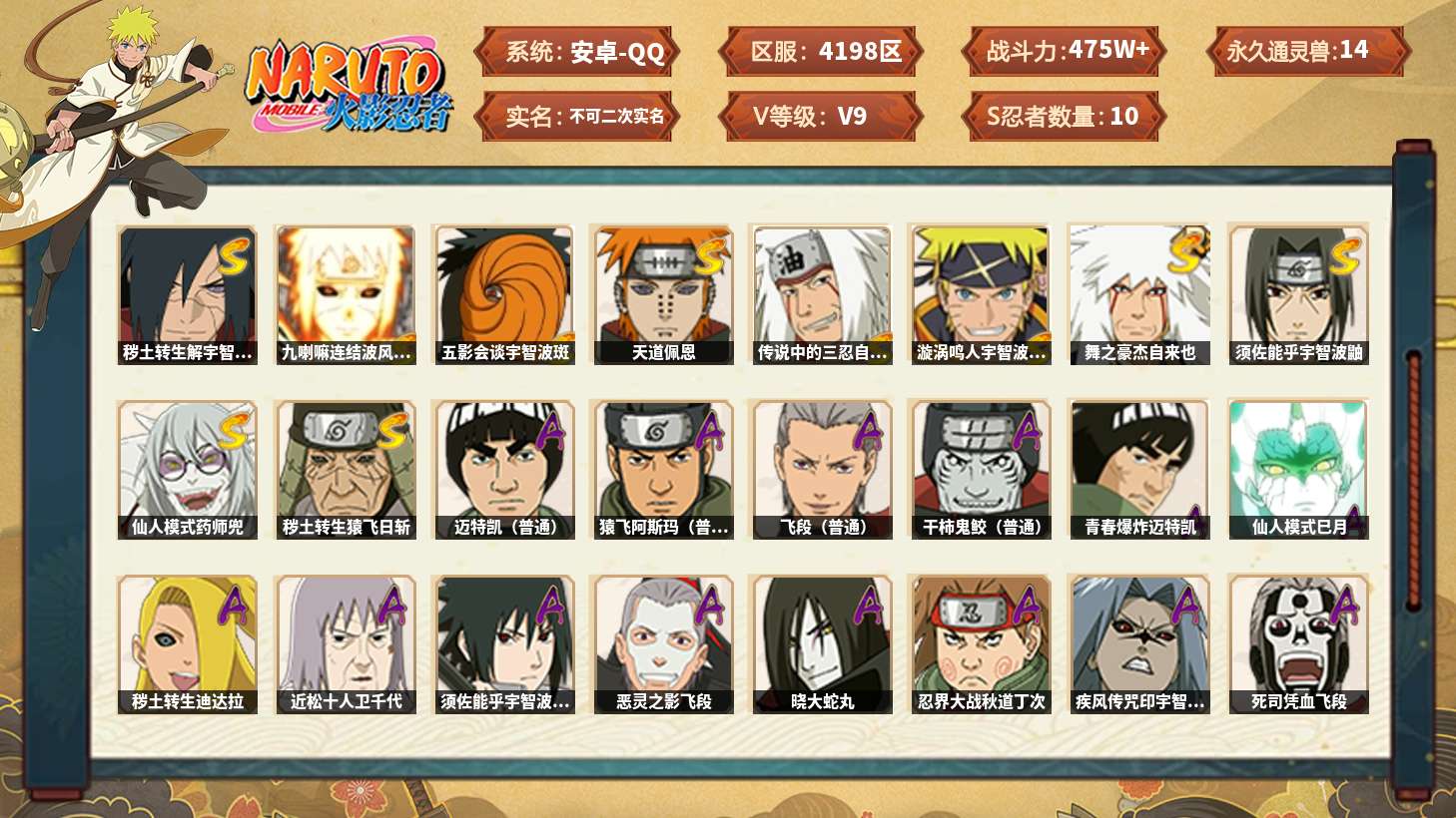 【火影忍者】【lyhy10691】战斗力:475w;段位:暗部2阶;本服排名:549;vip:v9级;s忍:10个;a忍:22个;通灵兽:14个,s忍:秽土转生解宇智波斑|九喇嘛连结波风水门|五影会谈宇智波斑|天道佩恩|传说中的三忍自来也|漩涡鸣人宇智波佐助|舞之豪杰自来也|须佐能乎宇智波鼬|仙人模式药师兜|秽土转生猿飞日斩__a忍:青春爆炸迈特凯|仙人模式巳月|秽土转生迪达拉|近松十人卫千代|须佐能乎宇智波佐助|恶灵之影飞段|晓大蛇丸|忍界大战秋道丁次|疾风传咒印宇智波佐助|死司凭血飞段|迪达拉(普通)|飞段(普通) 3星|迈特凯(普通) 4星|宇智波鼬(普通)|干柿鬼鲛(普通) 3星|蝎(普通)|猿飞阿斯玛(普通) 4星|六代目水影长十郎|不动|宇智波泉奈|忍界大战土台|初始形态机械鸣人__通灵兽:忍犬(普通)|蓝蛇|蛤蟆吉|忍龟|镰鼬|猿魔|山椒鱼|蜃|蛤蟆仙人|鲛鲨|蛤蟆健|乌鸦(普通)|砂之守鹤|蛞蝓(普通)