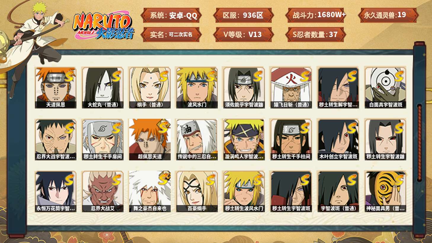 【天道超】【s忍者38 a忍者64 通灵25】【安卓q-510区-152级-v13-1674万战力】【s级】大野木「三代目土影」 金角银角「秽土转生」 漩涡鸣人·宇智波佐助 长门「秽土转生」 艾「三代目雷影」 鬼灯幻月「二代目水影」 迈特凯「死门」 艾「忍界大战」 宇智波斑「白面具」 宇智波带土「忍界大战」 宇智波鼬「秽土转生」 佩恩·天道「超」 宇智波斑 大蛇丸 药师兜「仙人模式」 漩涡鸣人「九