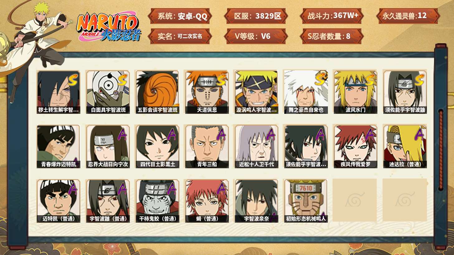 【火影忍者】【lyhy10703】战斗力:367w;段位:上忍2阶;本服排名:2707;vip:v6级;s忍:8个;a忍:14个;通灵兽:12个,s忍:秽土转生解宇智波斑|白面具宇智波斑|五影会谈宇智波斑|天道佩恩|漩涡鸣人宇智波佐助|舞之豪杰自来也|波风水门|须佐能乎宇智波鼬__a忍:青春爆炸迈特凯|忍界大战日向宁次|四代目土影黑土|青年三船|近松十人卫千代|须佐能乎宇智波佐助|疾风传我爱罗|迪达拉(普通)|迈特凯(普通)|宇智波鼬(普通)|干柿鬼鲛(普通)|蝎(普通)|宇智波泉奈|初始形态机械鸣人__通灵兽:忍犬(普通)|蓝蛇|蛤蟆吉|忍龟|镰鼬|猿魔|砂之守鹤|山椒鱼|蜃|蛤蟆仙人|鲛鲨|蛤蟆健