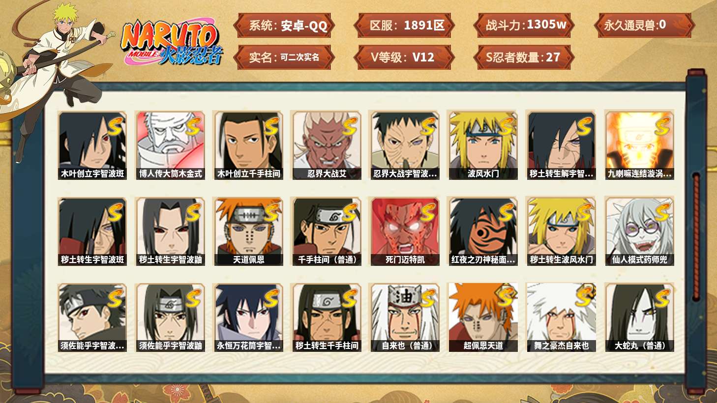 【区服】2682【等级】138【s级数量】9【a级数量】19【b级数量】31【c级数量】43 【通灵】 砂之守鹤 忍犬 蓝蛇 蛤蟆吉 忍龟 镰鼬 猿魔 山椒鱼 蜃 蛤蟆仙人 鲛鲨 蛤蟆健 乌鸦 【s级】宇智波佐助「永恒万花筒」 迈特凯「死门」 自来也「舞之豪杰」 宇智波鼬「须佐能乎」 波风水门 漩涡鸣人·宇智波佐助 佩恩「天道」 大蛇丸 宇智波斑「五影会谈」 【a级】蝎 宇智波佐助「须佐能乎」